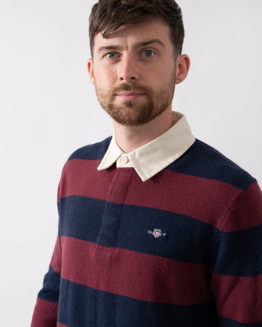Vendor:GANT Mens Extrafine Lambswool Striped Long Sleeve Polo - 410 Marine - 410 MarineGANT