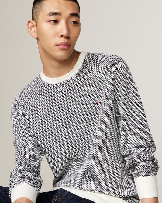 Pima Cotton Cashmere Herringbone Mens Crew Jumper - Desert Sky/Ivory Petal
