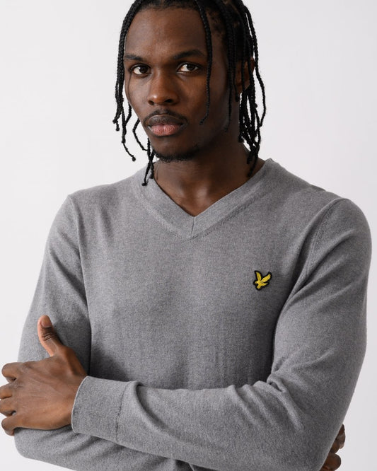 Cotton Merino Mens V-Neck Jumper - T28 Mid Grey Marl