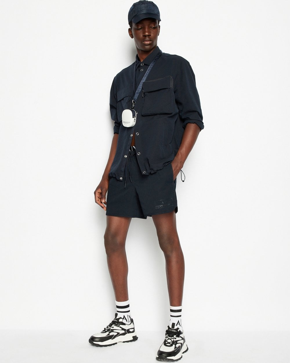 Enriched by a sophisticated tone-on-tone customization, the nylon seersucker button up shirt is characterized by a boxy fit. It has a slightly rounded bottom and a small French collar.