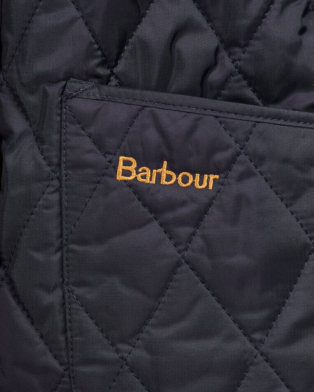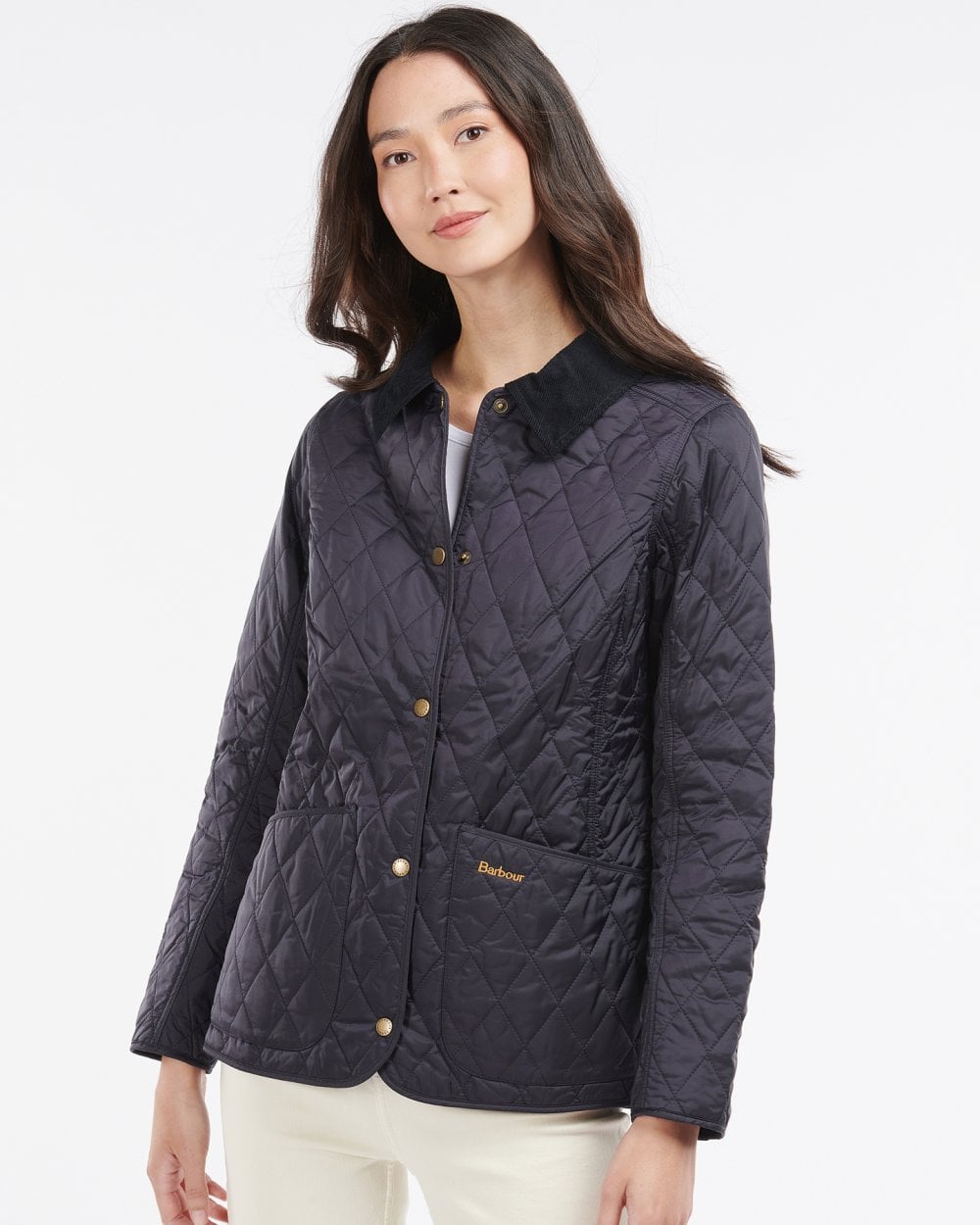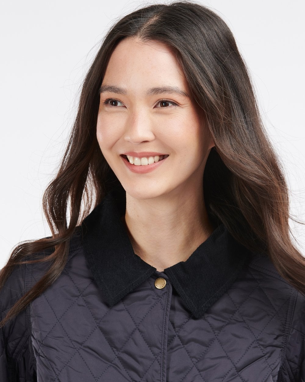 This stylish women's quilted jacket is designed with flatteringly shaped body seams for a beautifully feminine silhouette. The sit-down cord collar and diamond-quilted outer creates the signature Barbour look.