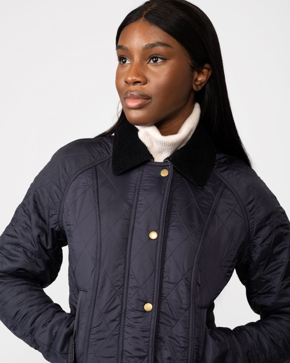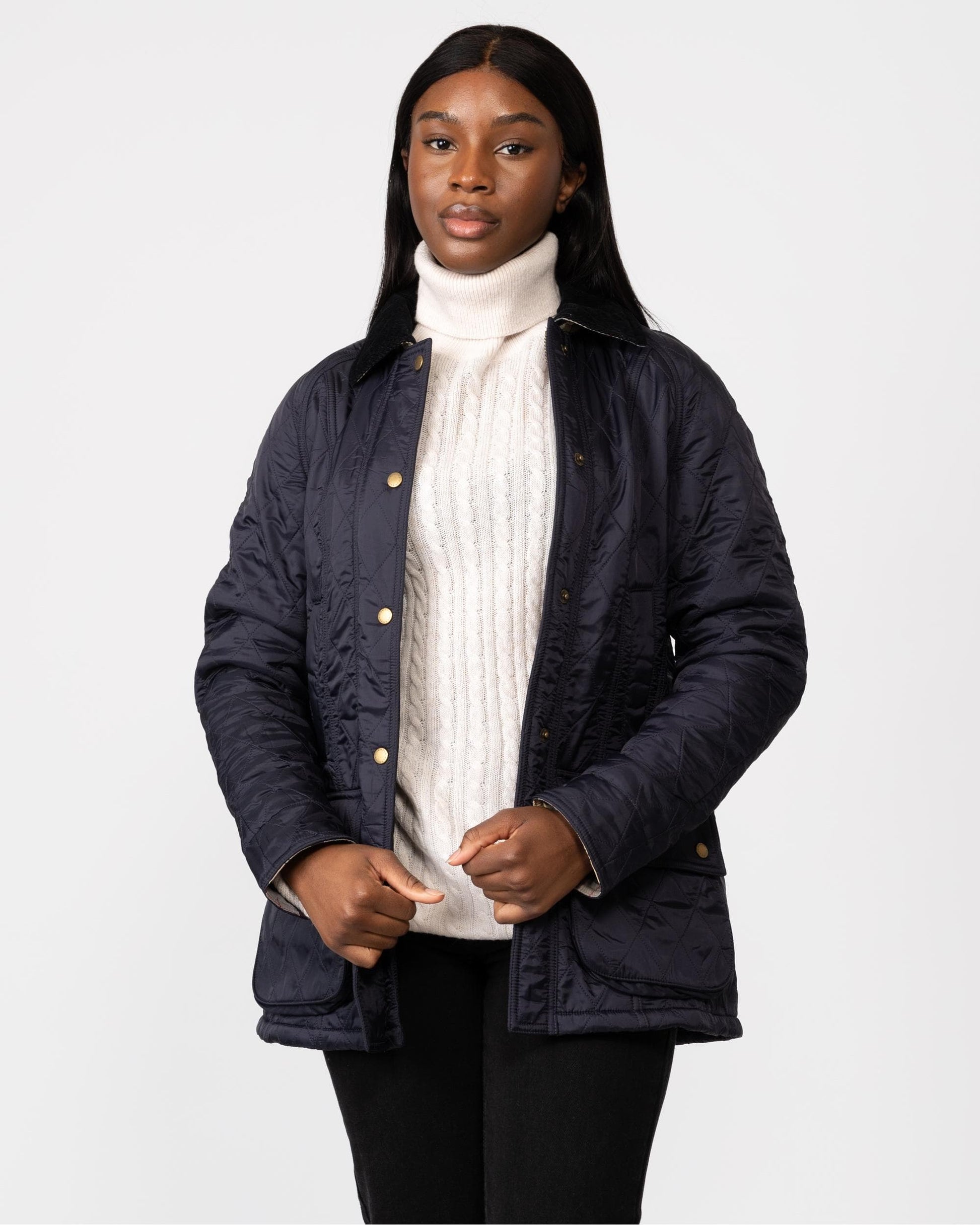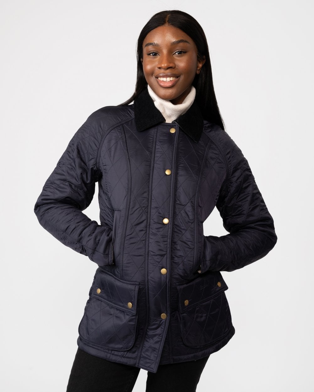 With styling based on the iconic Barbour Beadnell, this luxuriously warm jacket is constructed with a diamond-quilted outer and a super-soft fleece lining. Handwarmer pockets add extra winter practicality, while a contrast cord collar completes the signature look.
