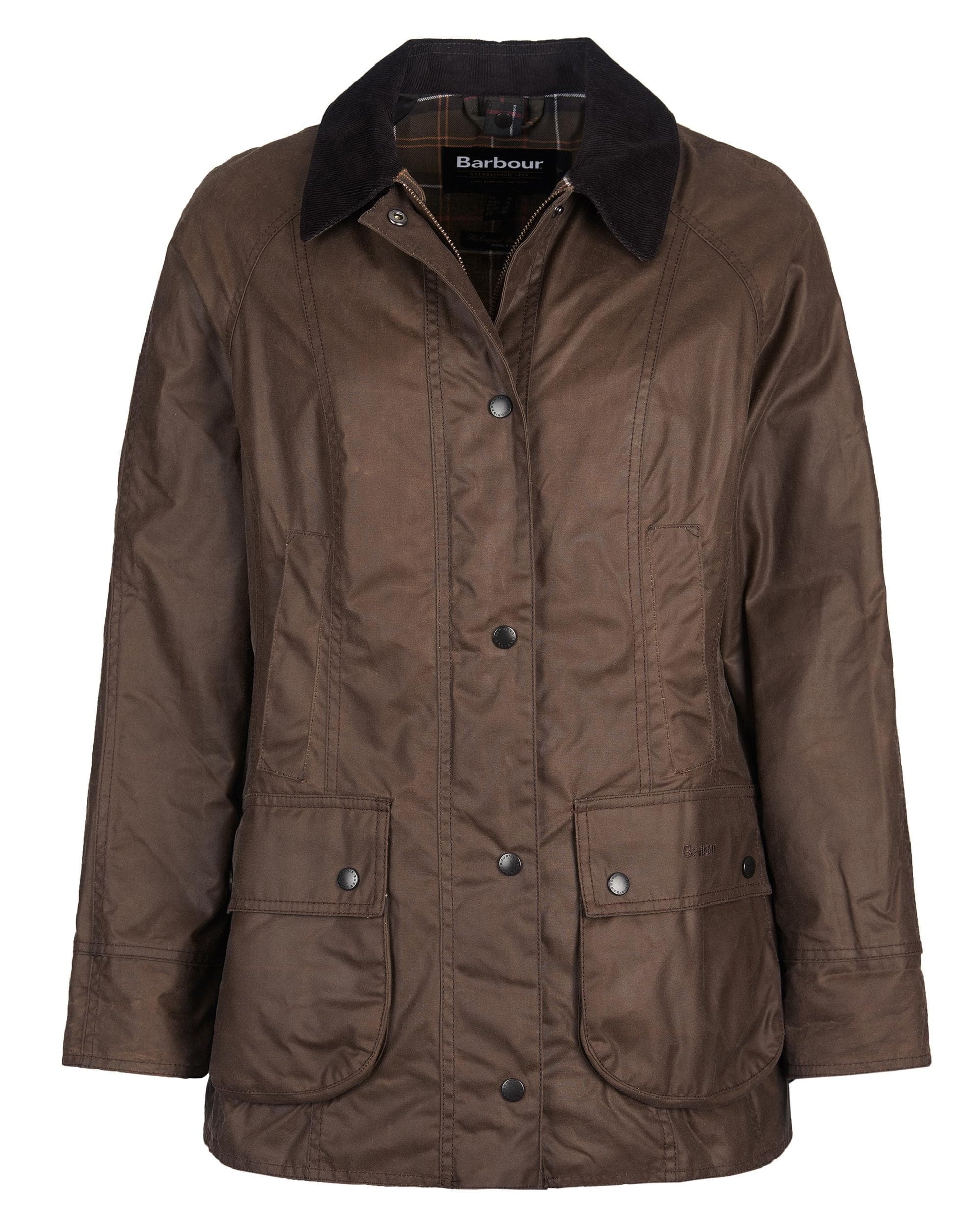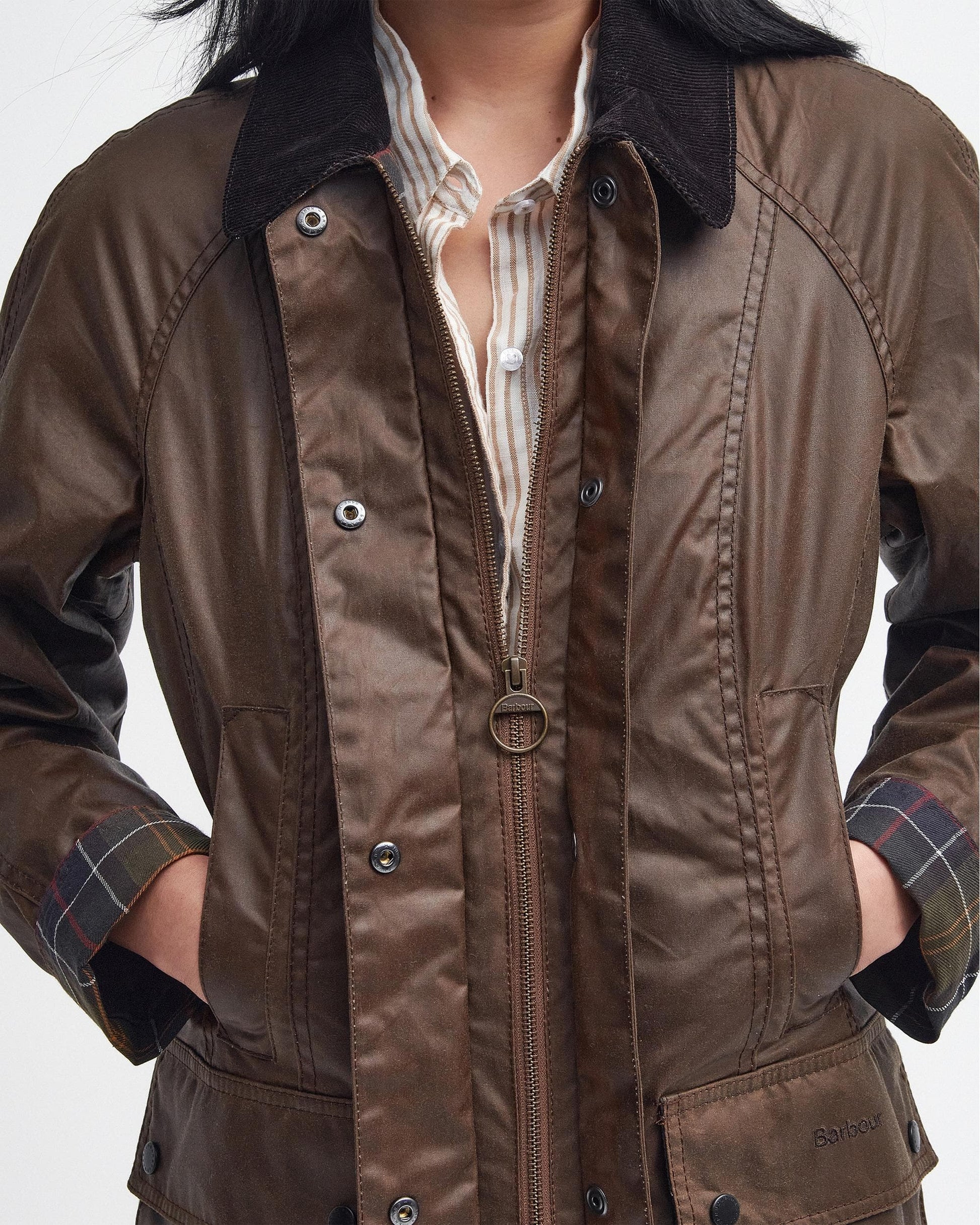 Based on the legendary Bedale but cut to a flattering, feminine silhouette, the Barbour Beadnell Wax Jacket is an iconic style crafted in traditional Thornproof waxed cotton. Boasting a sit-down corduroy collar, classic tartan lining and a wealth of pockets for all your storage needs, several enhancement options are available, including a zip-in liner and a hood, making the Beadnell a versatile, all-season jacket.