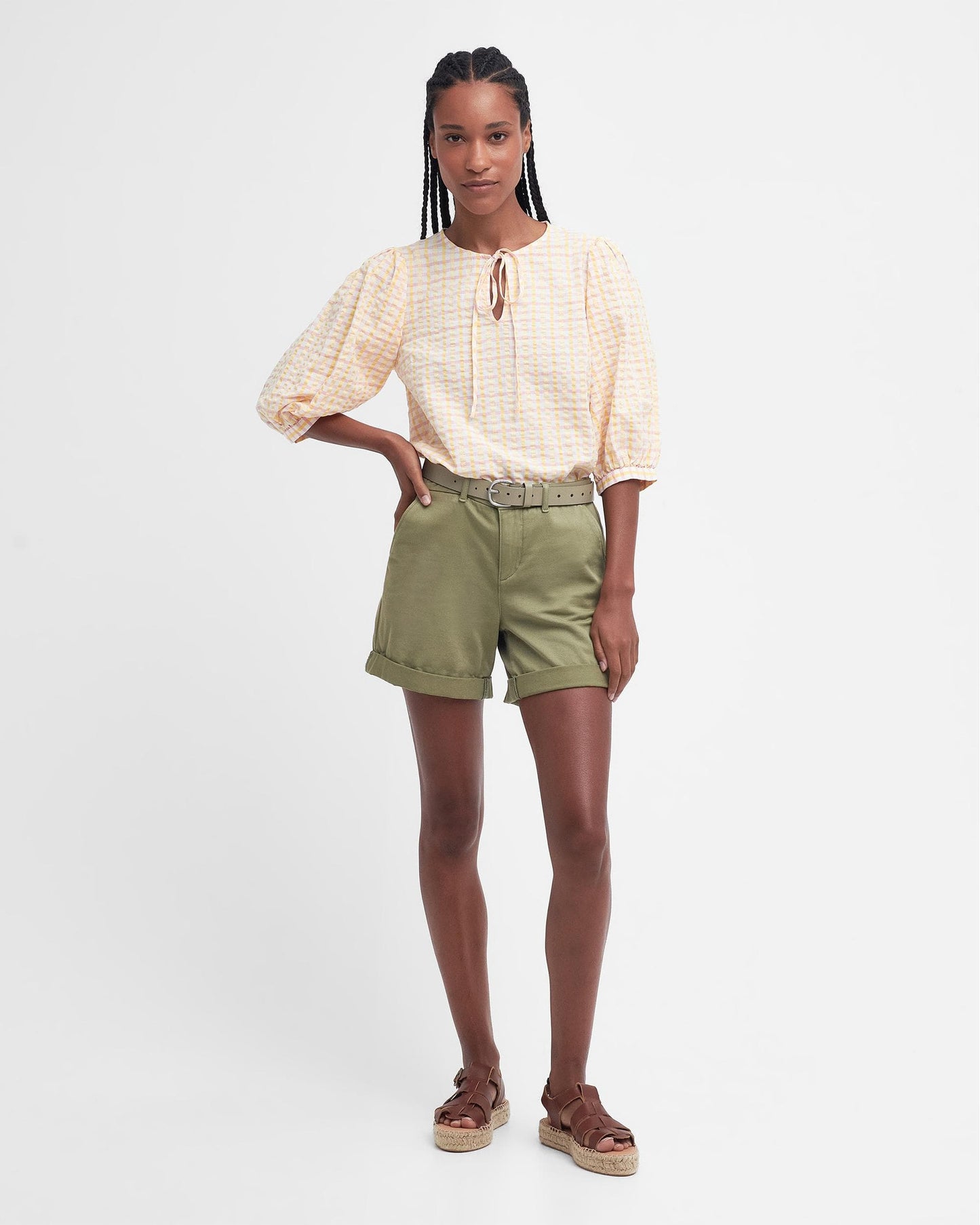 If you're looking for an alternative to your trusty T-shirts this summer, the Barbour Belmont Seersucker Blouse is the perfect choice. Featuring a pastel gingham print, it's complemented by a sweet neck-tie and puff sleeves with imitation mother-of-pearl for an elegant finishing touch.