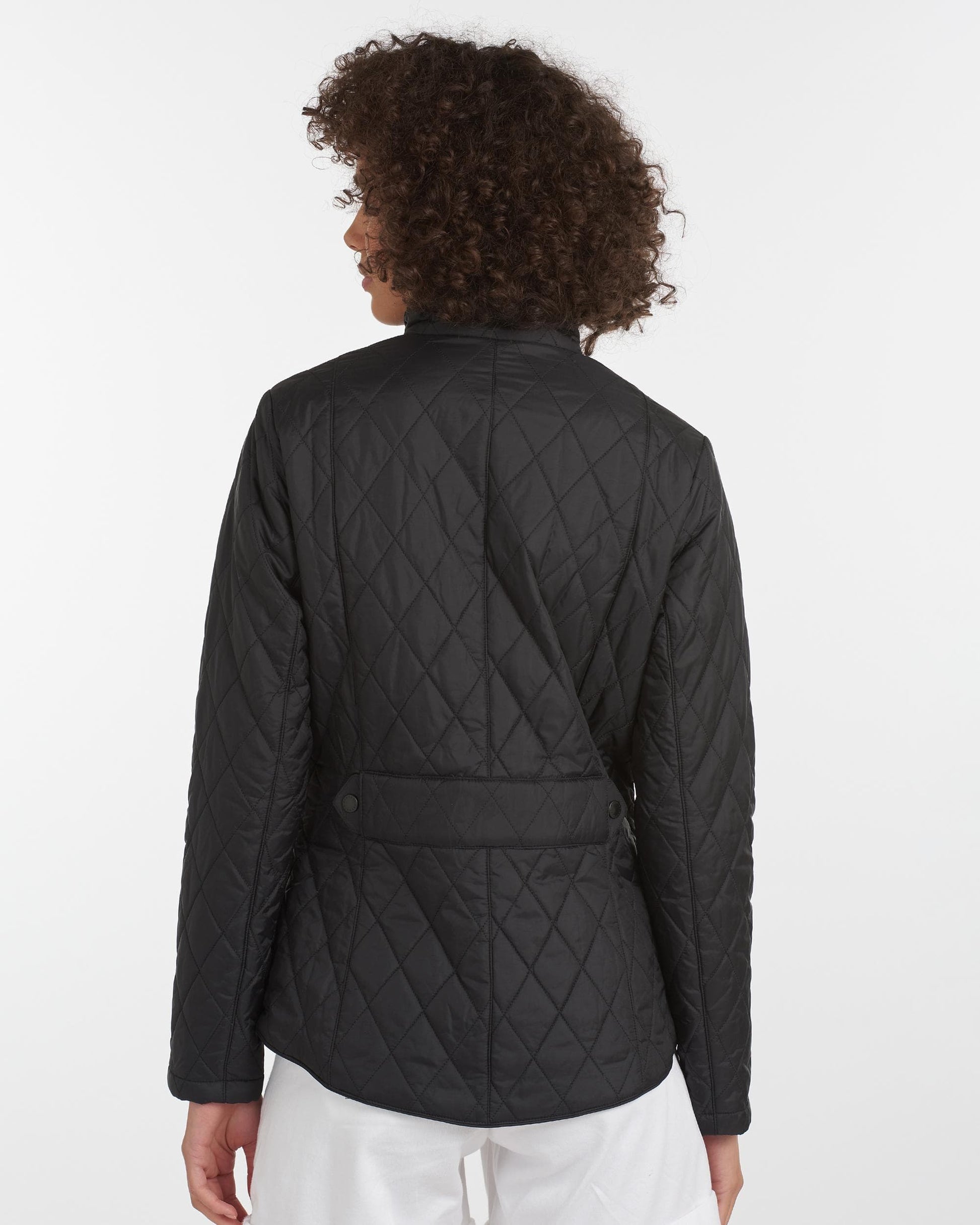 The Barbour Flyweight Cavalry Quilted Jacket is a diamond-quilted design with a flattering curved back hem and angled pocket flaps. Styled with a funnel collar, it offers a classic fit and features a studded and elasticated back belt for a smart finish with unrestricted movement.