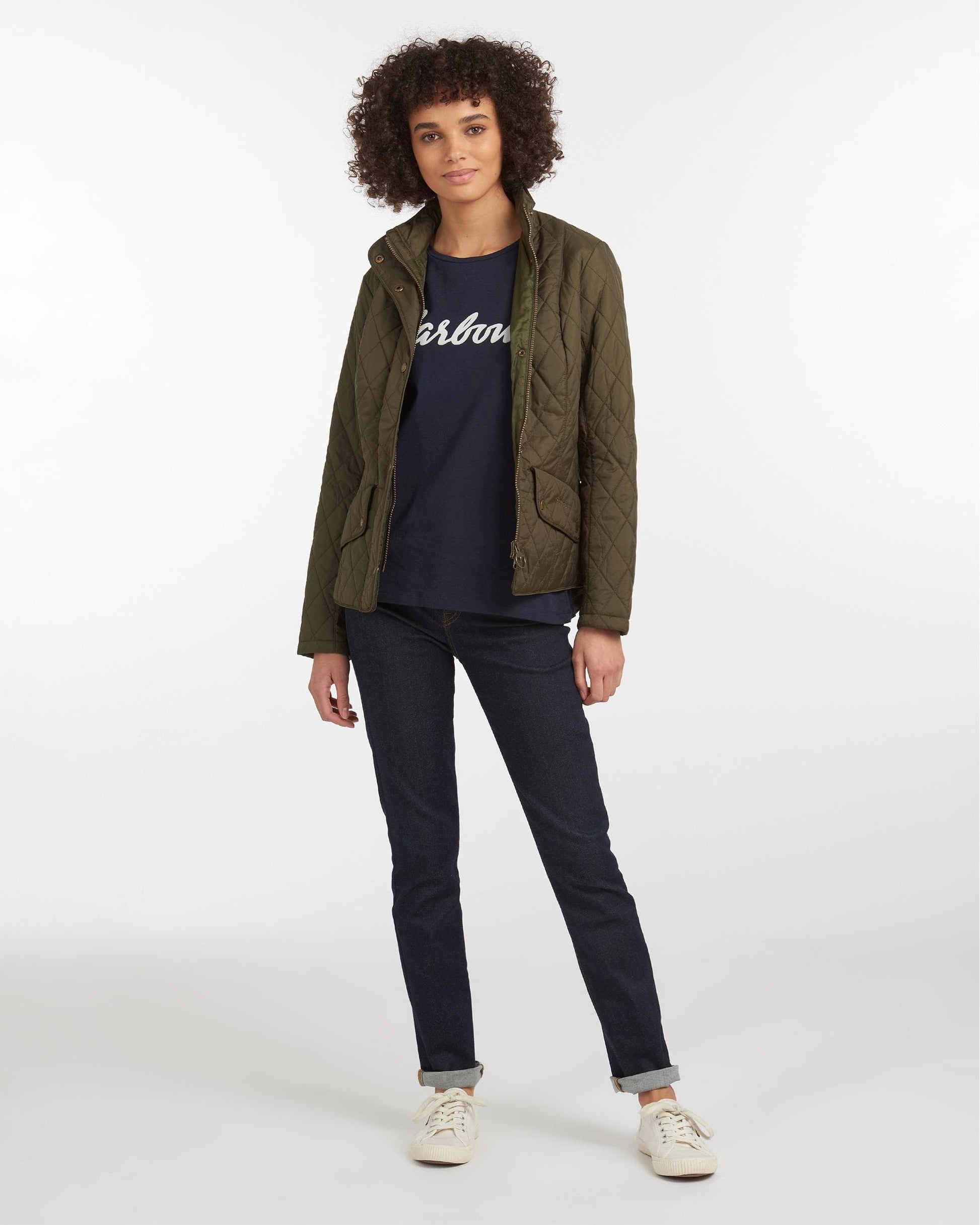The Barbour Flyweight Cavalry Quilted Jacket is a diamond-quilted design with a flattering curved back hem and angled pocket flaps. Styled with a funnel collar, it offers a classic fit and features a studded and elasticated back belt for a smart finish with unrestricted movement.
