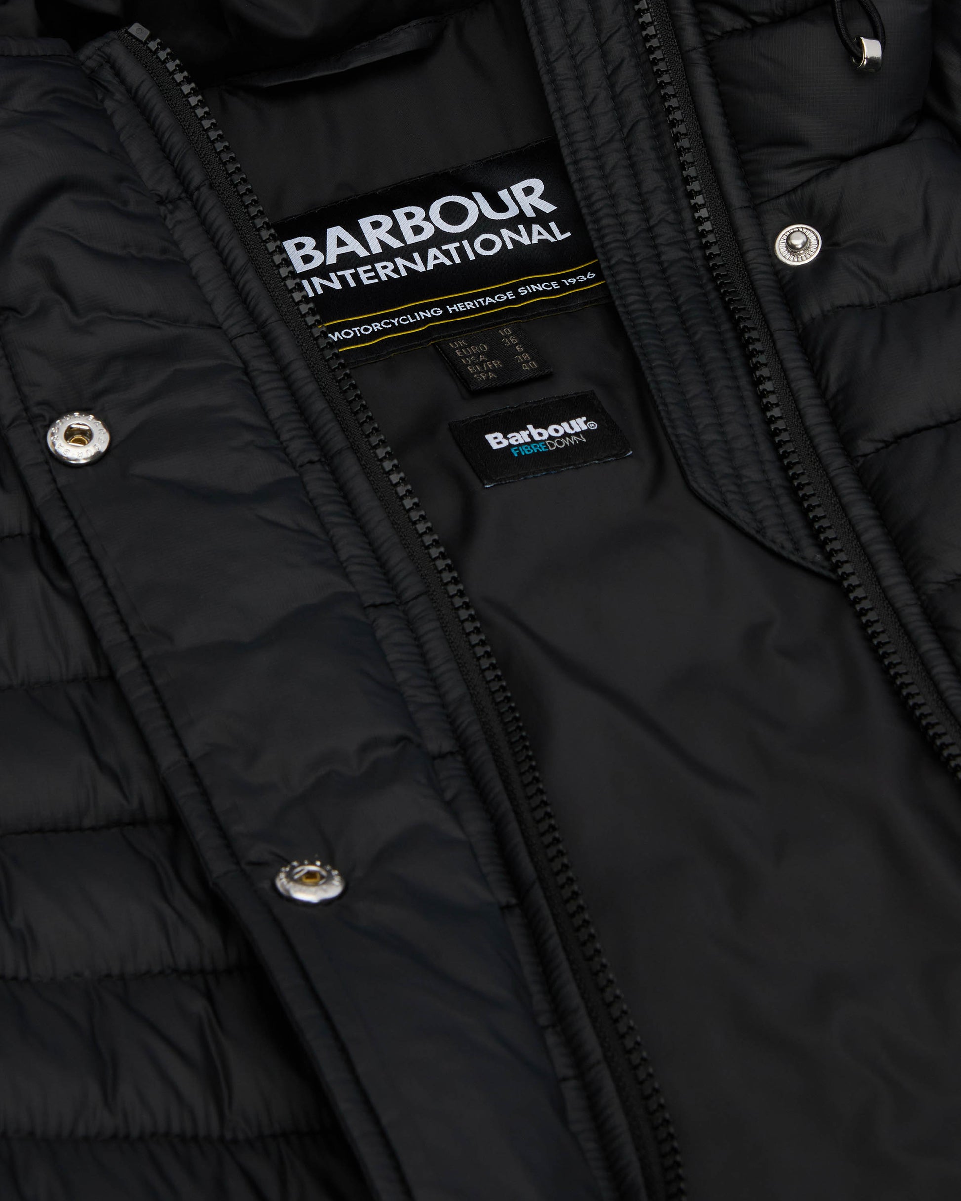 The B.Intl Jada Puffer Jacket brings modern style to cold-weather dressing with its slim-fit baffle quilting in lightweight micro ripstop. A seatbelt-style buckle belt cinches the waist for a flattering silhouette, while the dipped back hem offers extra coverage. Finished with signature Barbour International branding on the sleeve for a distinctive touch. LQU1880BK11