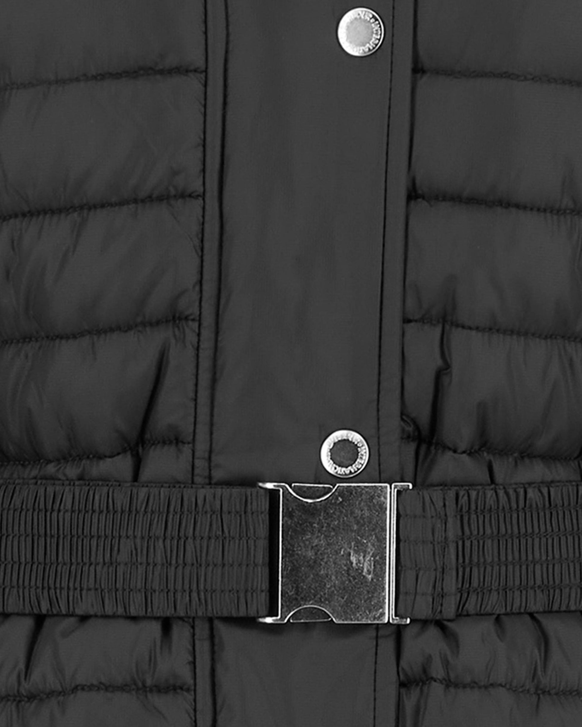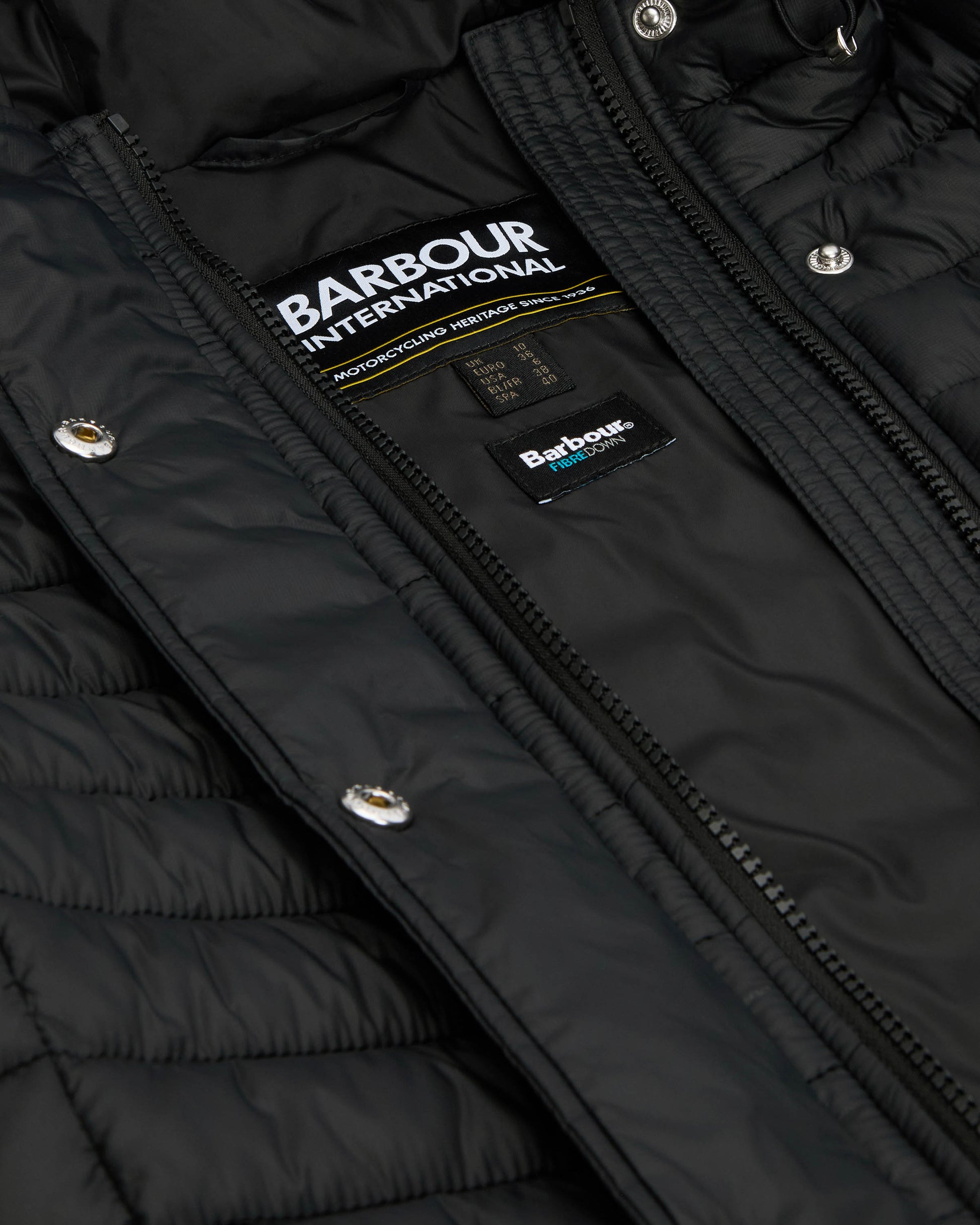 The B.Intl Longline Jada Puffer Jacket offers sleek cold-weather style with its slim-fit, longline baffle quilting in lightweight micro ripstop. A seatbelt-style buckle belt cinches the waist for a flattering shape, while the dipped back hem adds extra coverage. Finished with Barbour International branding on the sleeve for a refined, signature touch. LQU1878BK11