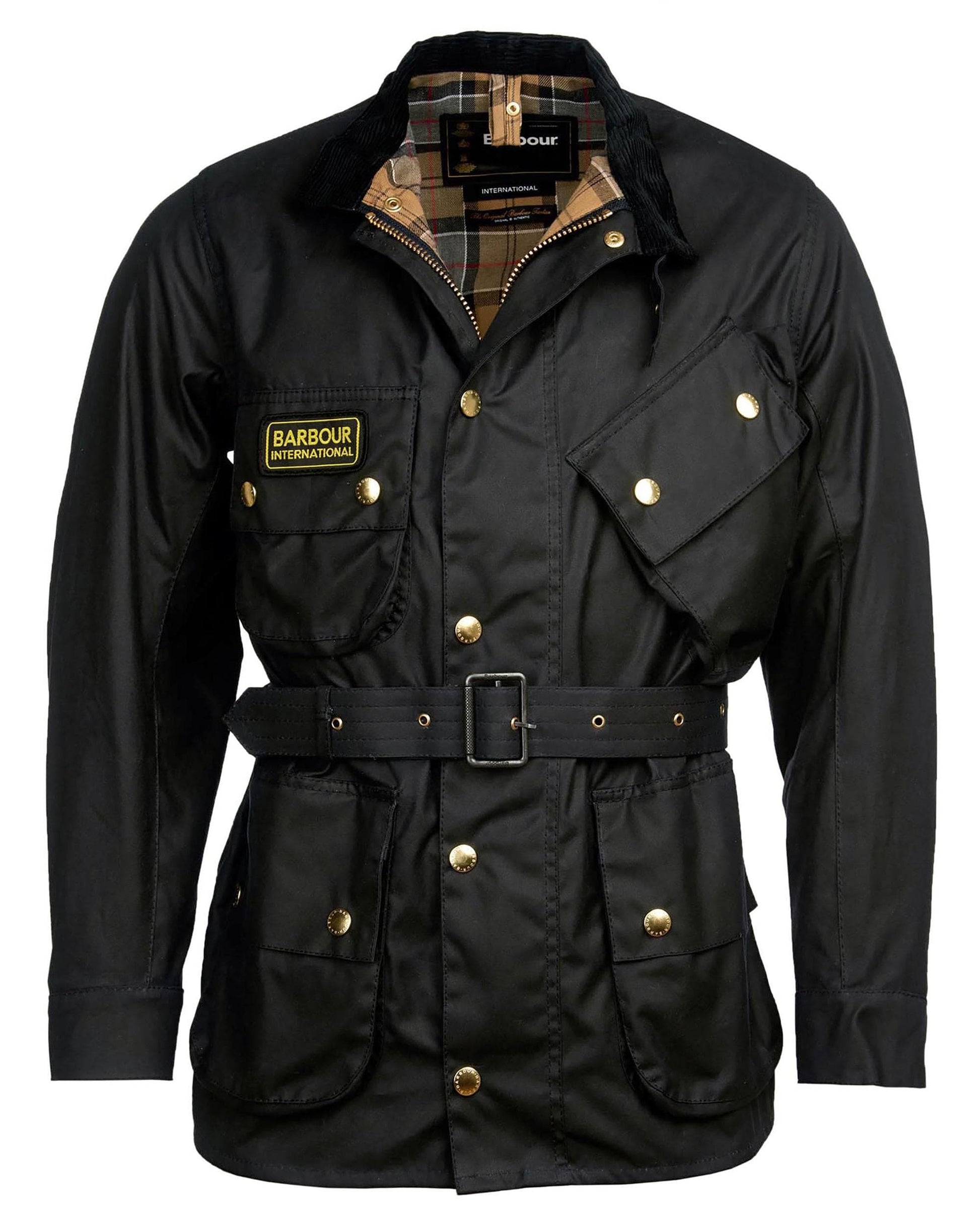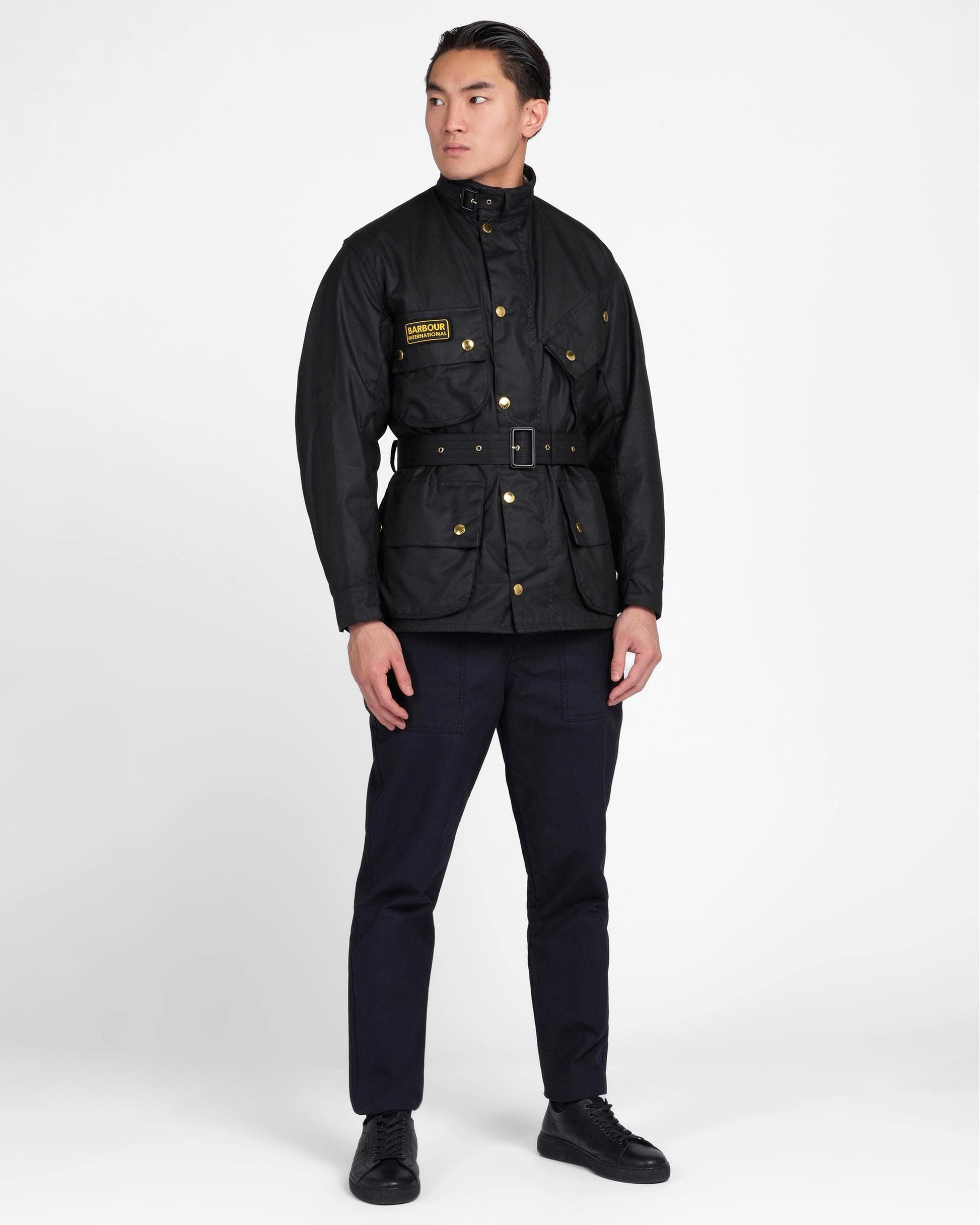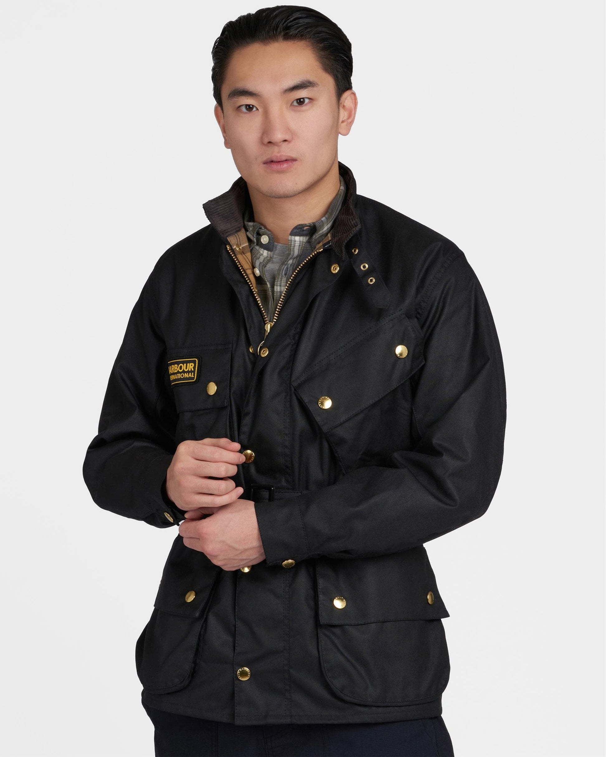 Barbour's iconic motorcycle jacket, the International, was created in 1936 and became the biker jacket of choice through the 50s, 60s and 70s. Staying true to that heritage, the International Original is constructed in a heavyweight 8oz Sylkoil waxed cotton, offering a stylish matte finish and road-ready protection. Its robust front zip sits beneath a stud-fastening storm fly front, and the funnel collar is lined with corduroy for insulation and a luxurious feel against the skin. The lightweight cotton lining carries the signature Barbour tartan and is studded to take the optional Warm Pile Lining, for added versatility. Traditional biker jacket details include the buckle-fastening throat strap, adjustable studded cuffs, a stiffened waist belt and the trademark four studded pockets, one of which is the authentic slanted map pocket, designed to give easy access while riding. Part of the World Tour collection, the International Original is available in classic Black with the famous Barbour International logo to the chest.