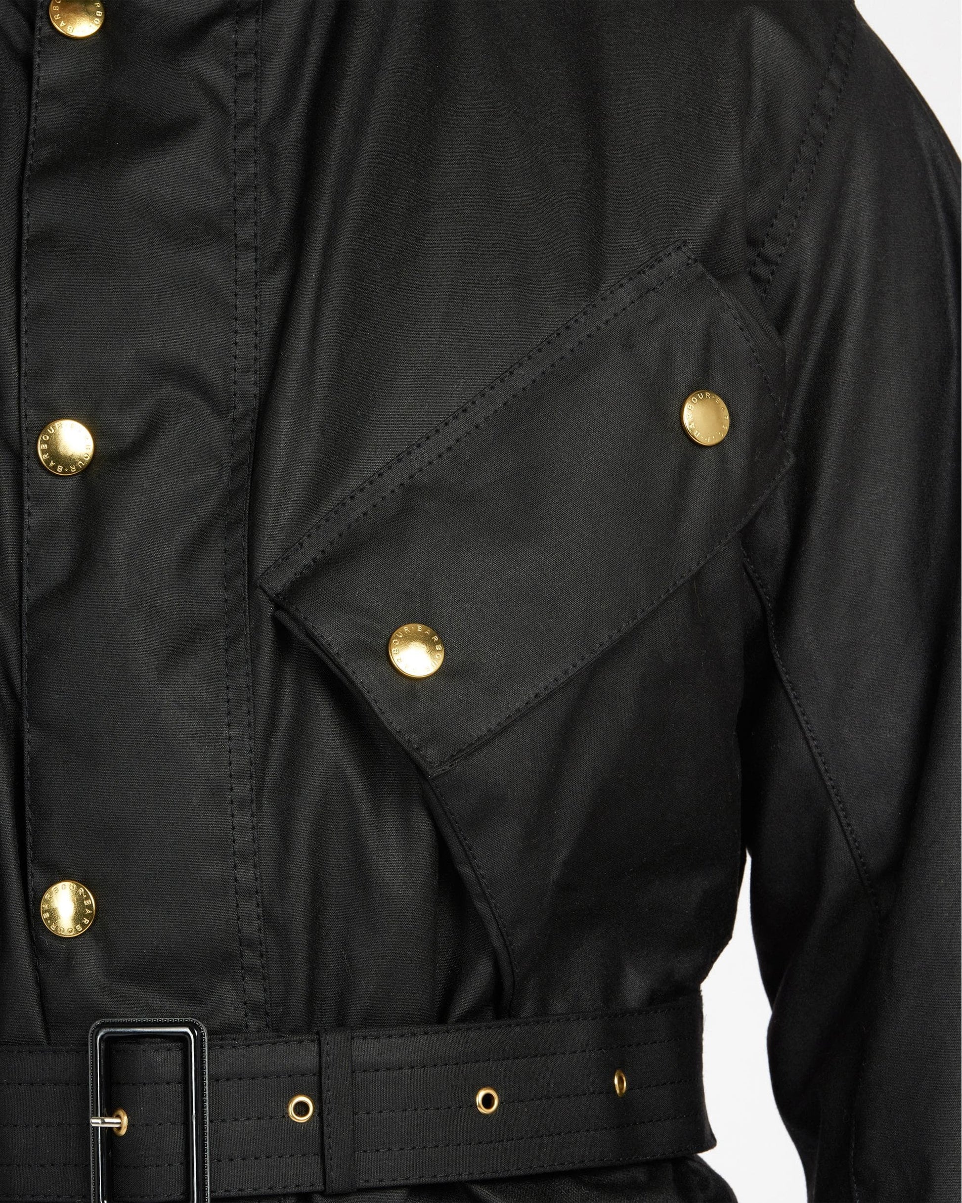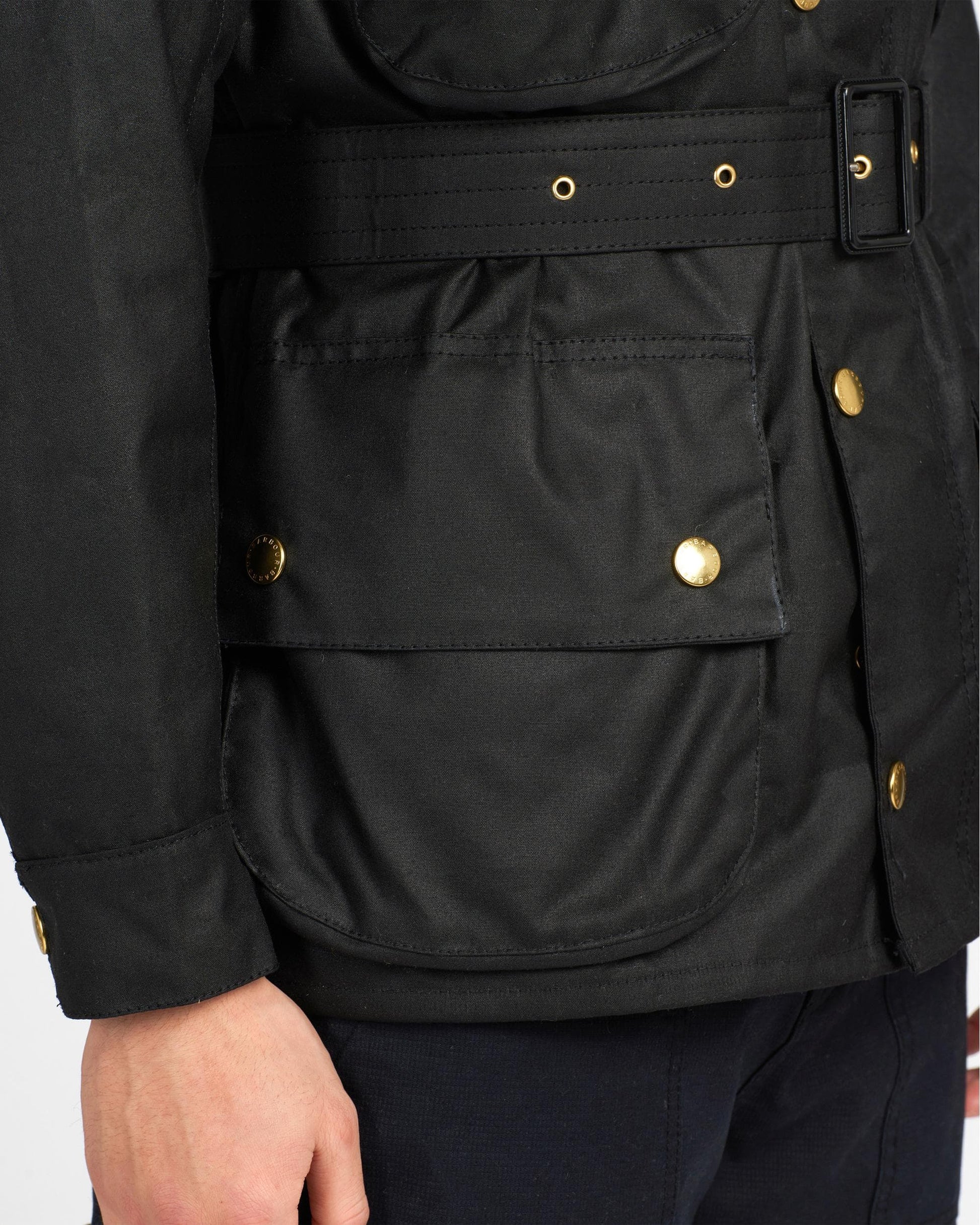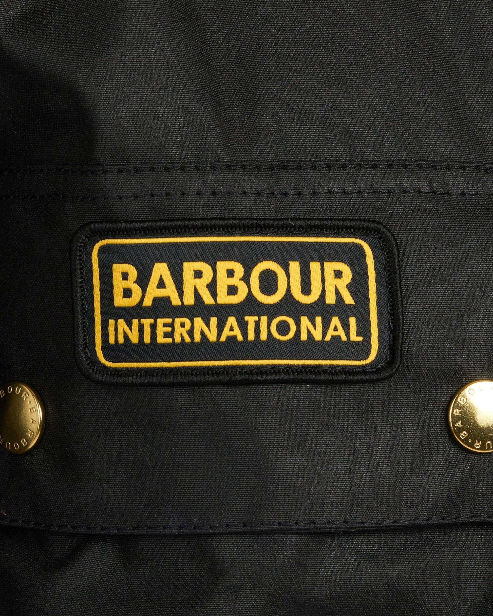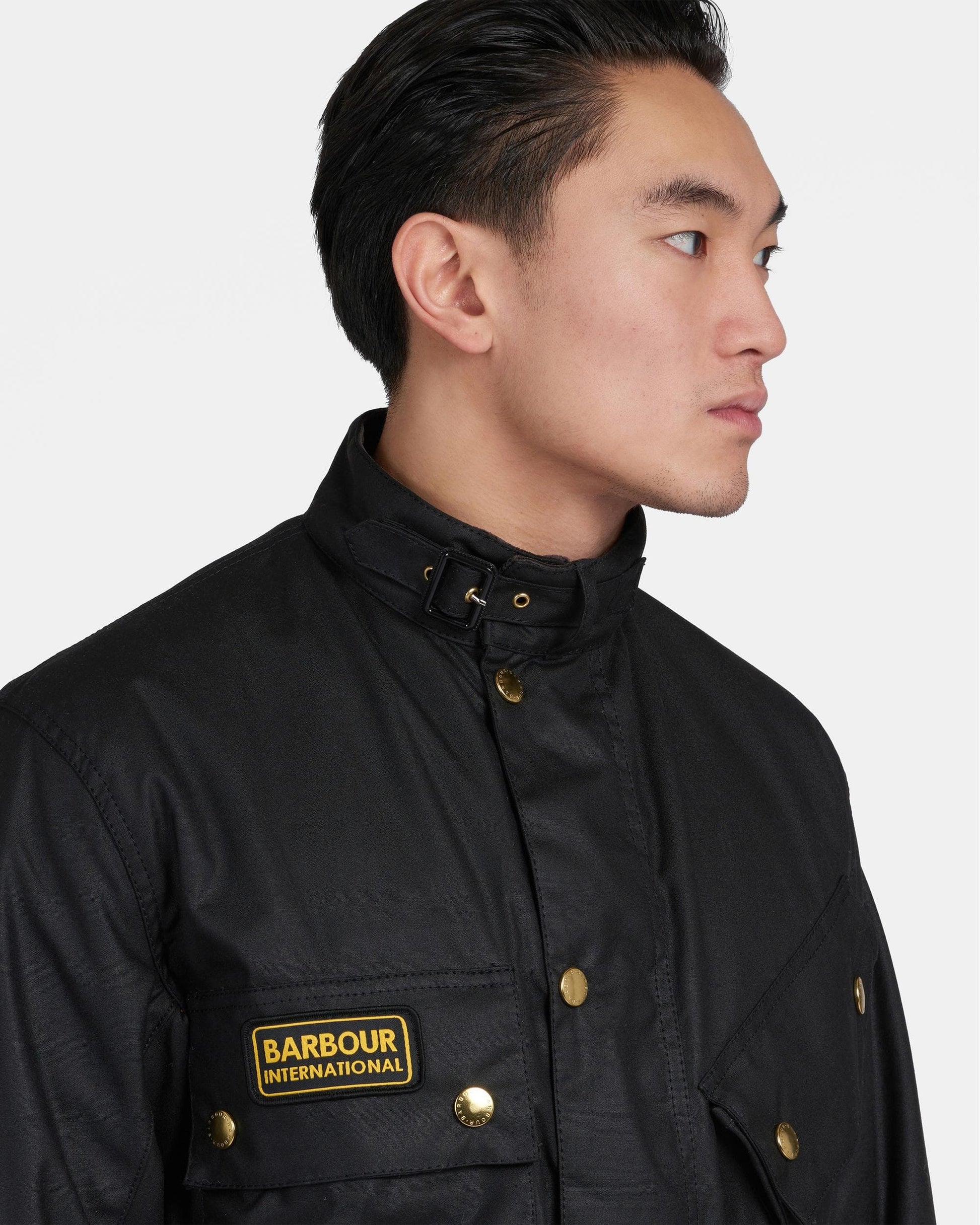 Barbour's iconic motorcycle jacket, the International, was created in 1936 and became the biker jacket of choice through the 50s, 60s and 70s. Staying true to that heritage, the International Original is constructed in a heavyweight 8oz Sylkoil waxed cotton, offering a stylish matte finish and road-ready protection. Its robust front zip sits beneath a stud-fastening storm fly front, and the funnel collar is lined with corduroy for insulation and a luxurious feel against the skin. The lightweight cotton lining carries the signature Barbour tartan and is studded to take the optional Warm Pile Lining, for added versatility. Traditional biker jacket details include the buckle-fastening throat strap, adjustable studded cuffs, a stiffened waist belt and the trademark four studded pockets, one of which is the authentic slanted map pocket, designed to give easy access while riding. Part of the World Tour collection, the International Original is available in classic Black with the famous Barbour International logo to the chest.