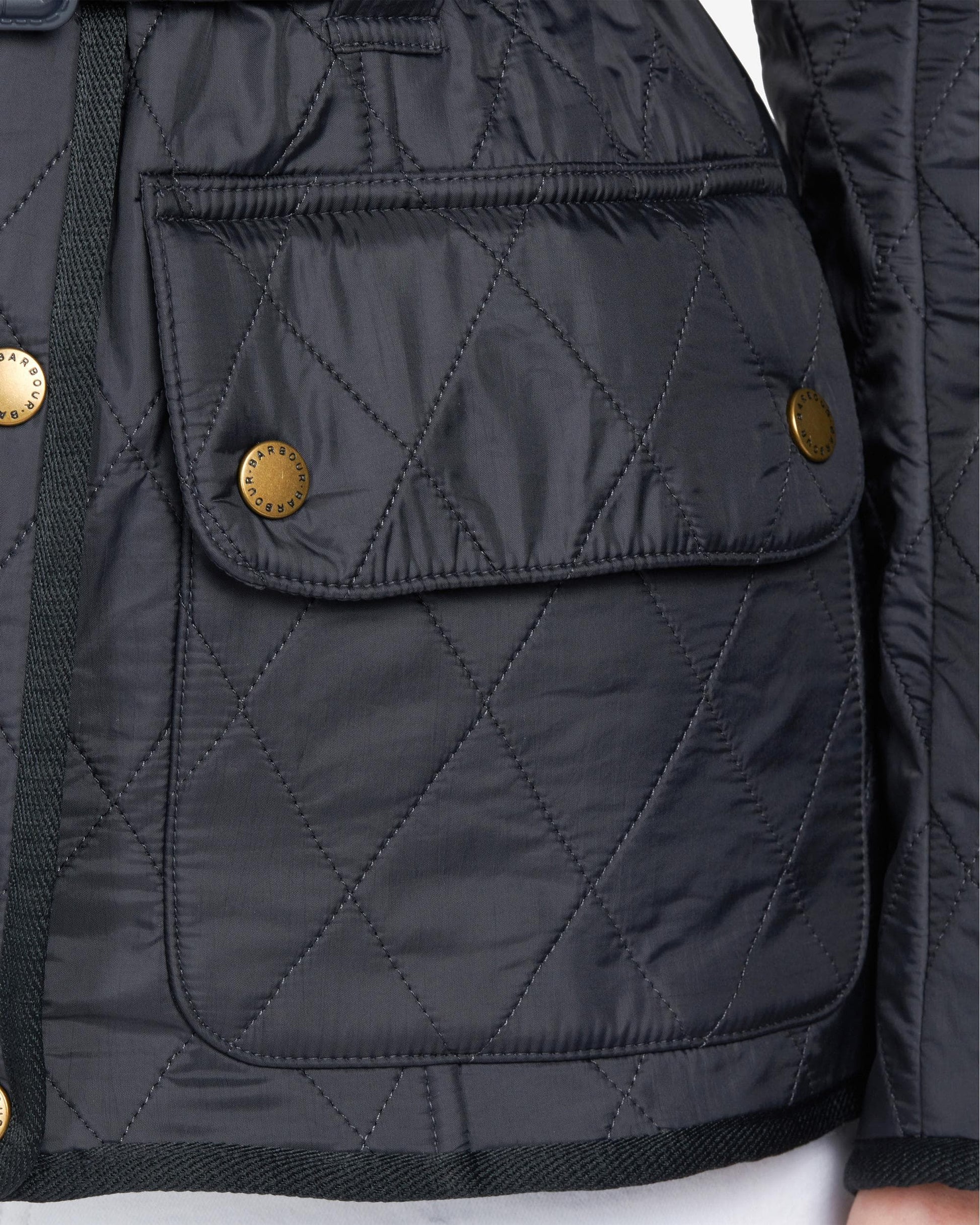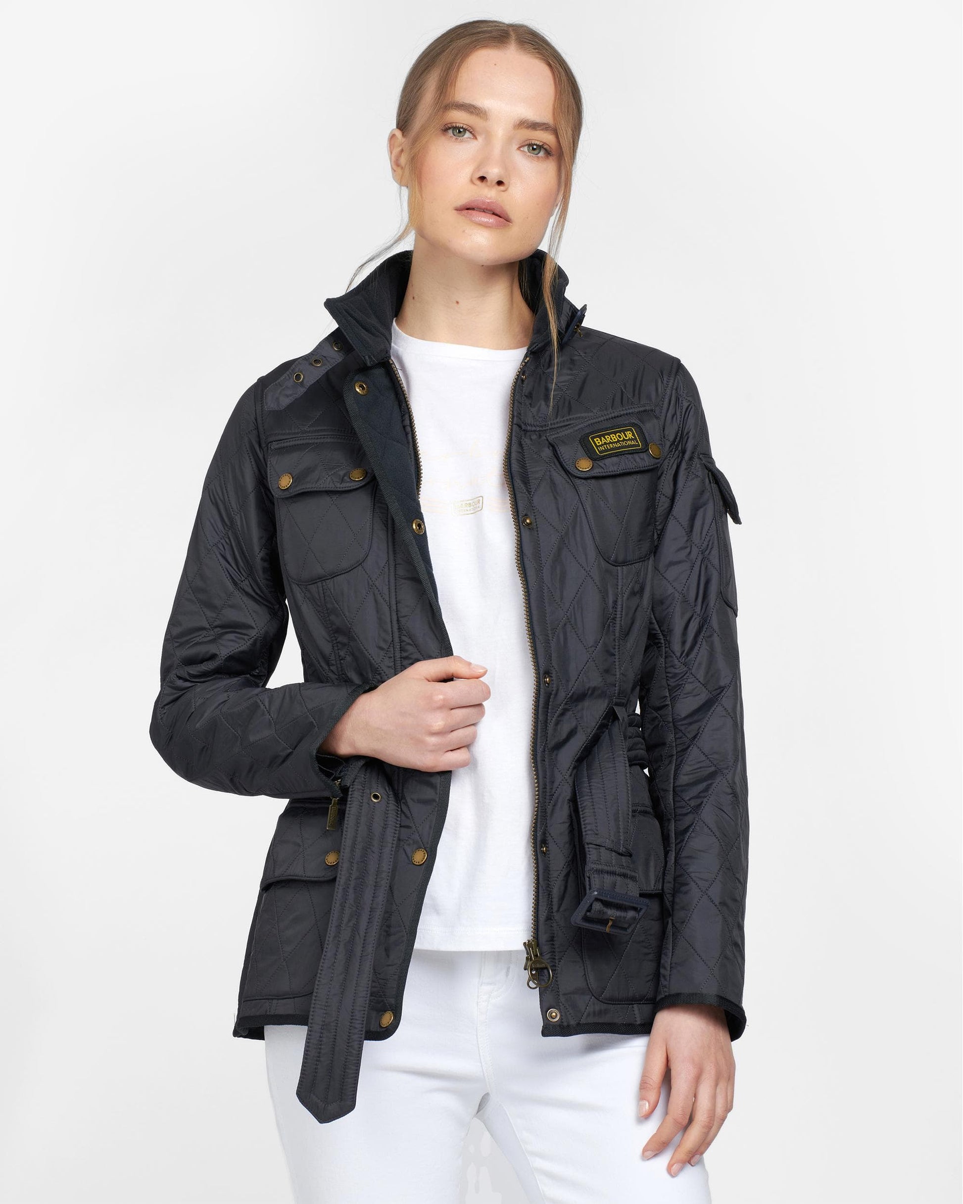 Updating the iconic Barbour International look with a cosy Polarquilt combination, this slim-fitting design features a diamond-quilted outer and a fleece lining for luxurious warmth with a soft feel. Four studded pockets, a funnel collar with neck strap, a sleeve pocket and shoulder patches retain the authentic biker-jacket look, while a buckle-close belt creates a flattering silhouette.