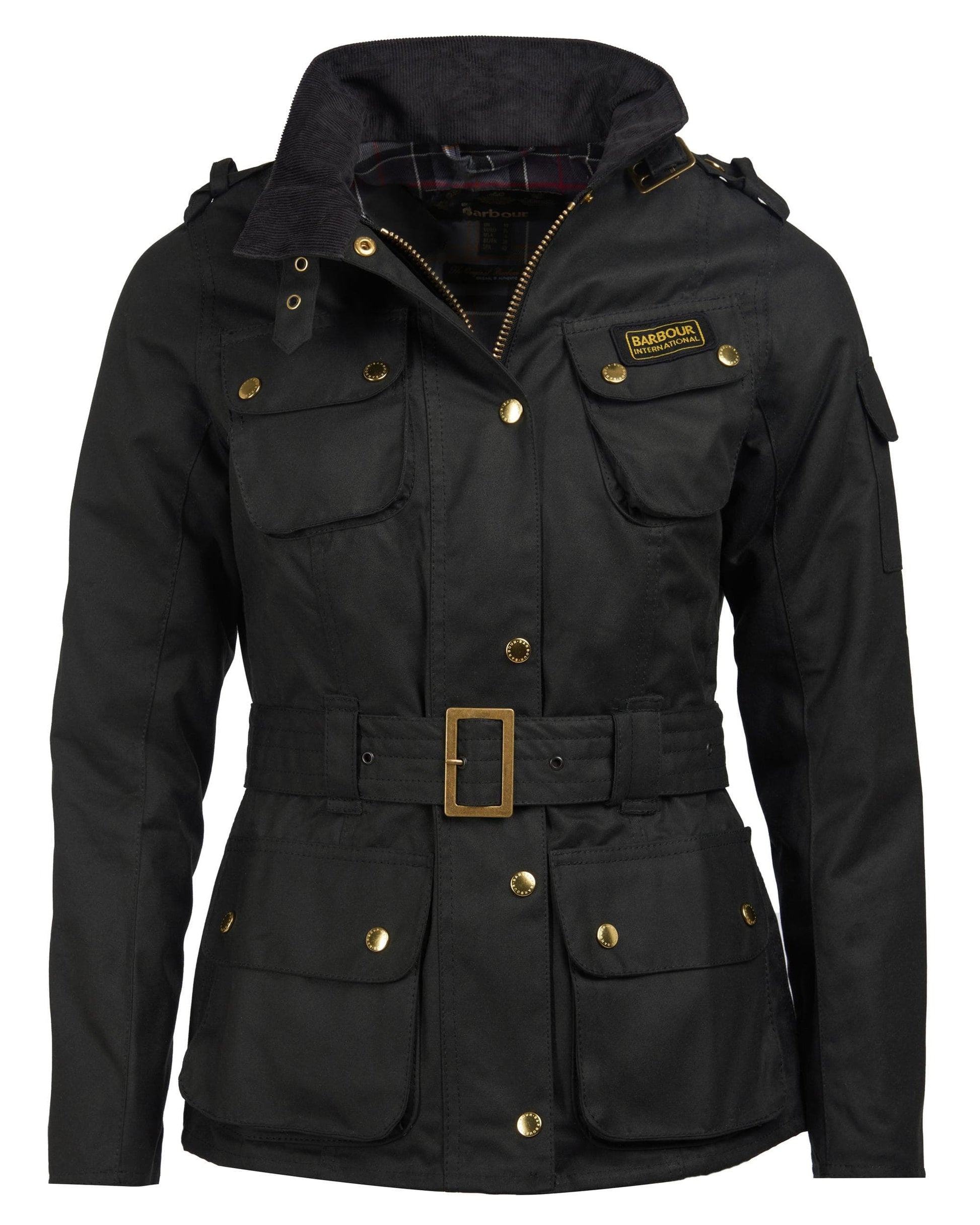 Inspired by Barbour International's rich heritage in motorcycle clothing, the Ladies' International reworks the iconic biker-style jacket for a feminine silhouette. Showcasing a belt to the waist for a flattering finish, this jacket boasts a four pocket design with an authentic buckle fastening to the neck. Featuring a zip front fastening with a concealed placket, this jacket t is effortlessly finished with Barbour International branding to the left of the chest.
