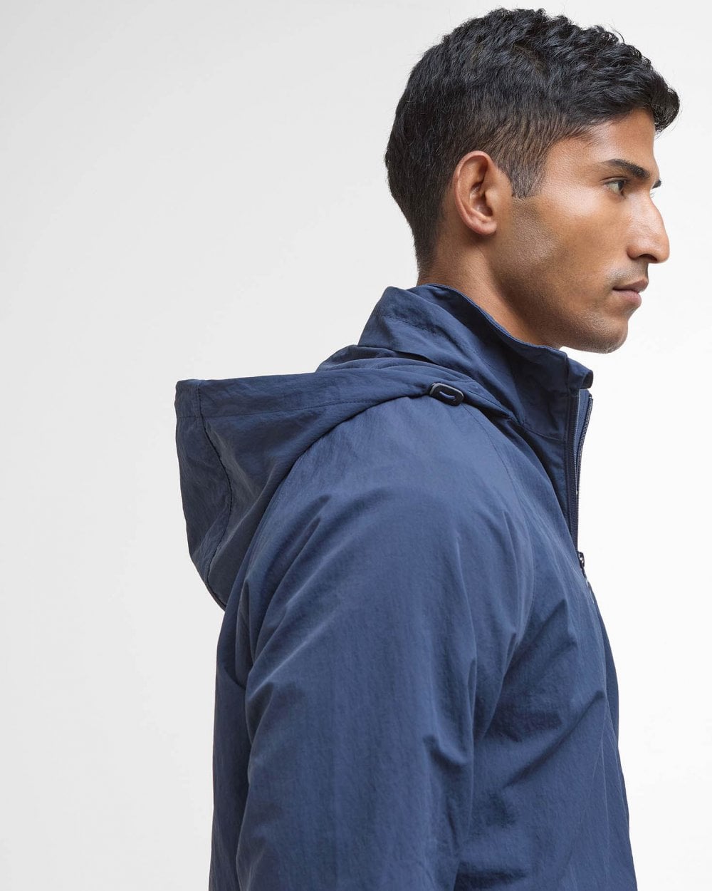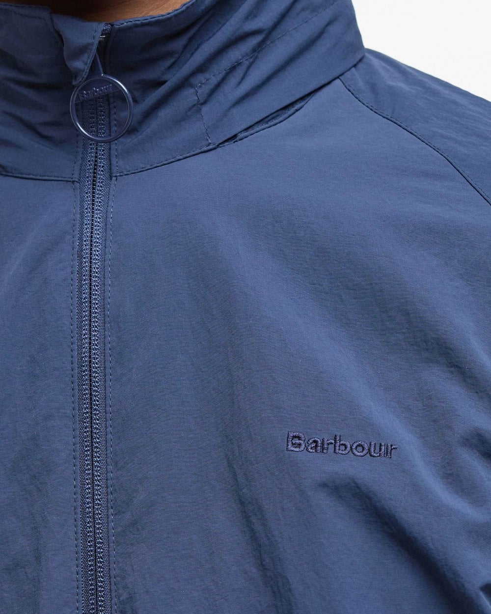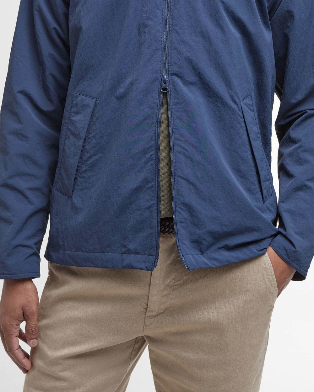 Showerproof jacket with stand collar, stowaway hood and zip front fastening. Finished with lower storm welt pockets and mesh inner body lining.