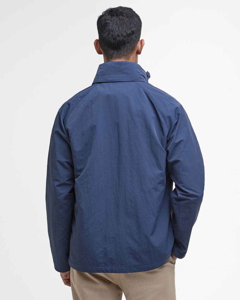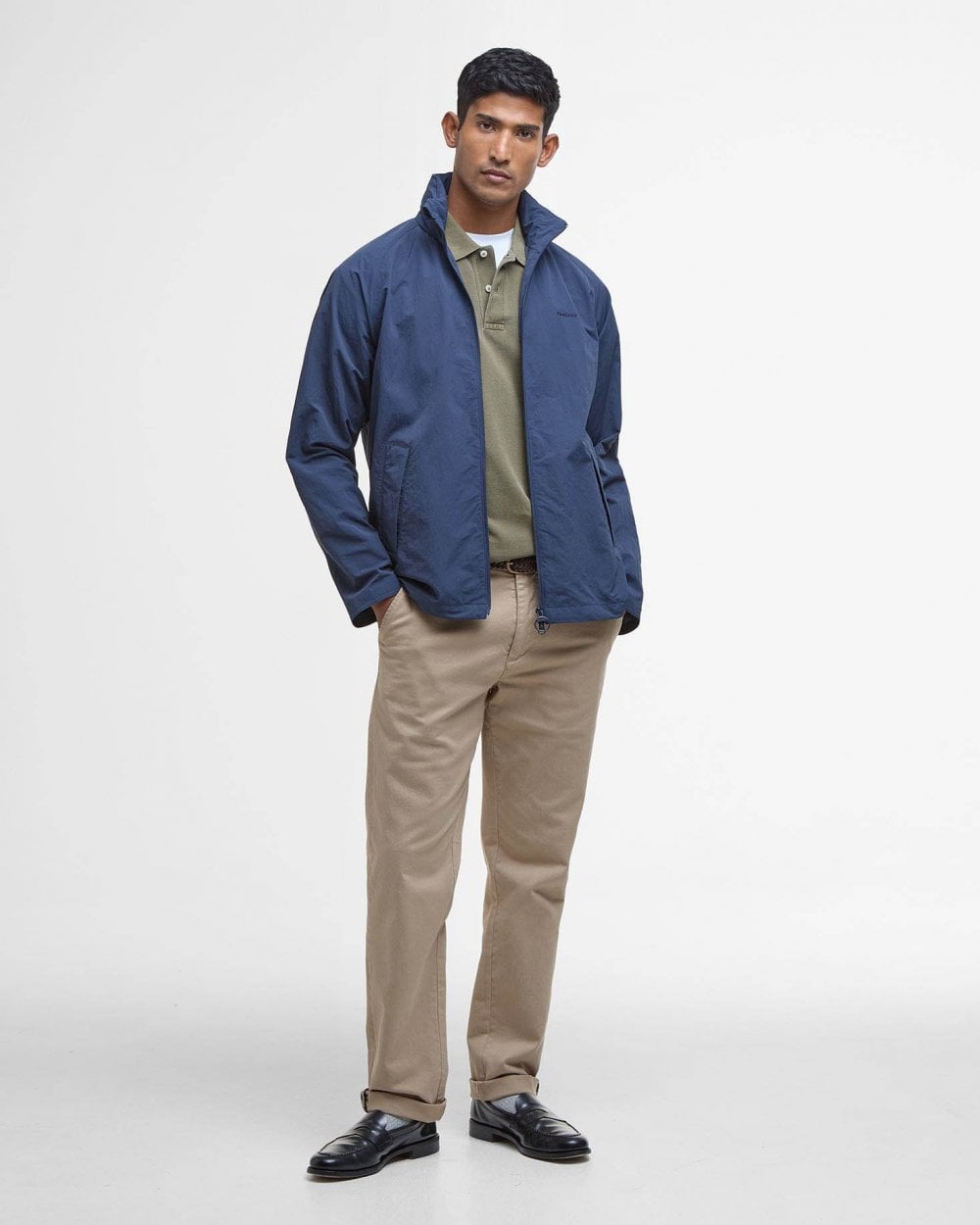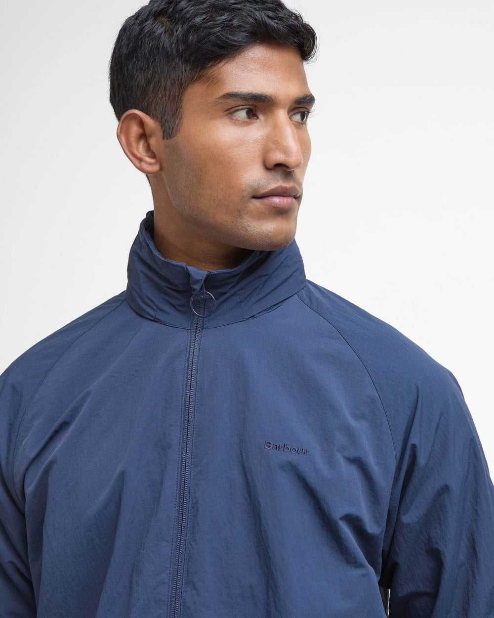Showerproof jacket with stand collar, stowaway hood and zip front fastening. Finished with lower storm welt pockets and mesh inner body lining.