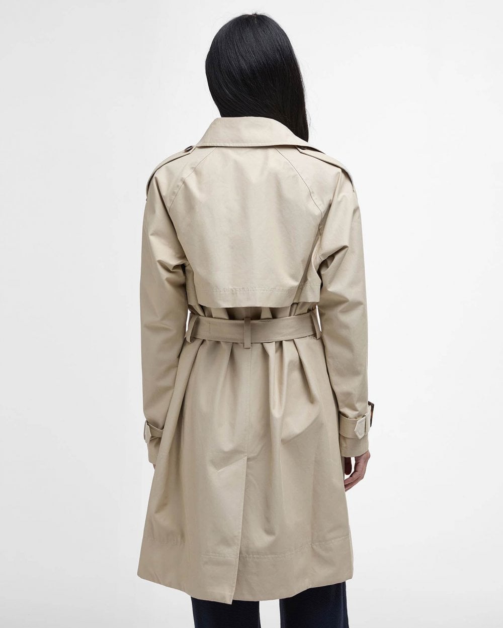 Raglan sleeve showerproof trench coat with belted waist and cuff straps. This style features oversized epaulettes, welt pockets and an open back yoke.