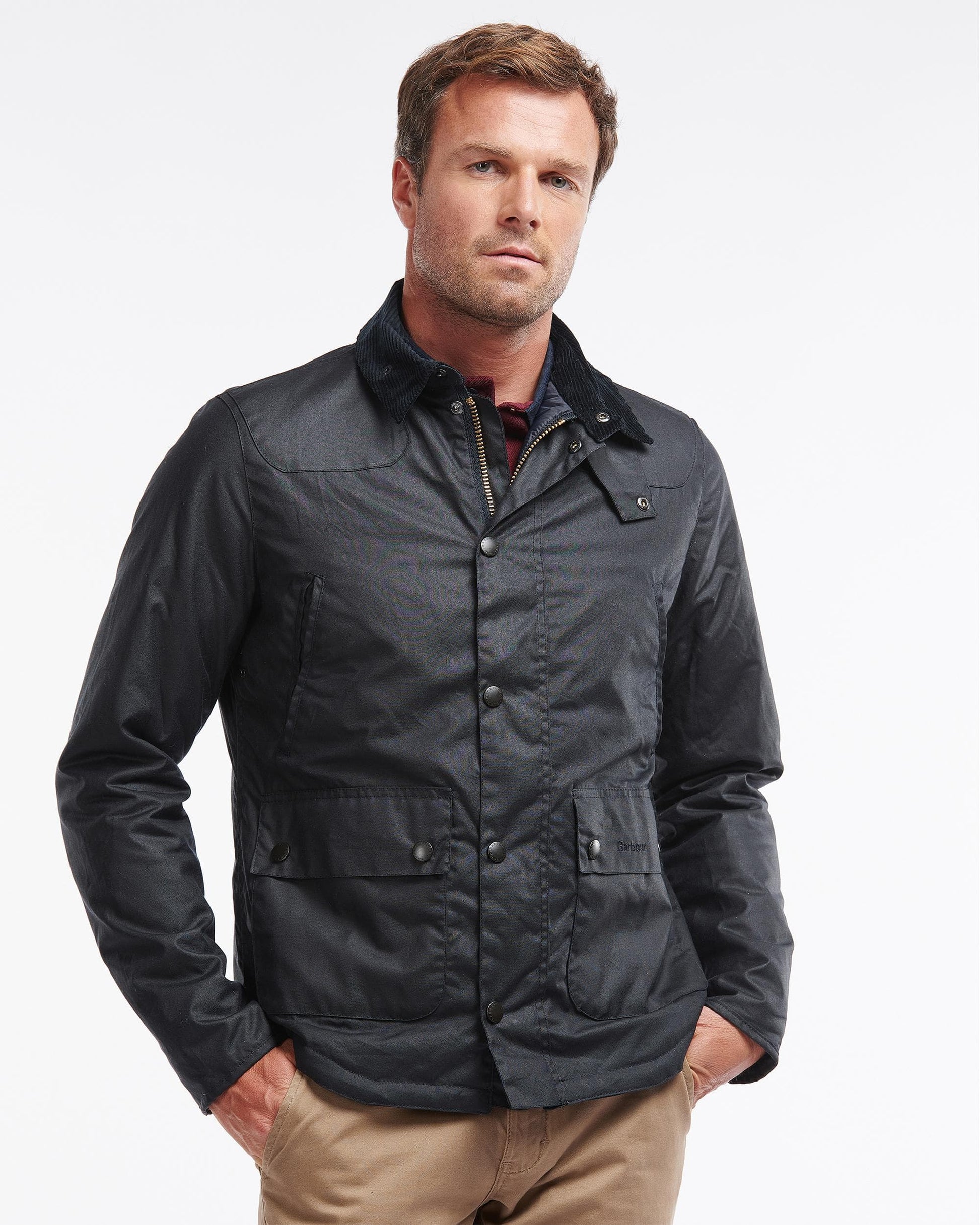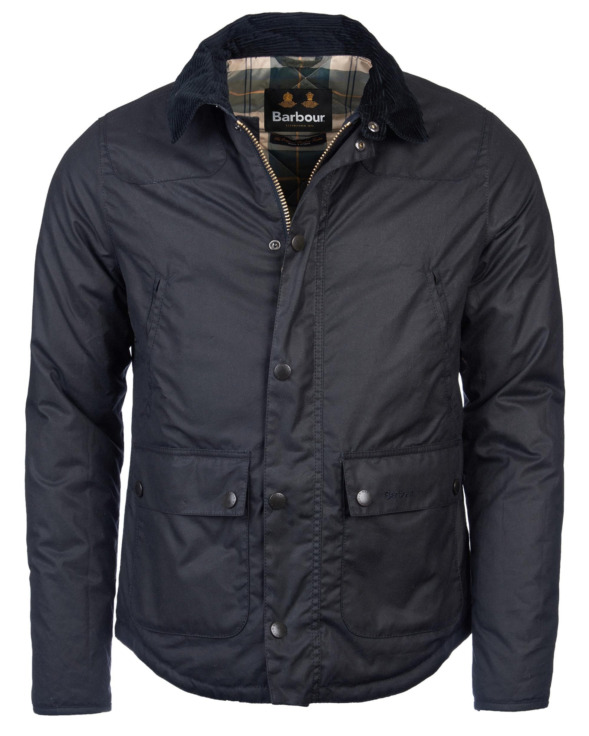 The Barbour Reelin Jacket features a 6oz wax style with a classic tartan lining. Styled with a stand collar, two jetted and two lower bellow pockets for easy wearing this jacket showcases a timeless style.