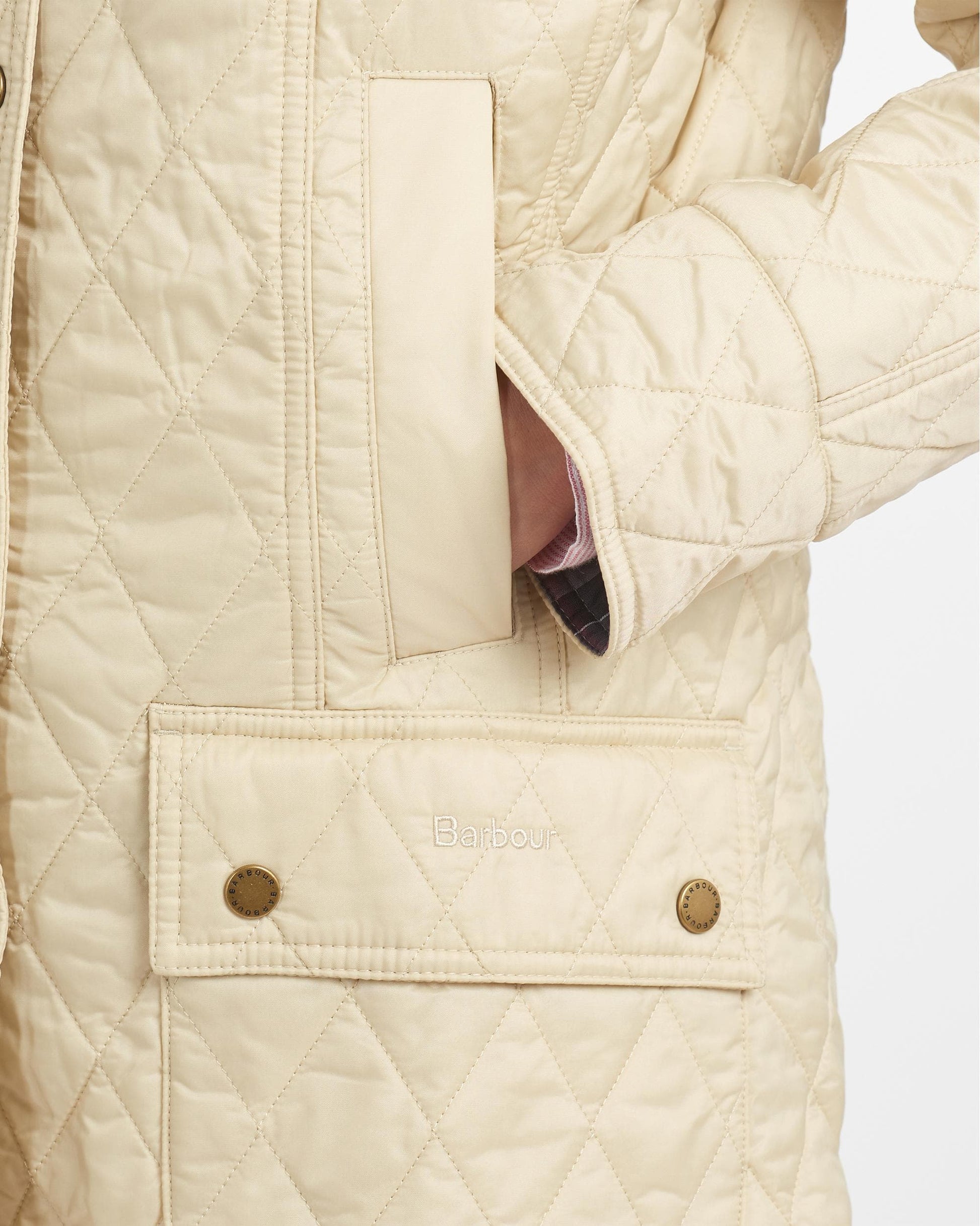 Translating the iconic Beadnell styling into a summer-weight quilted jacket, this versatile design features a box-quilted outer, handwarmer pockets and two stud-close lower pockets trimmed with tonal logo embroidery. Simple snap closures fasten through the centre front to a sit-down collar with a throat tab trimmed in Barbour Tartan.