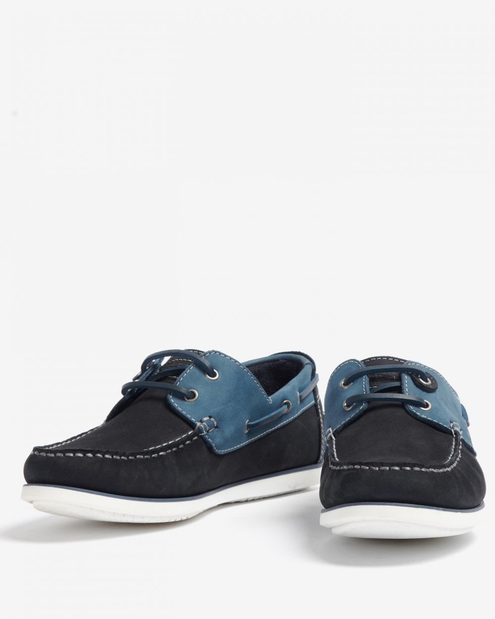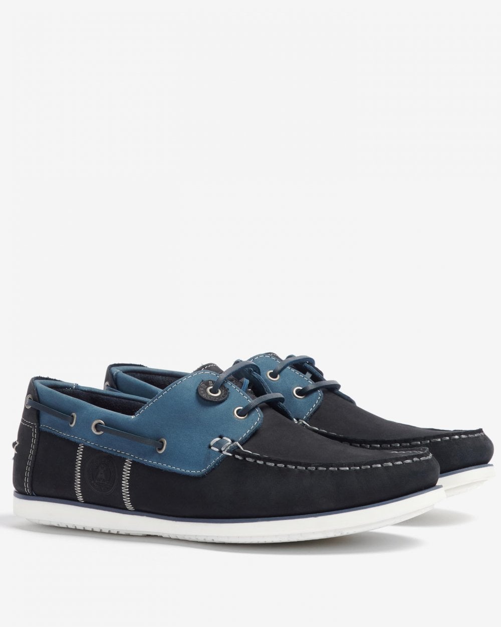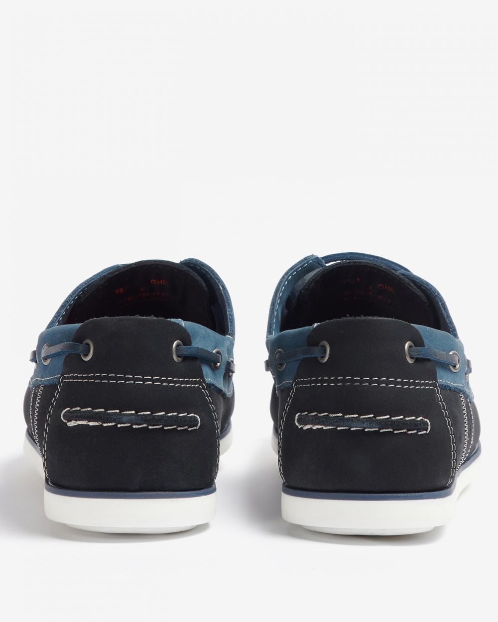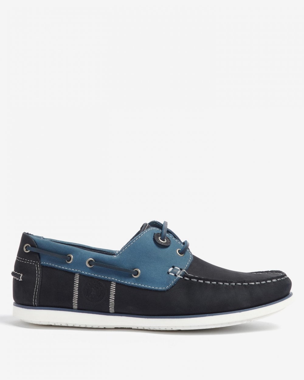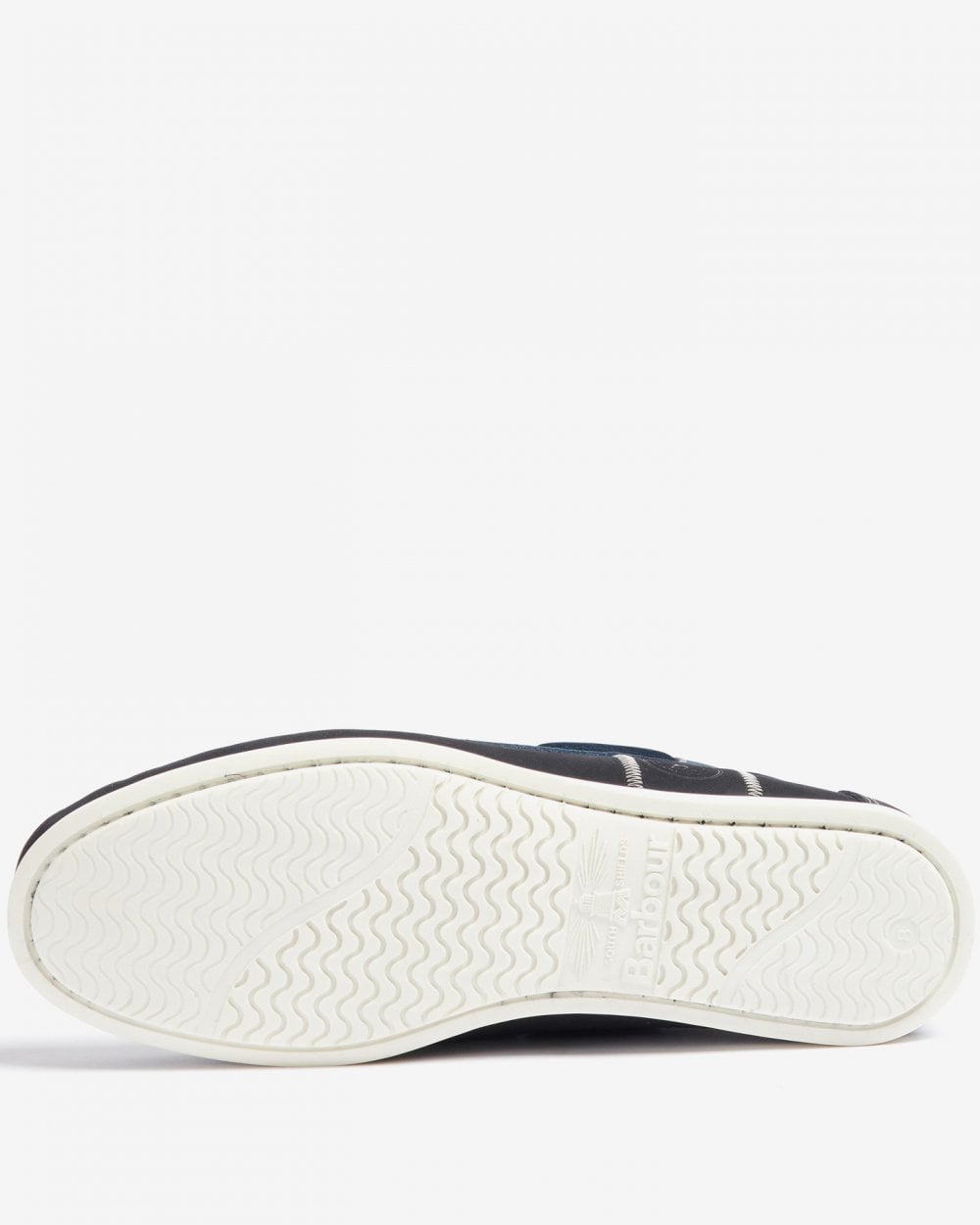 A two eyelet boat shoe with hide lace thonging. Barbour branded faux sipe pattern outsole.