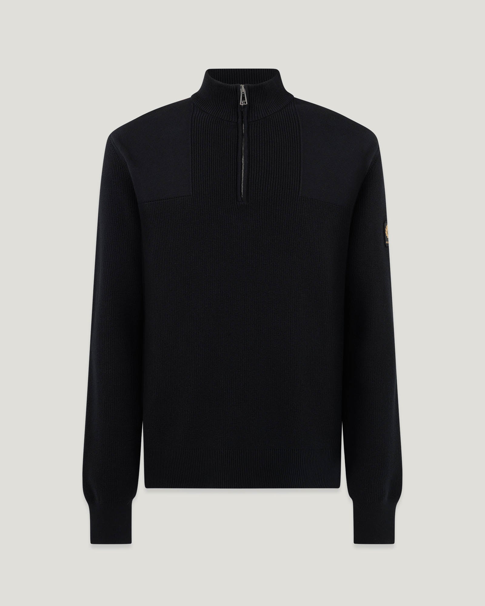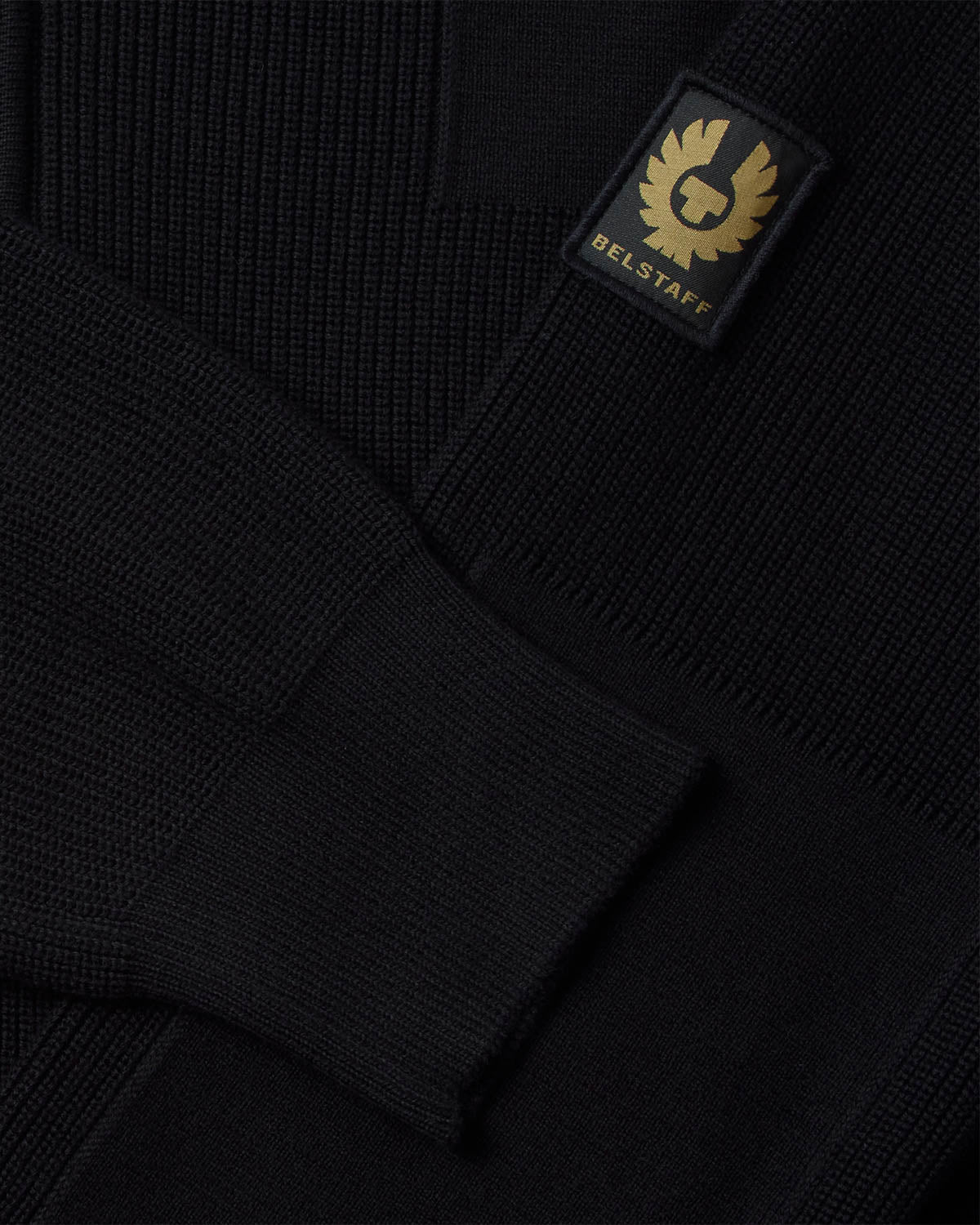 • Embroidered edge yellow gold Belstaff phoenix on black patch on left sleeve