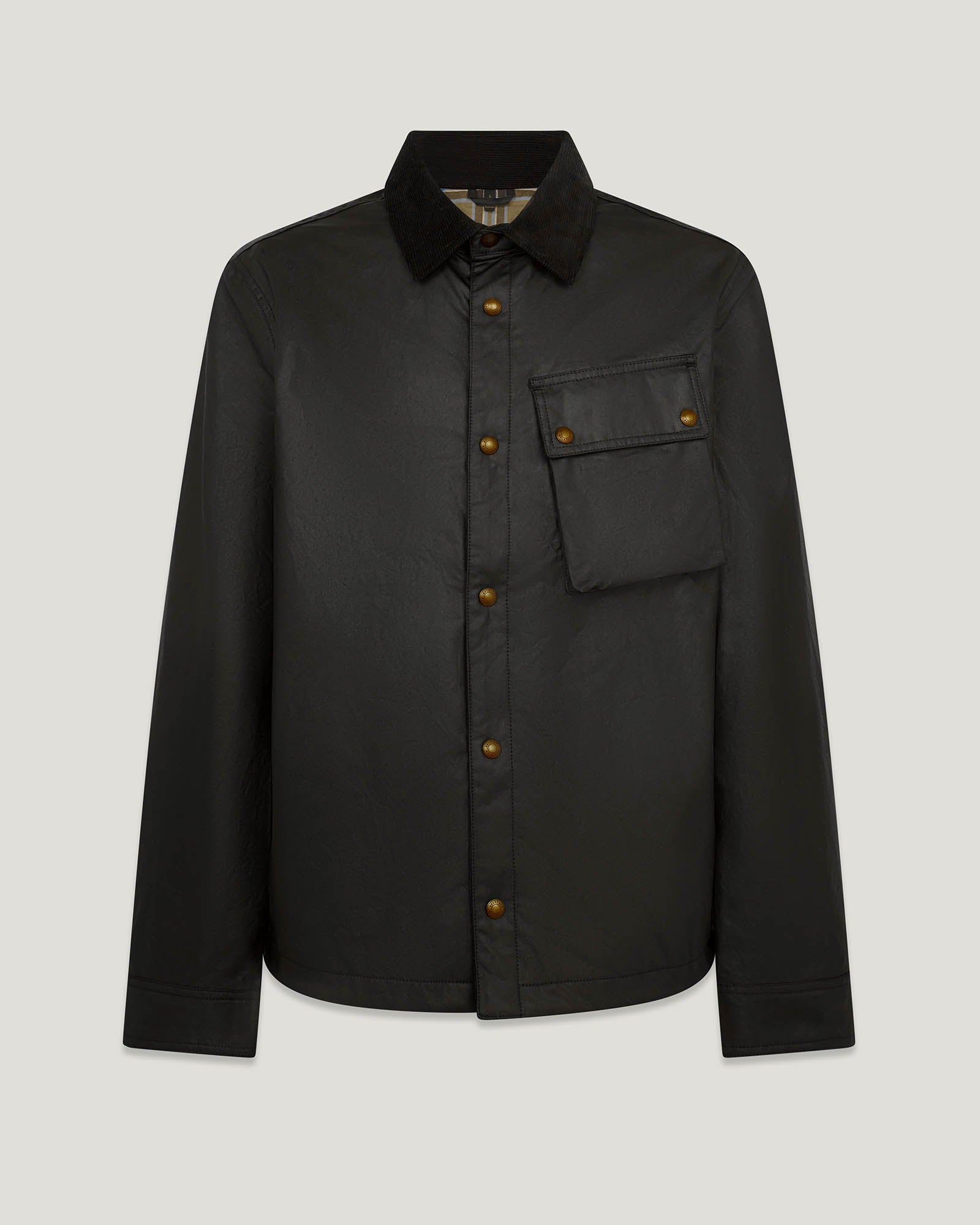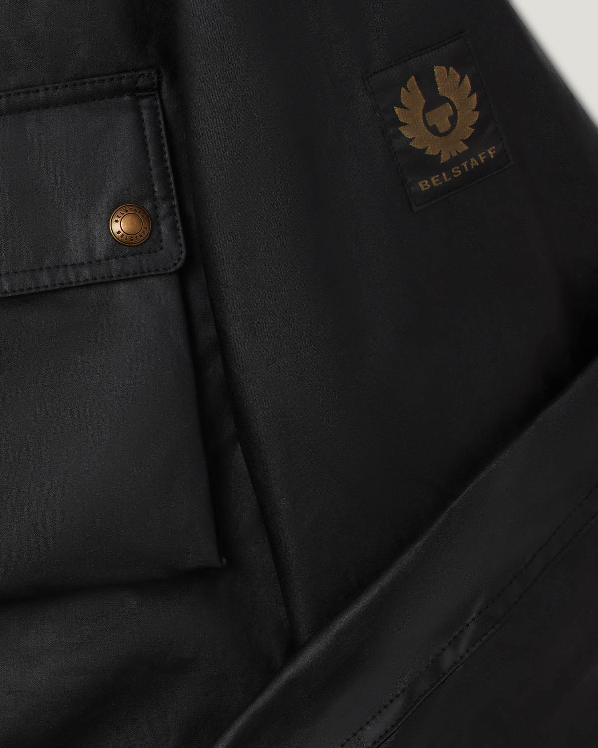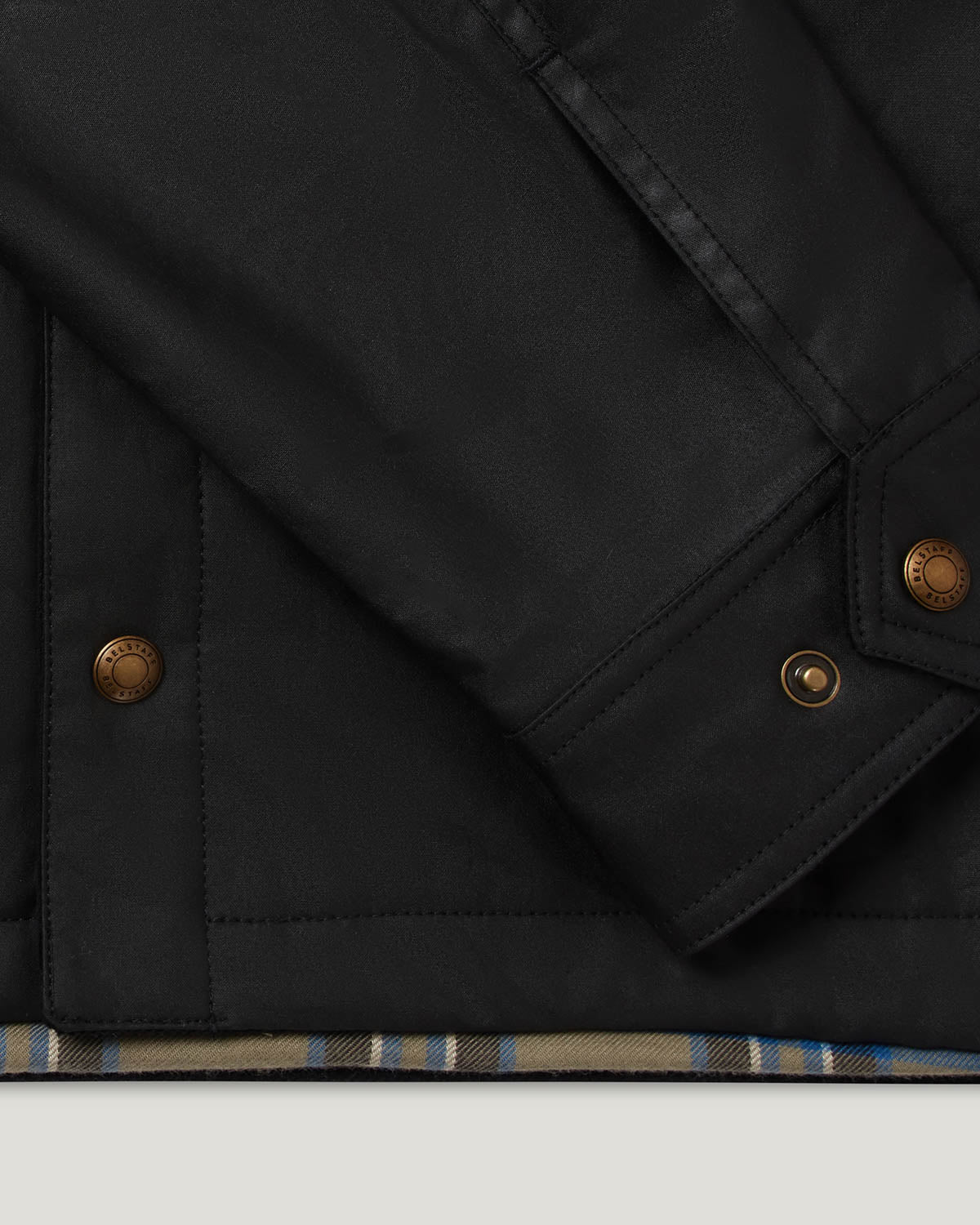 Meet the Ground jacket in black with a stylish corduroy collar. It offers instant warmth and protection with 6oz. British Millerain waxed cotton, which is water and wind repellent. Inside features a cotton twill lining woven in the signature Belstaff checked pattern, angled moto inspired chest pocket and snap adjustable cuffs with antique brass hardware. This men’s jacket is as at home on country walks as it is on the work commute over a suit.