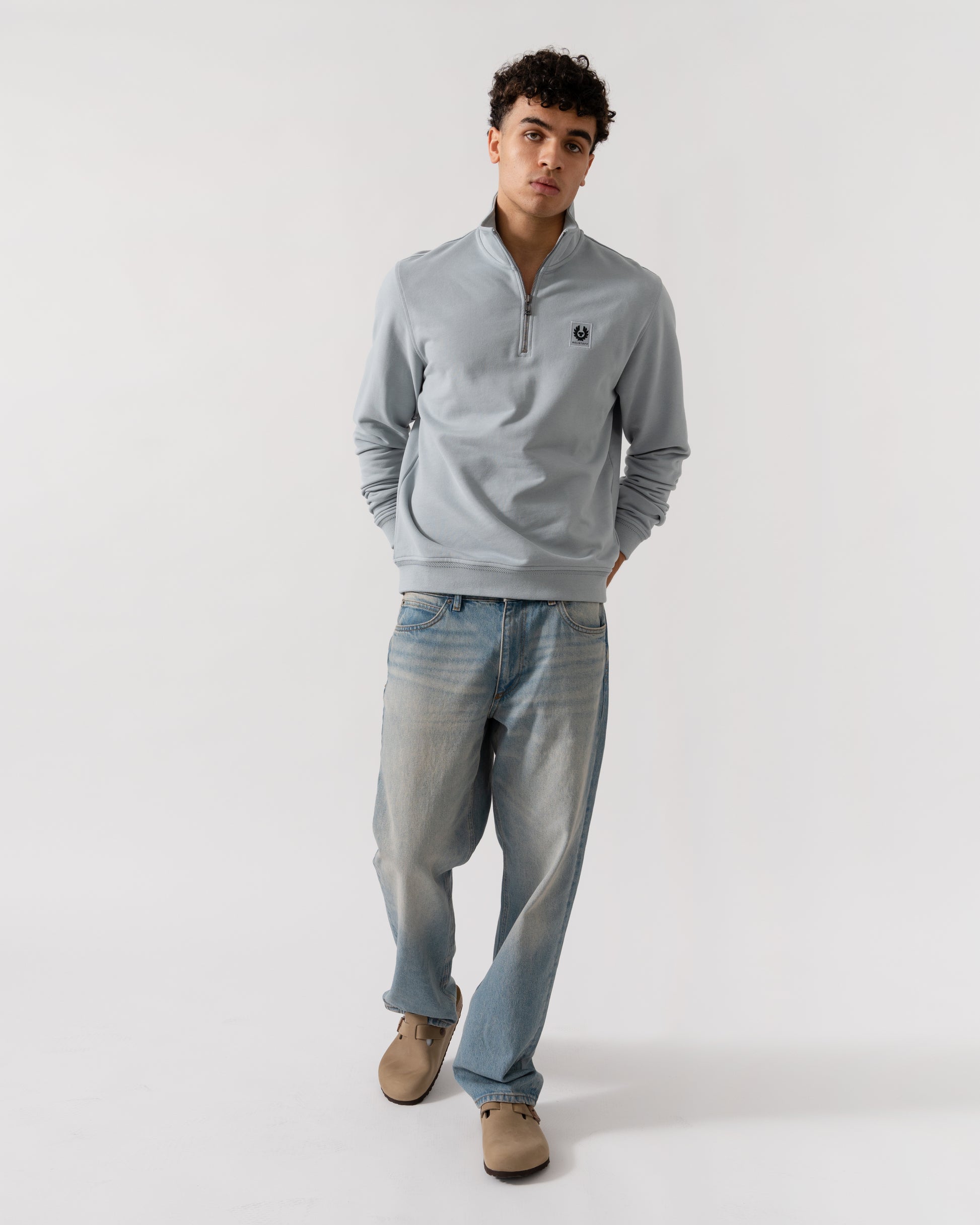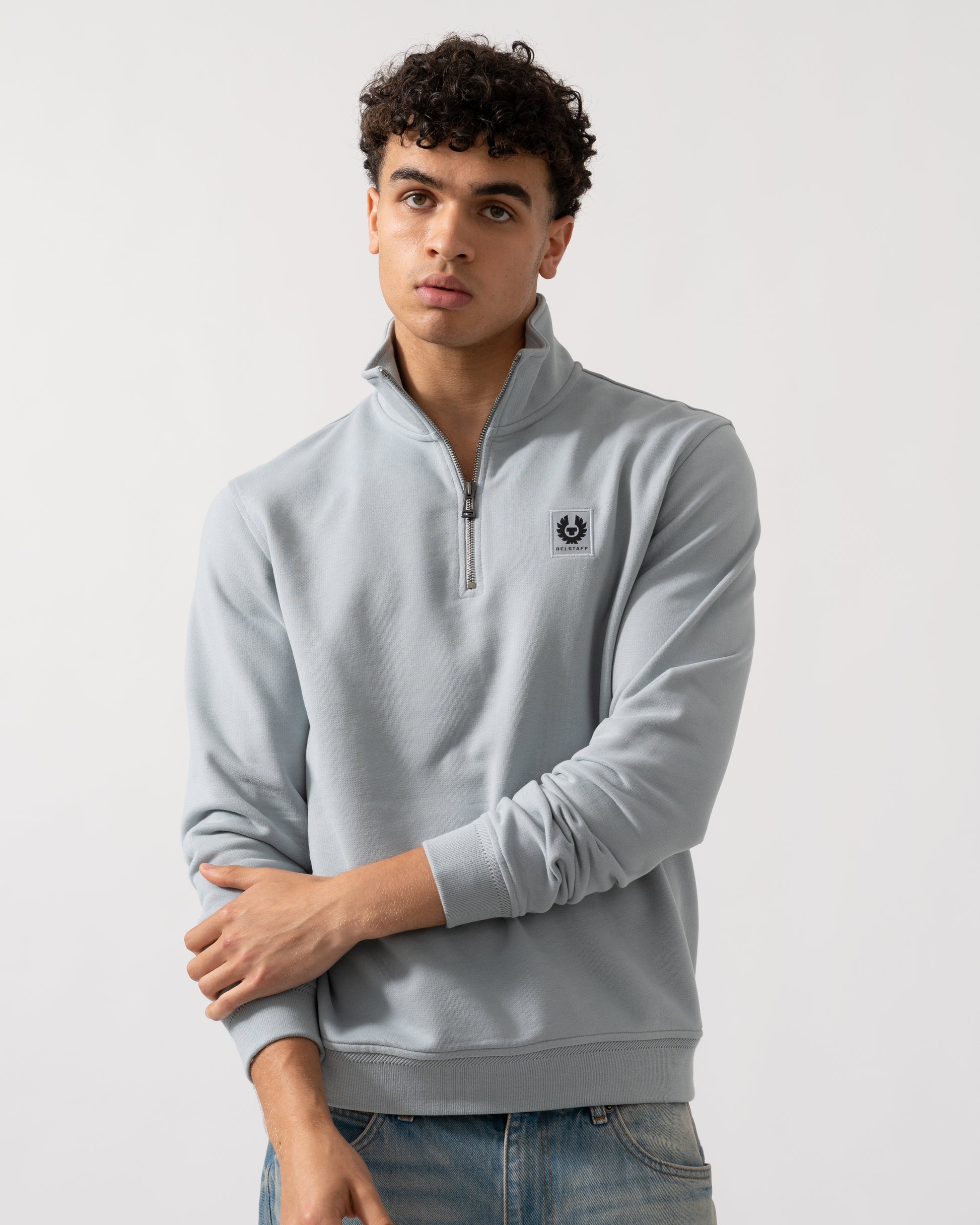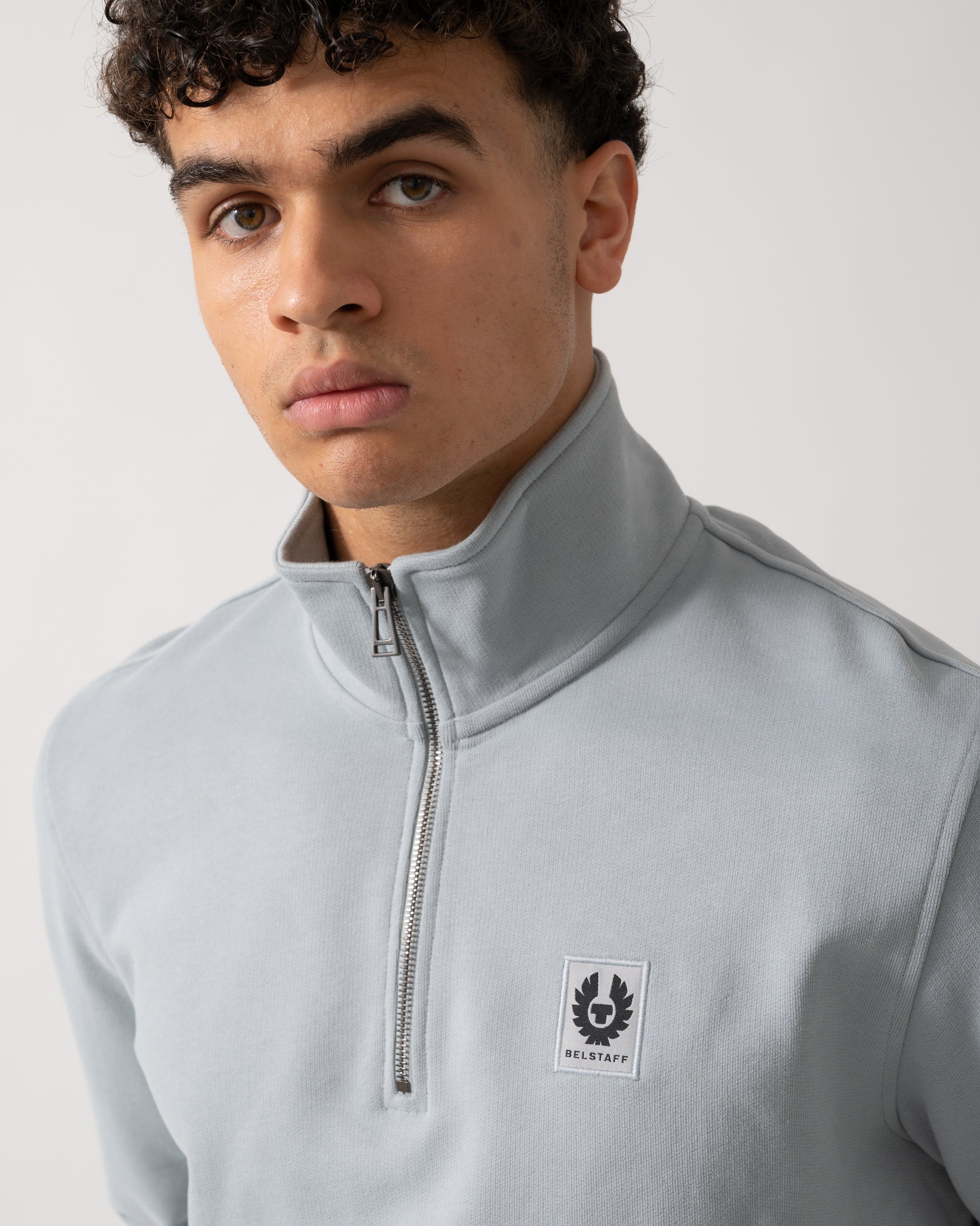 The Belstaff Quarter Zip. A simple sweatshirt with a high zip collar and Belstaff's phoenix badge on the chest.