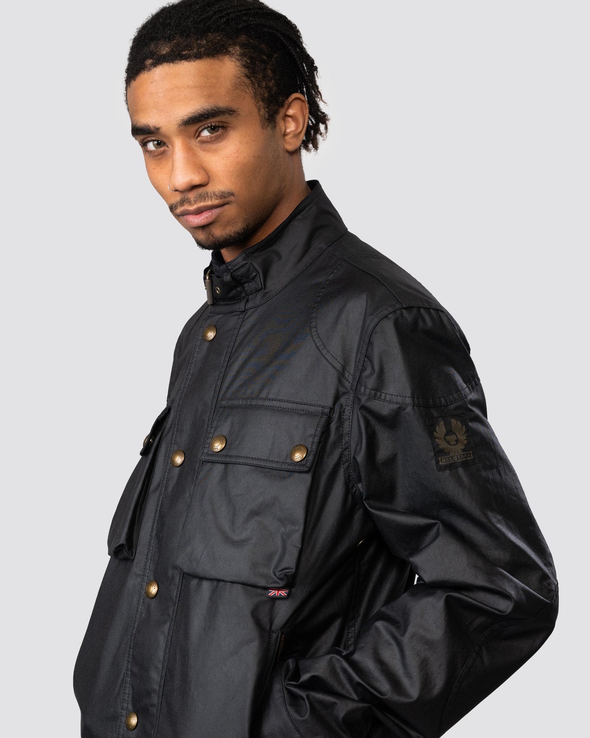 - Signature antique brass metal hardware with Belstaff England engraved on the round and signature phoenix woven patch on left sleeve