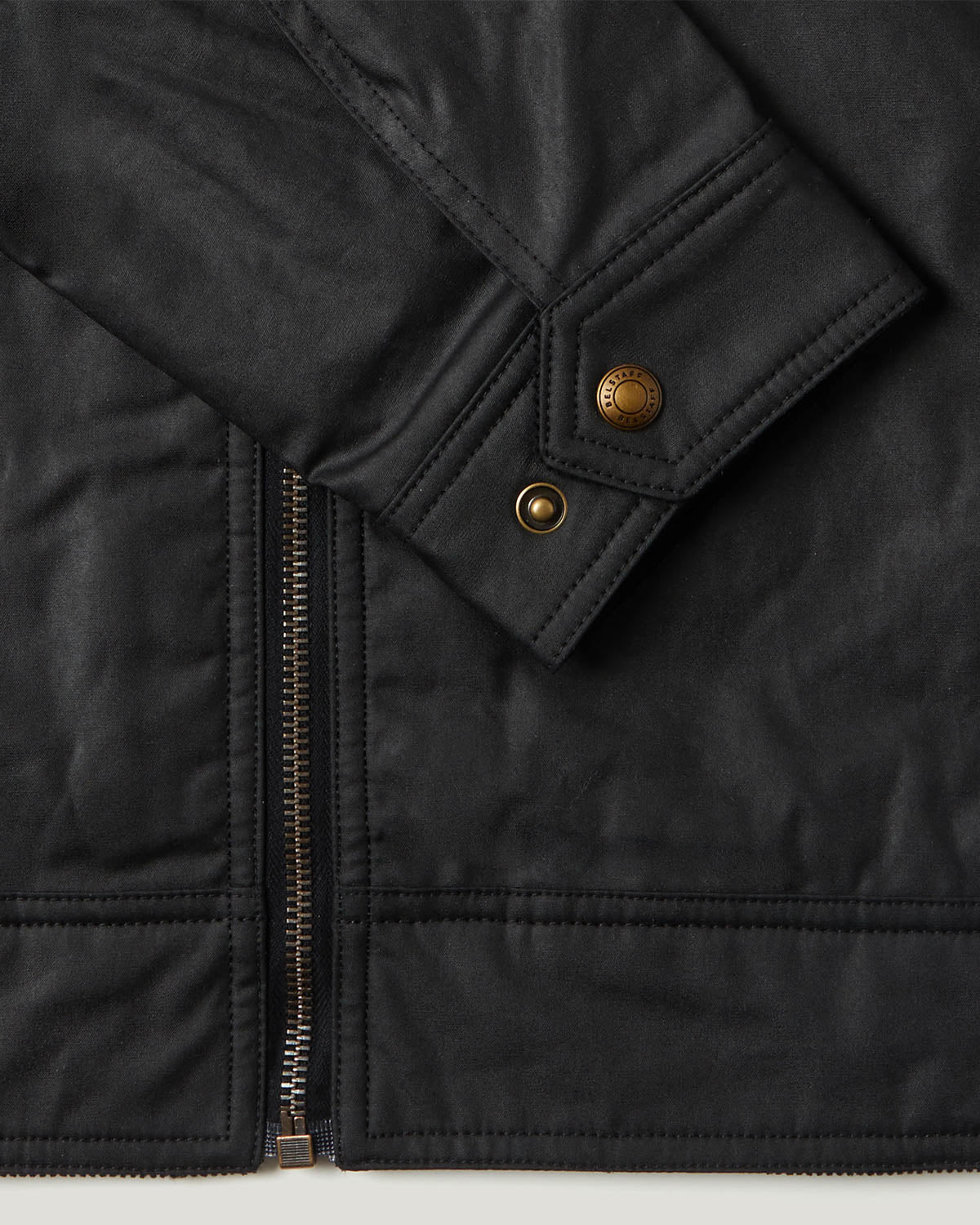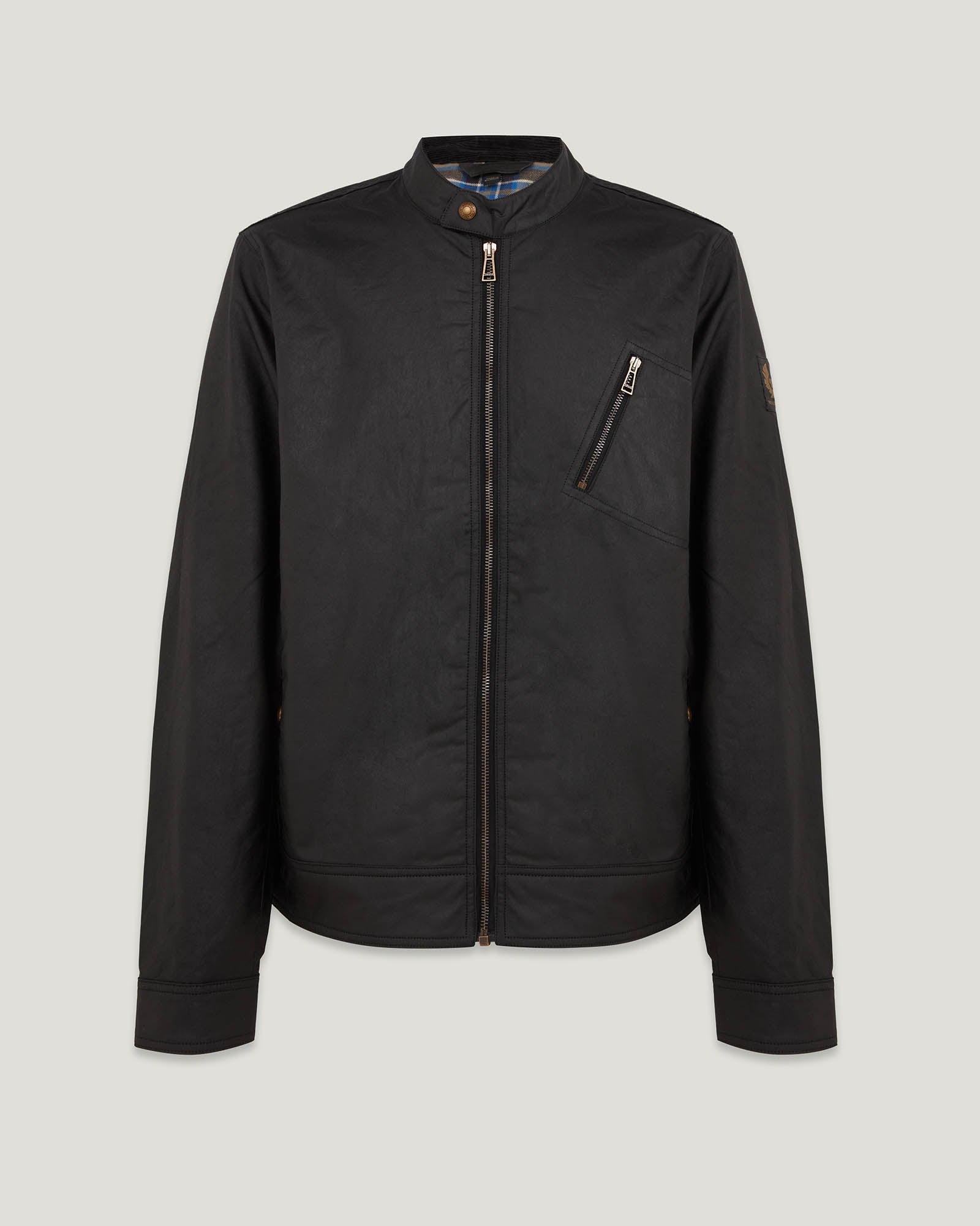 Based on Belstaff's iconic Cafe Racer, the Sideline jacket in black offers instant warmth and protection with 6oz. British Millerian waxed cotton, which is water – and wind-repellent. Inside, it features a cotton twill lining woven in the signature Belstaff checked pattern, our woven Phoenix patch on the sleeve, and snap adjustable cuffs with antique brass hardware.