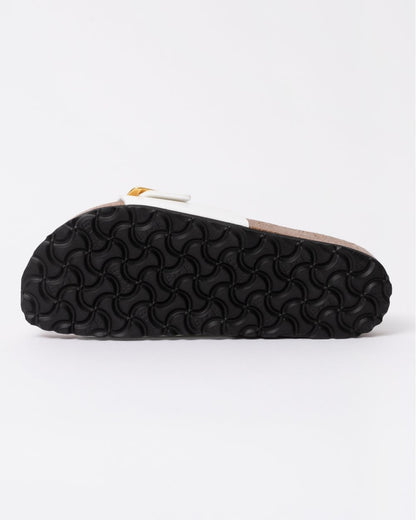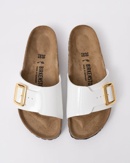 The design of the BIRKENSTOCK Catalina was inspired by the classic Madrid with a strap and metal buckle. The slightly wider strap lends this sandal a modern and elegant appearance. The shiny, gently rounded padded buckles are especially eye-catching. The upper is made from the skin-friendly, hard-wearing synthetic material Birko-Flor® with a shiny patent coating.