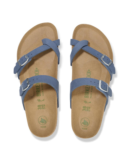 The BIRKENSTOCK Mayari thong sandal stands out with its flowing look and brings together design and comfort. This popular sandal has been given an update in a new material, with a vegan version now available. It is entirely free of animal products, as verified by independent testing laboratories. The upper is made from a skin-friendly, synthetic material with a velvety feel.