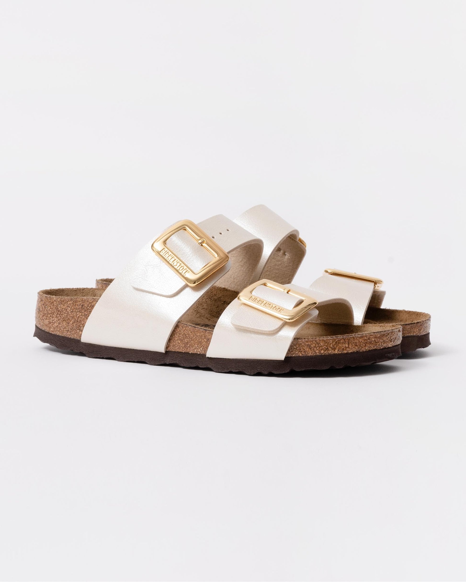 Birkenstock Sydney Cushion Big Buckle Womens Birko-Flor Patent Sandals in Graceful Pearl White