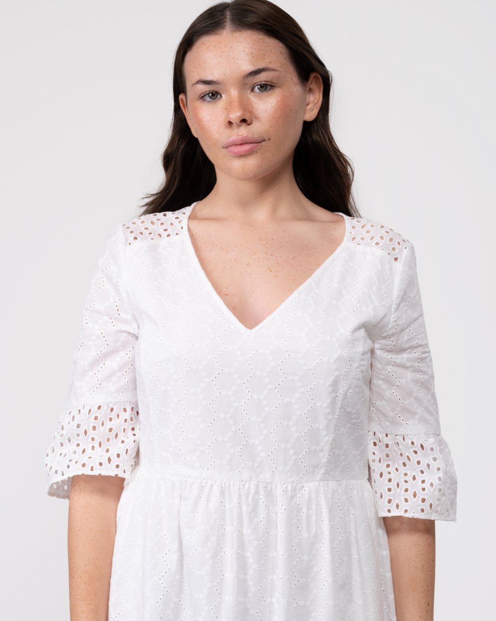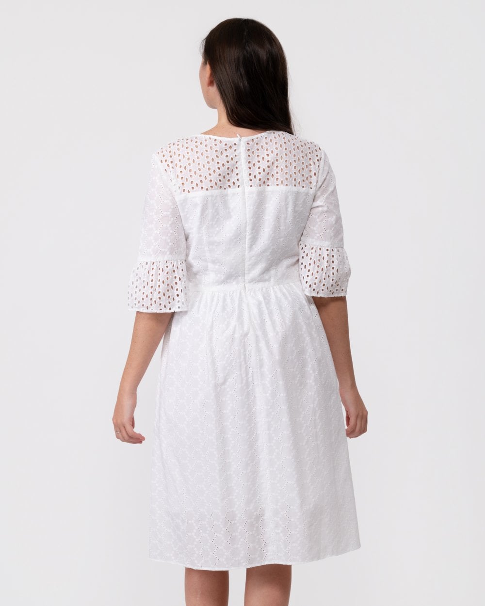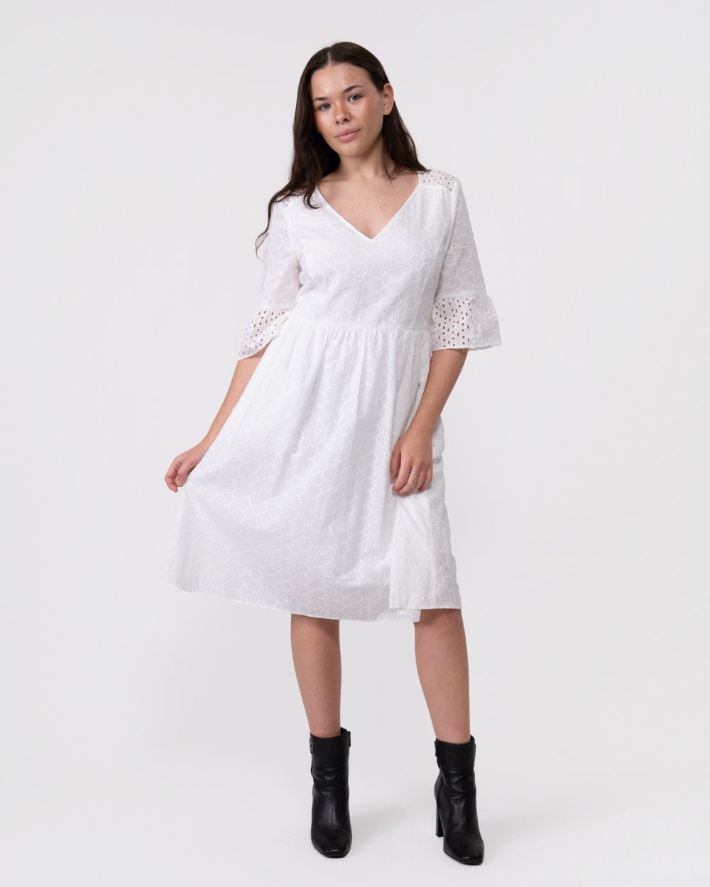 A summery dress crafted in lightweight cotton voile by BOSS Womenswear. Offering a waisted shape and a deep V neckline for a flattering silhouette, this fluid dress features trend-driven bell sleeves and mixes two broderie anglaise fabrics for modern appeal. This feminine design fastens with a concealed side zip for a smooth line, and can be teamed with sandals for instant daytime glamour.