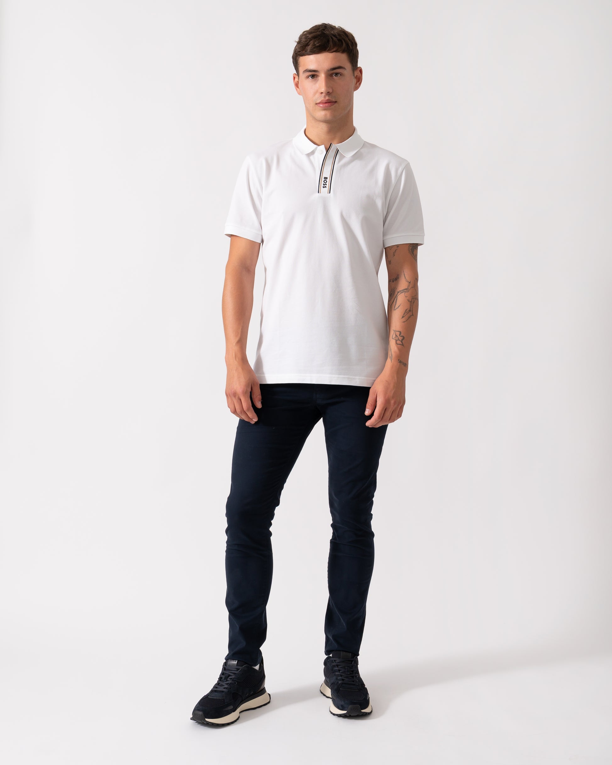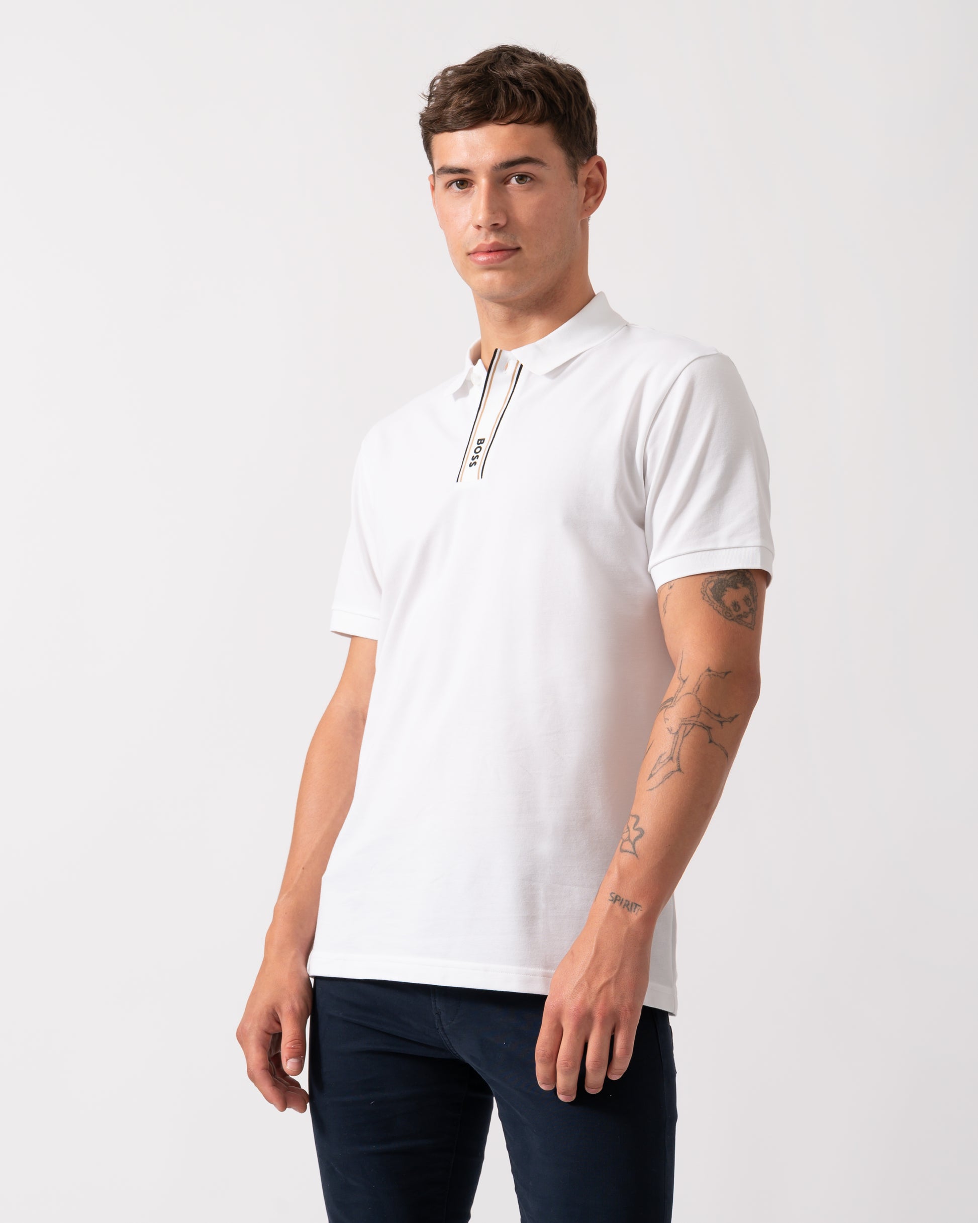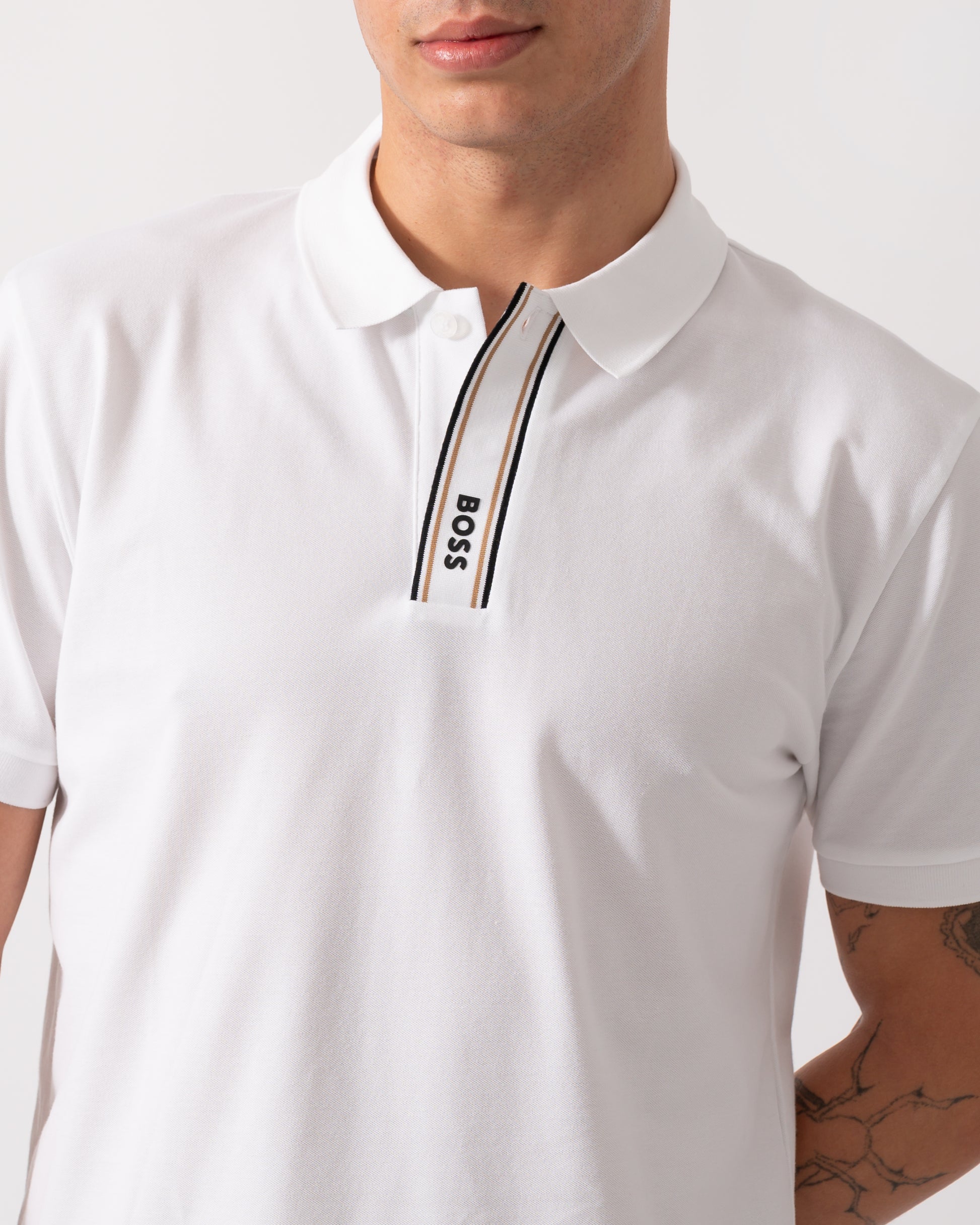 Cut in cotton with moisture management and four-way stretch, this BOSS Menswear polo shirt offers active comfort. Straight fit. Stripe and logo on placket.