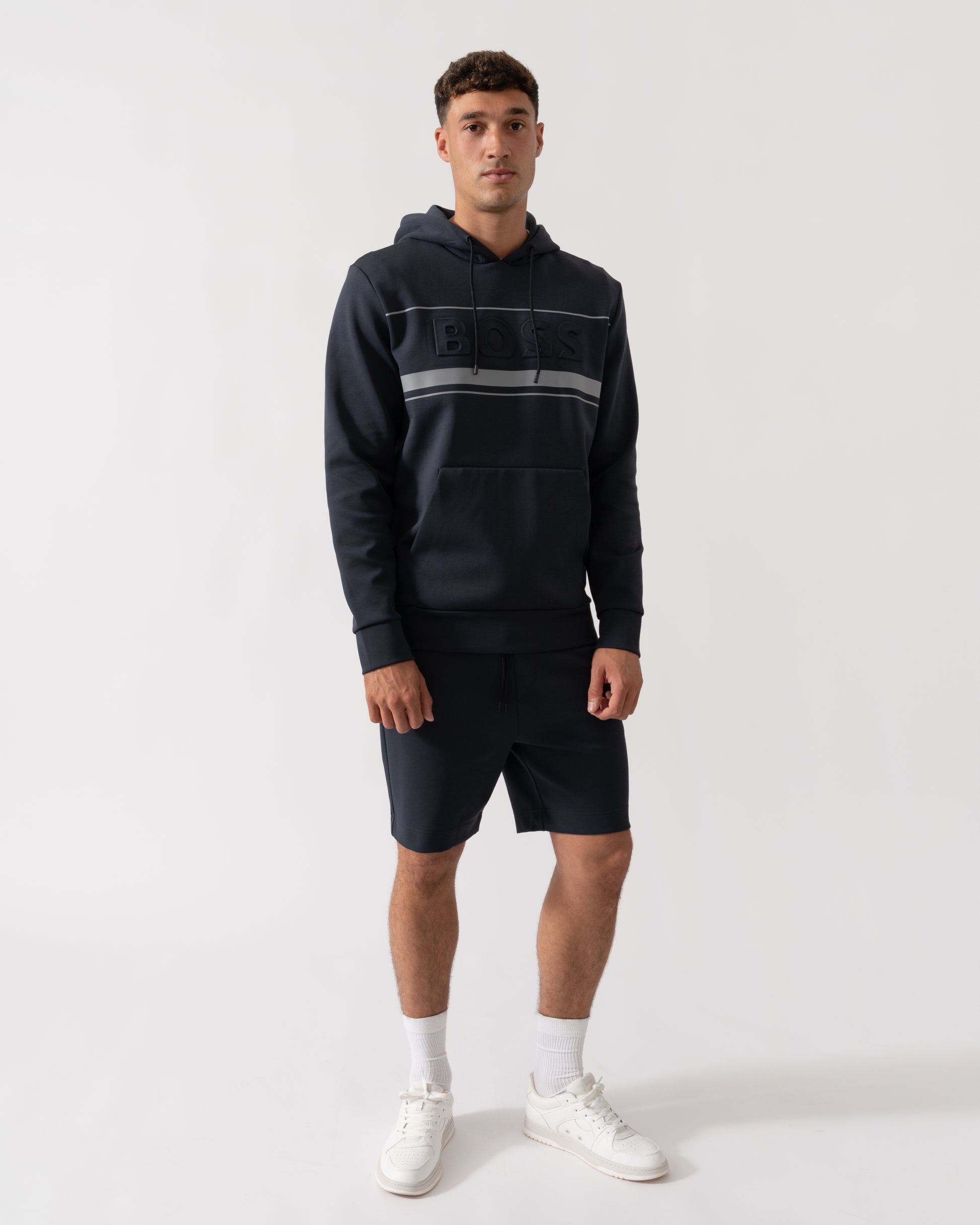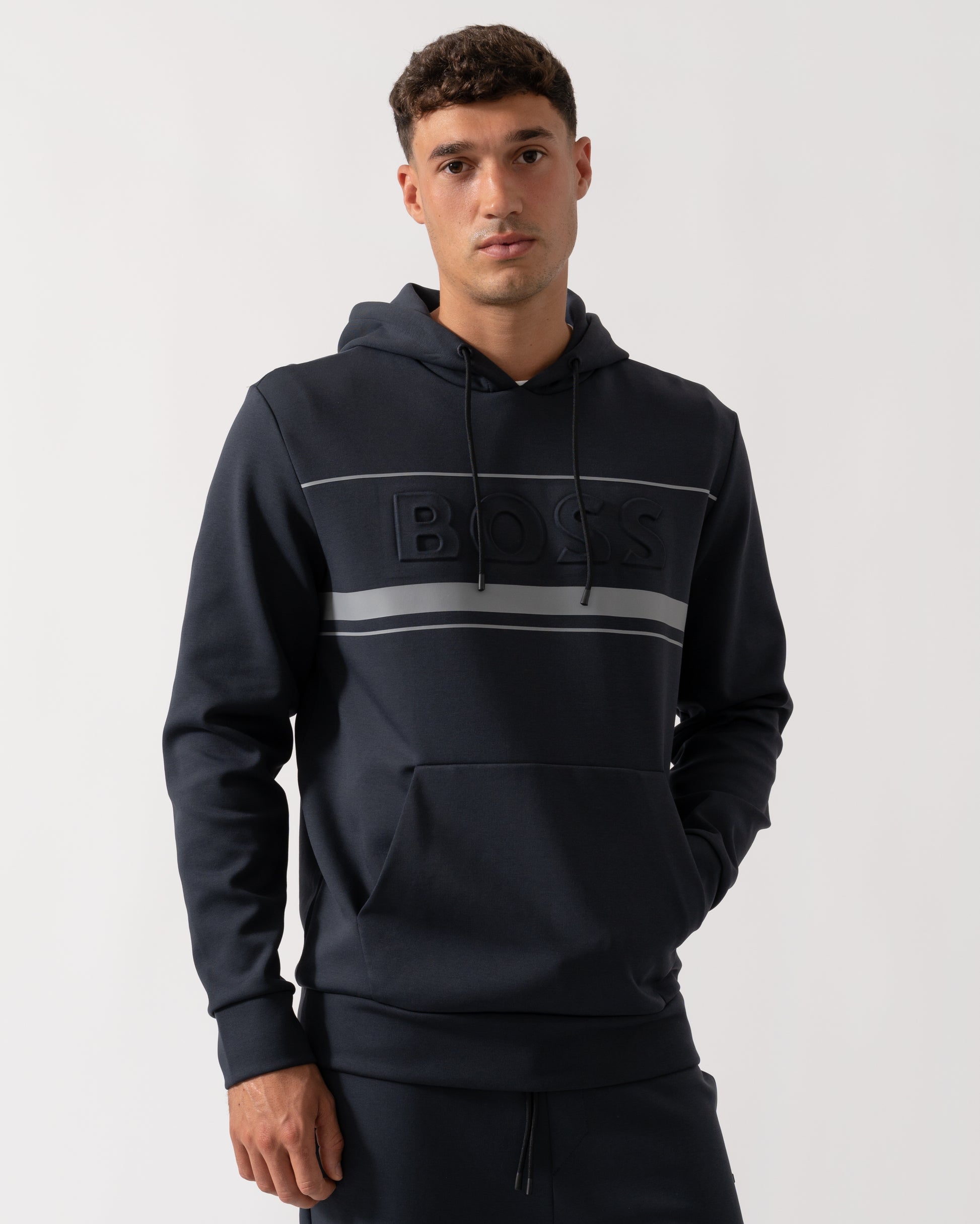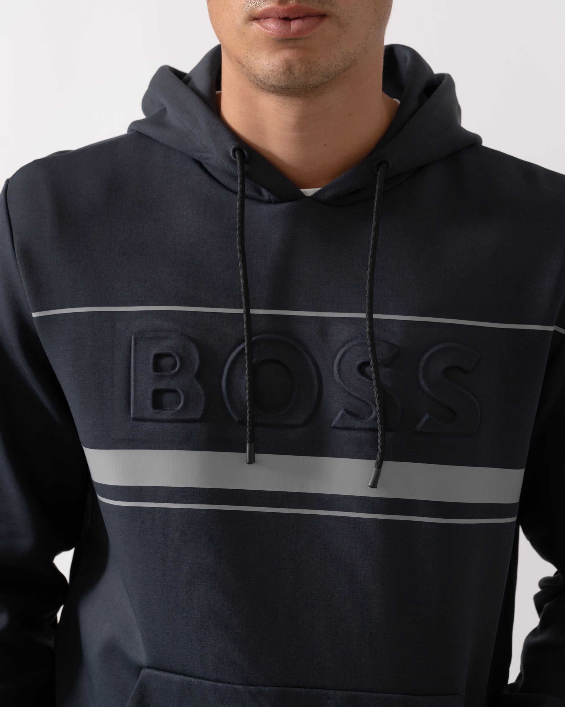 In cotton-blend interlock with stretch, this straight-fit BOSS Menswear hoodie is a modern casual layer. Moulded logo and sporty stripes.