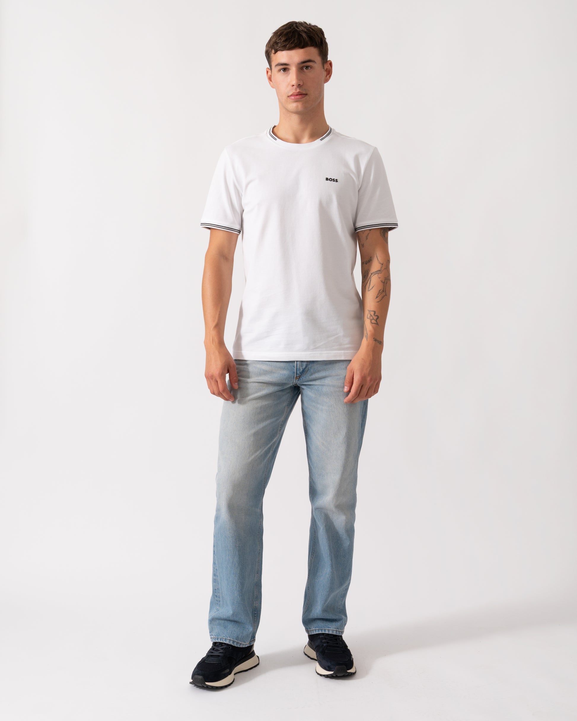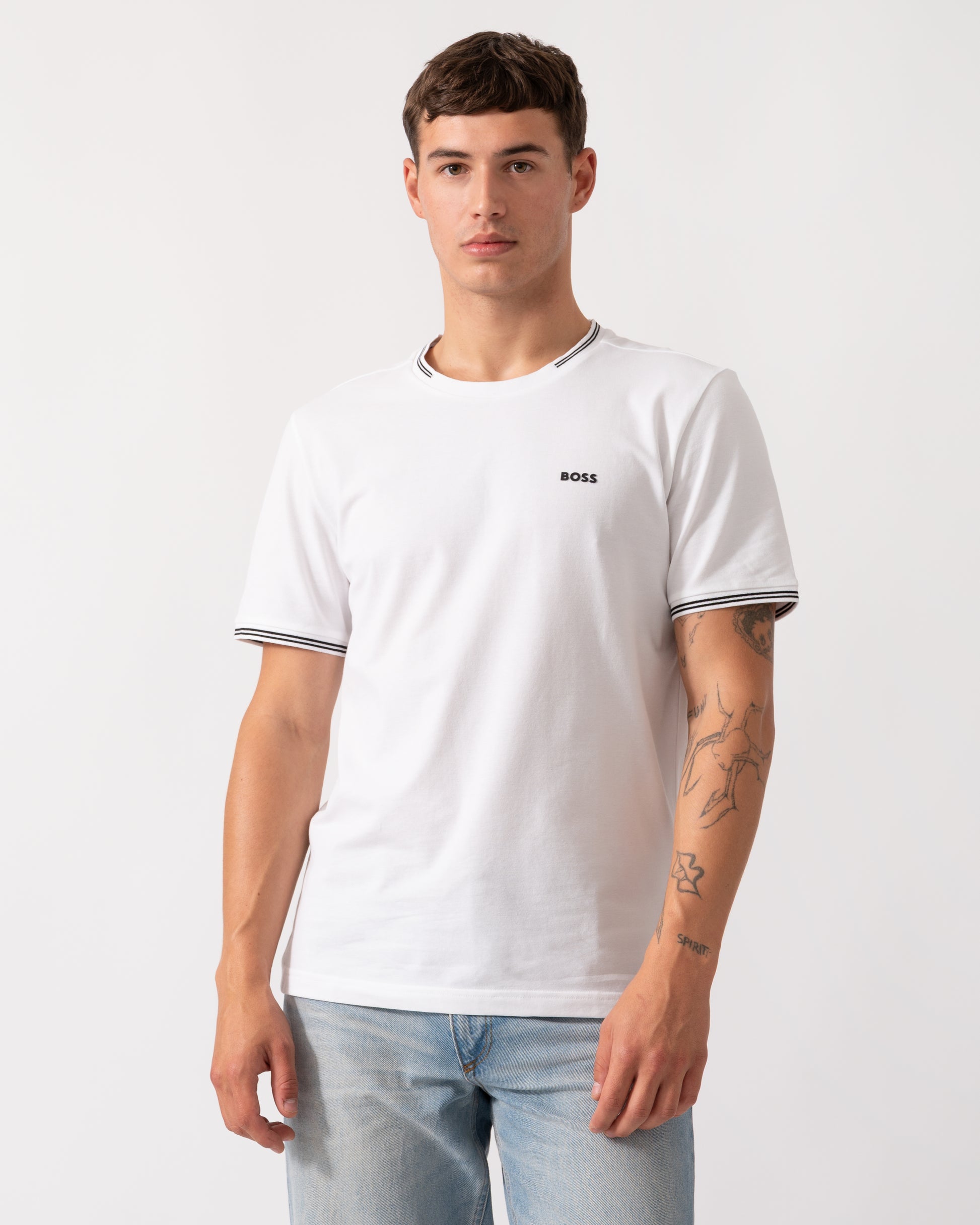 A regular-fit T-shirt by BOSS Menswear. Created in soft stretch-cotton piqué, this short-sleeved top is detailed with contrast stripes and branding.