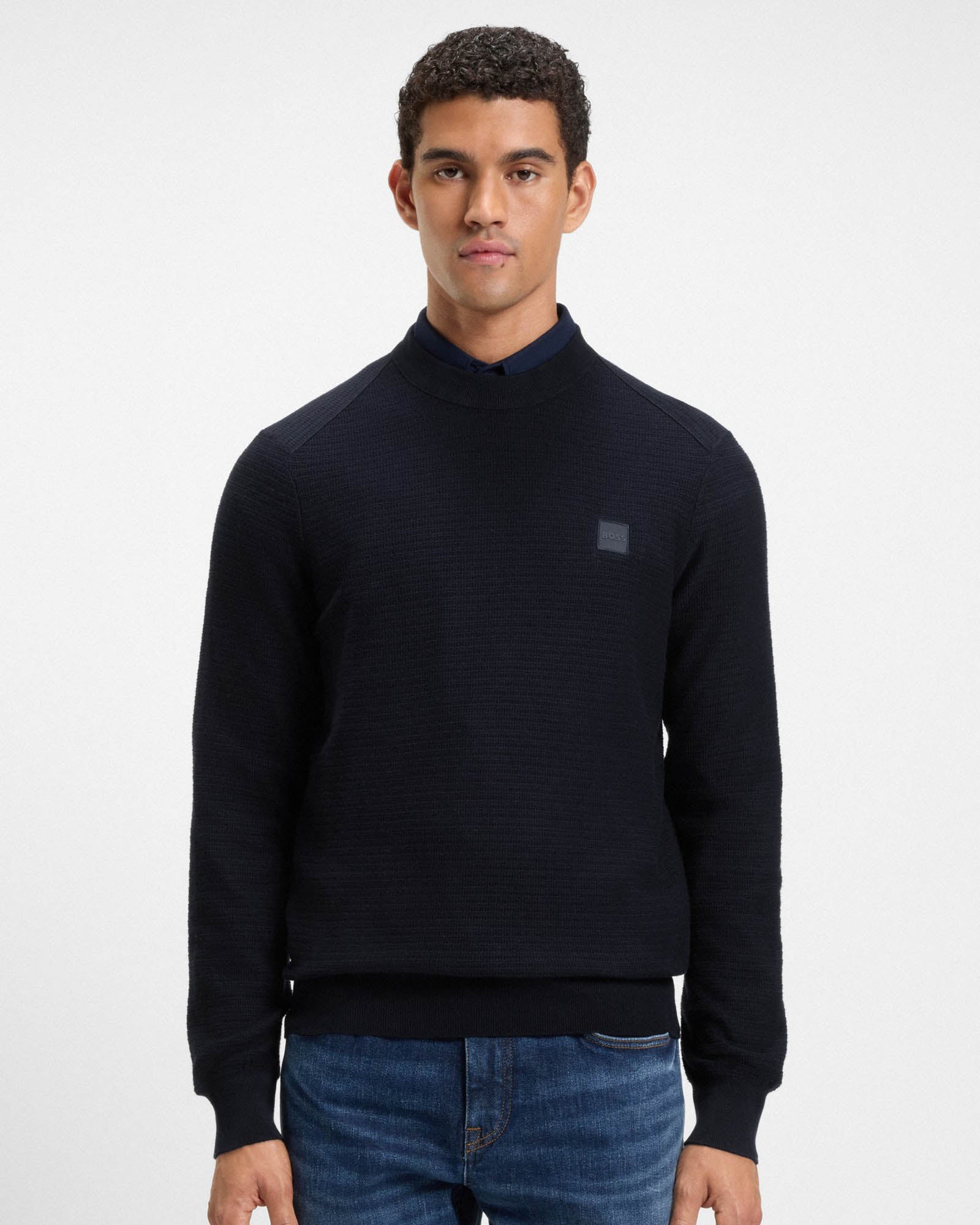 Knitted with a characterful structure, this BOSS Menswear sweater is crafted in soft cotton blended with luxurious cashmere. Logo patch at the chest. Regular fit.
