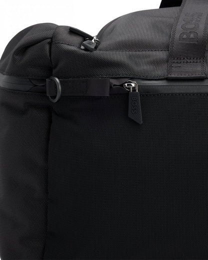 A multi-functional holdall with branded carry handles by BOSS. This spacious accessory features zipped pockets and backpack straps for versatility. This product is created with recycled polyester.