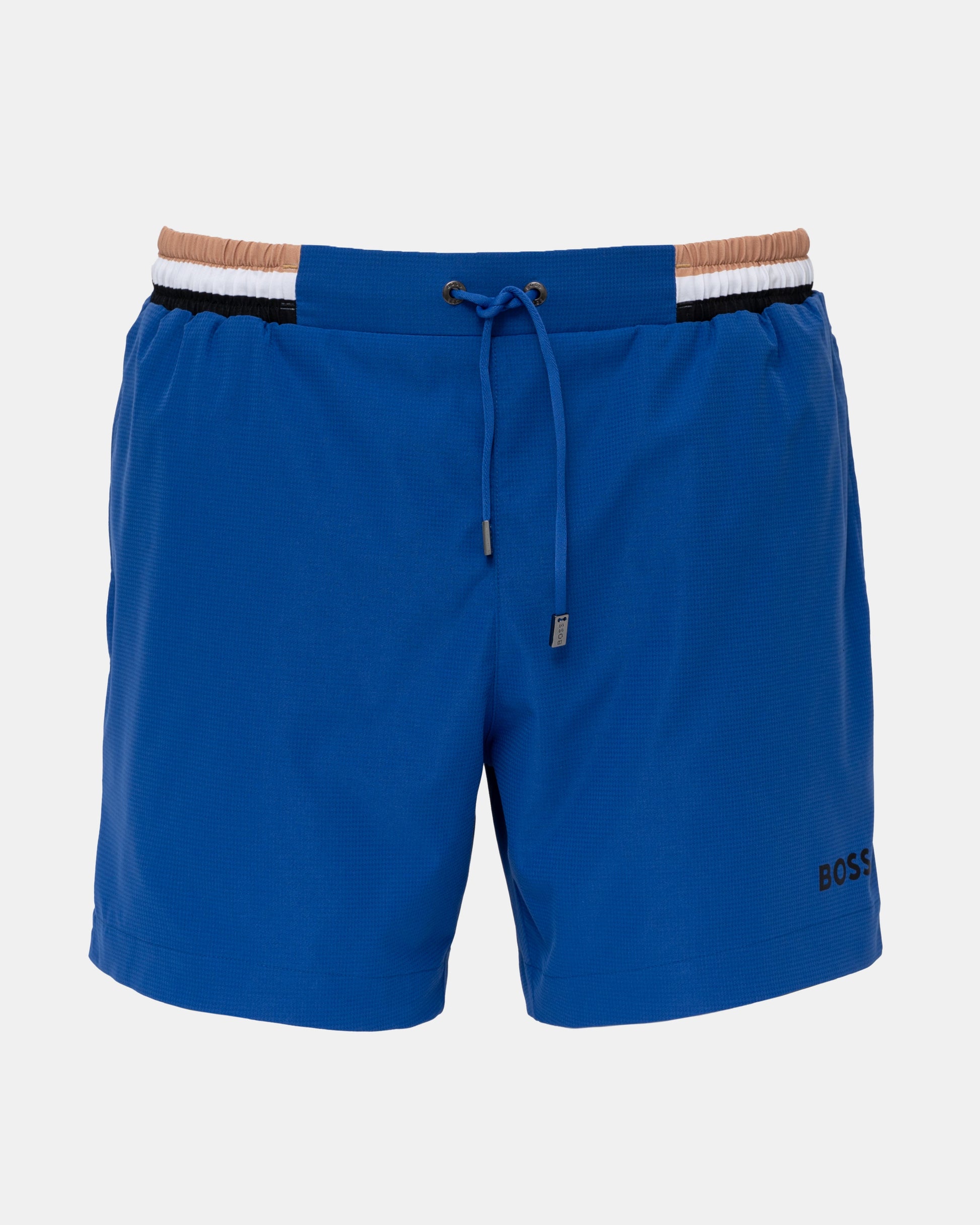 Sporty swim shorts in ripstop fabric by BOSS. Topped with an elasticated waistband carrying a signature stripe, these fully lined swim shorts are printed with a contrast BOSS logo at the left leg. Branded tips add further distinction at the drawcord.