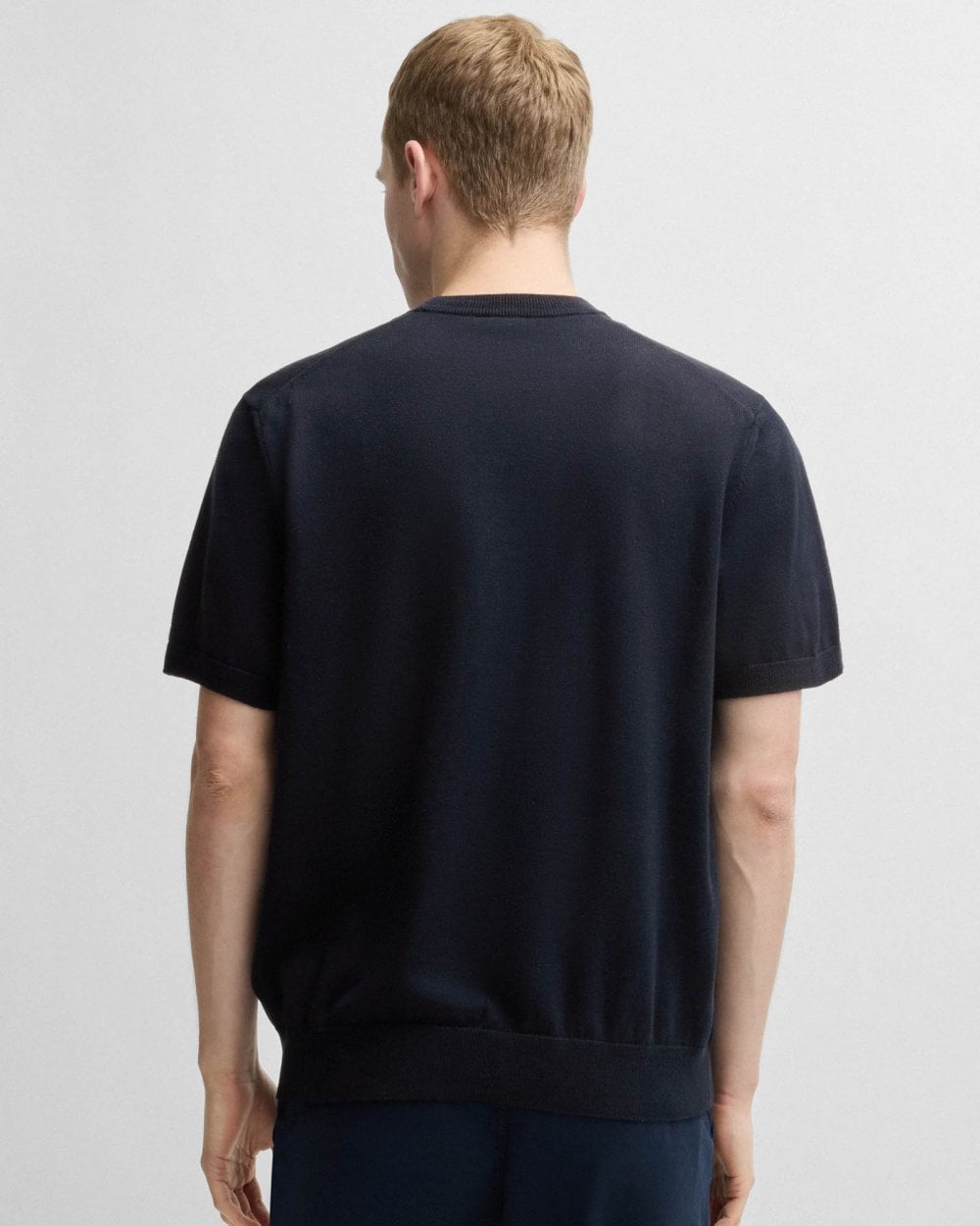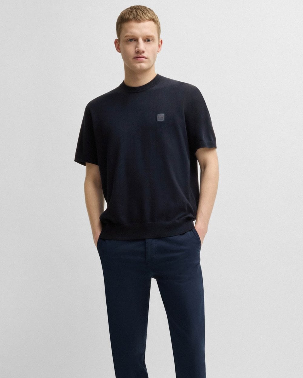 Knitted in lightweight cotton with luxurious cashmere, this BOSS Menswear T-shirt has a comfortable, relaxed fit for easygoing style. Refined tonal satin logo patch. This product is partly made with organic cotton.