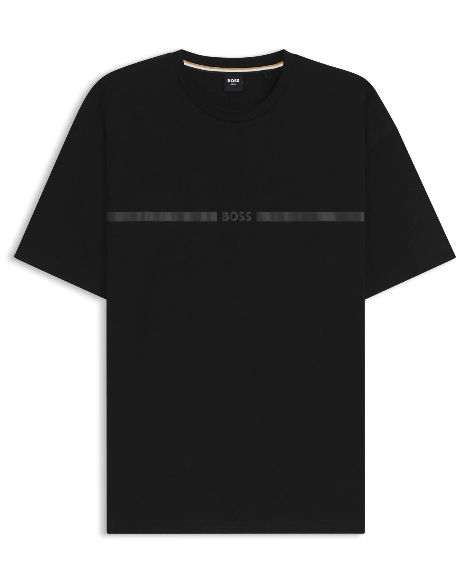 A short-sleeved beach T-shirt by BOSS Menswear. Featuring a stripe and logo in a metallic effect at the chest, this easy-wear T-shirt is cut to a regular fit in pure cotton for everyday comfort. The fabric has been treated with UV protection for safety in the sun.