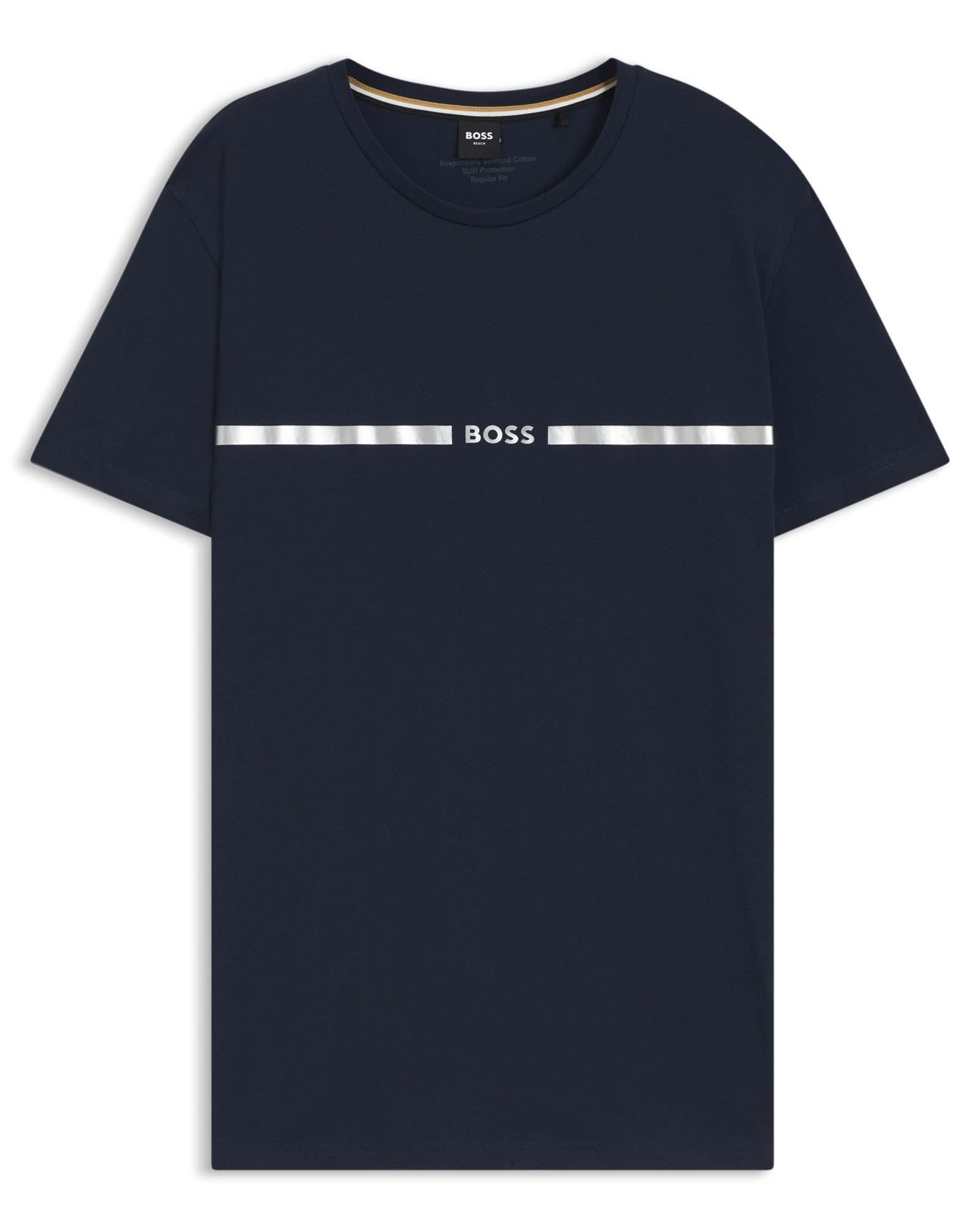 A short-sleeved beach T-shirt by BOSS Menswear. Featuring a stripe and logo in a metallic effect at the chest, this easy-wear T-shirt is cut to a regular fit in pure cotton for everyday comfort. The fabric has been treated with UV protection for safety in the sun.