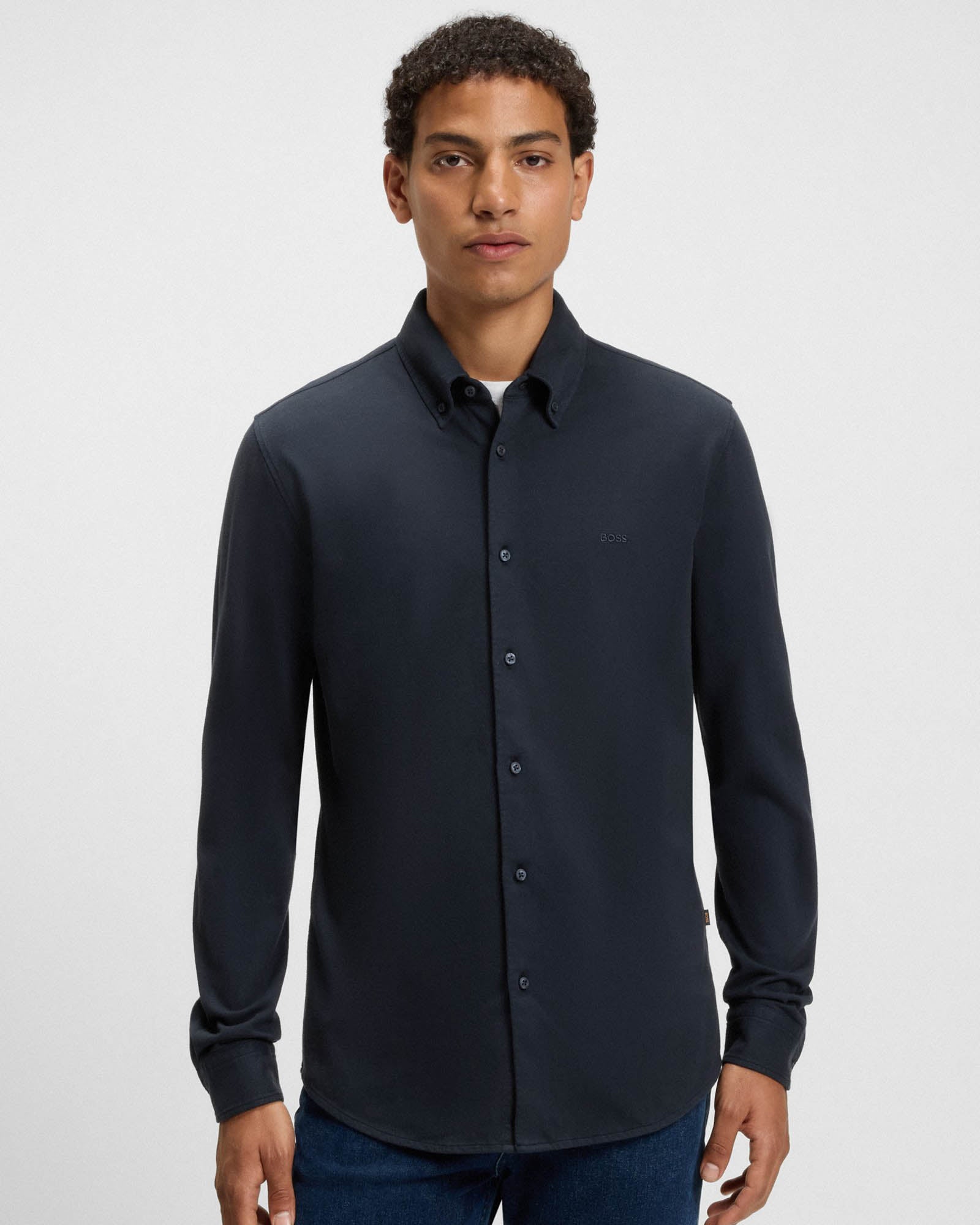 Cut to a clean slim fit, this BOSS Menswear shirt is made in extra-soft cotton jersey for comfort. Embroidered logo. Button-down collar.