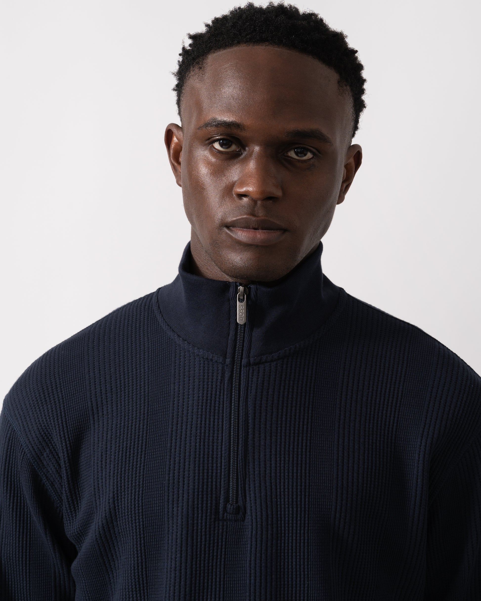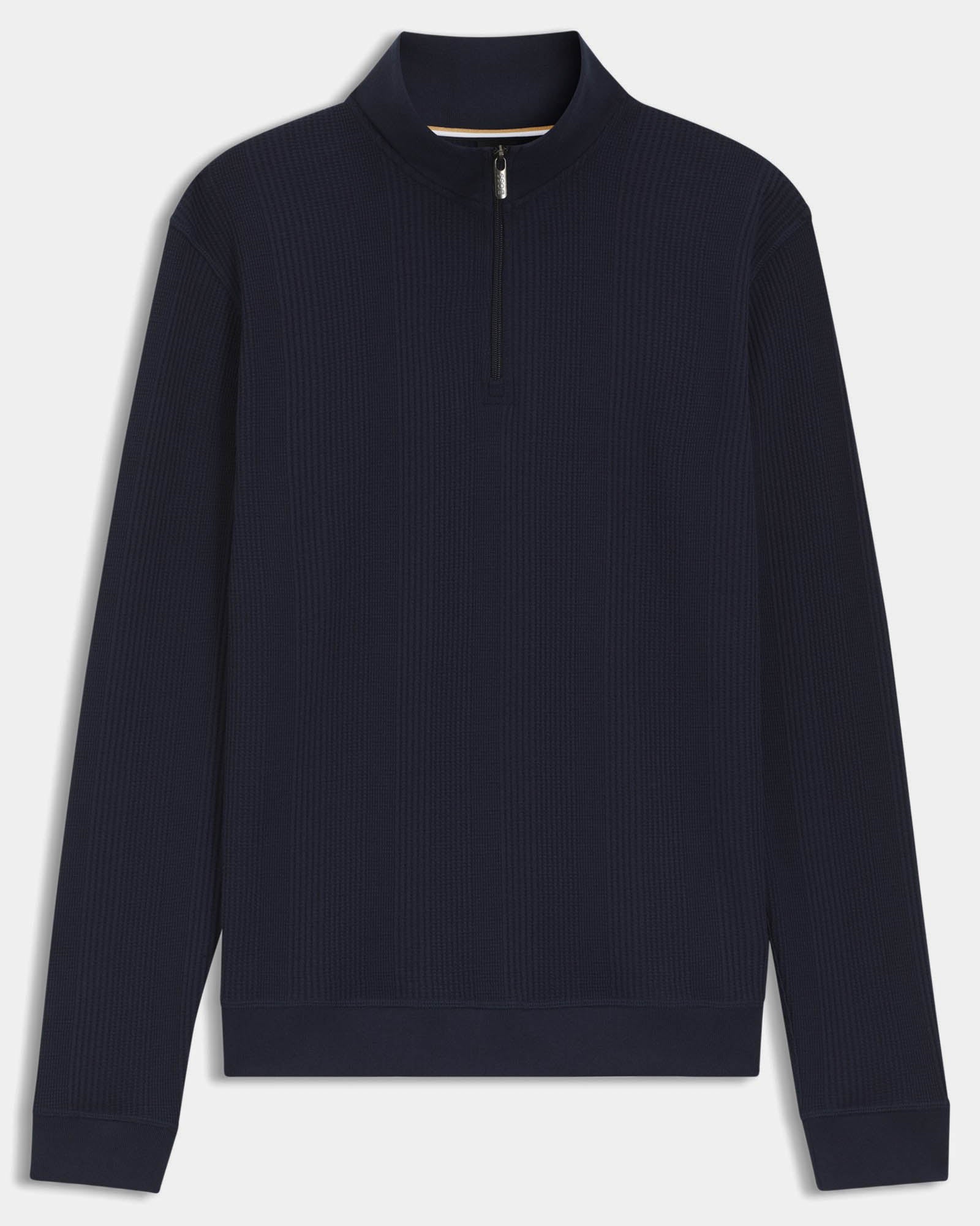 With a quarter zip and rich waffle jacquard, this BOSS Menswear sweatshirt is a luxurious layer for downtime. Cut to a straight fit.