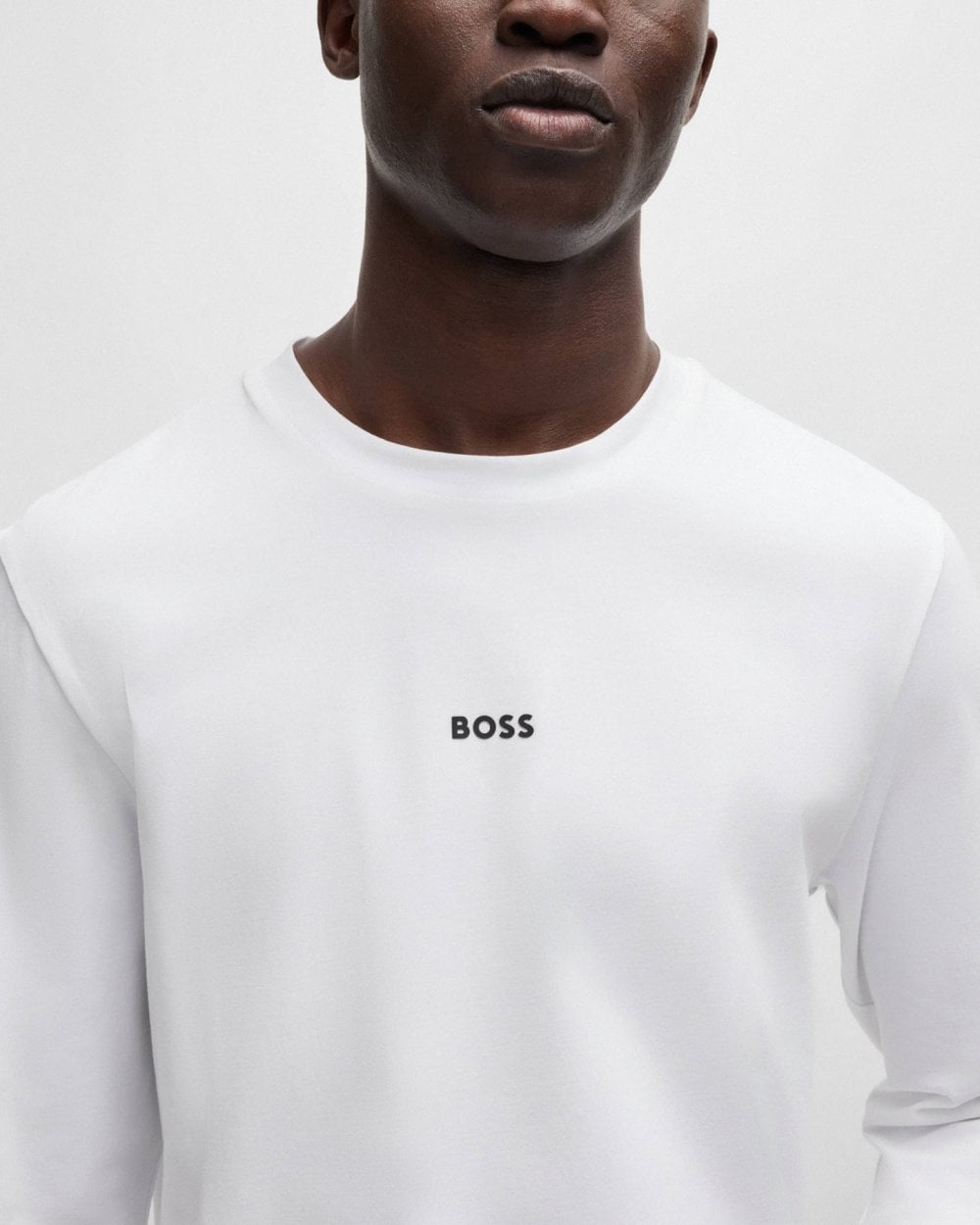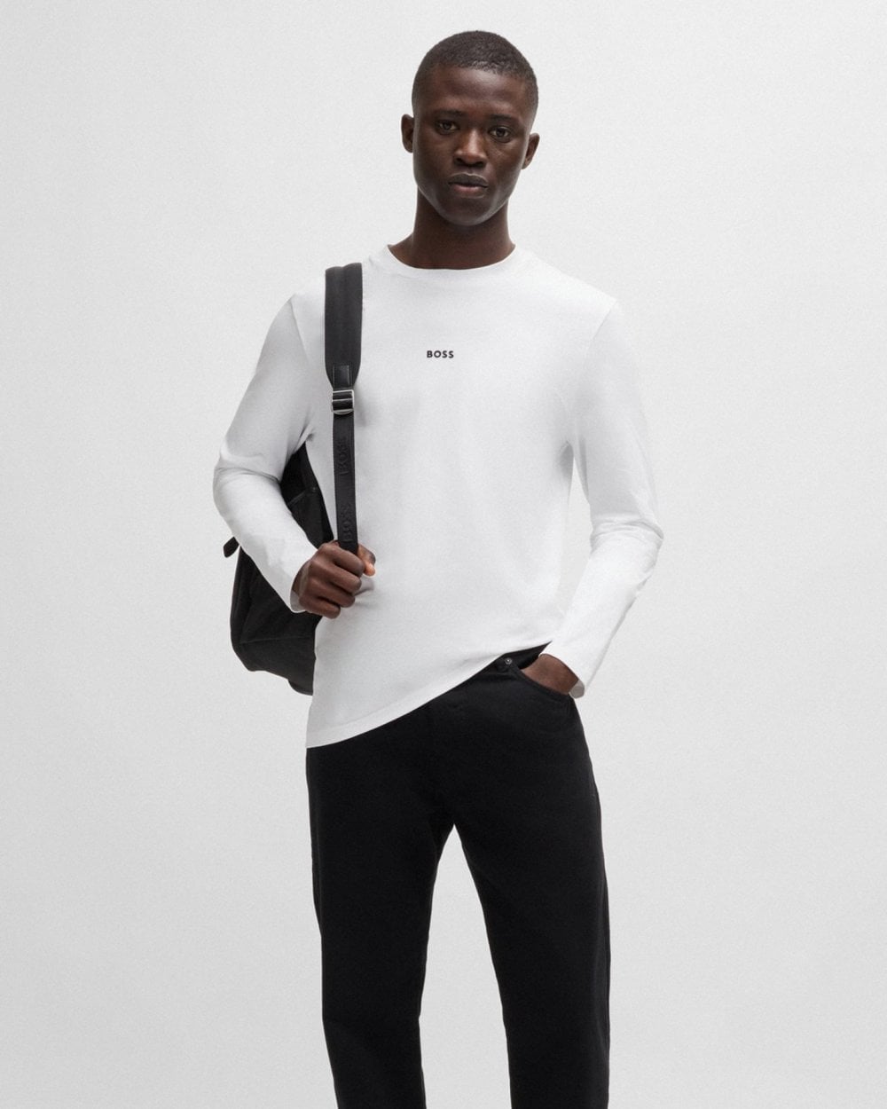 Featuring a contrast logo in a rubberised seven-layer print, this contemporary T-shirt by BOSS Menswear is created in stretch cotton for easy-wear appeal.