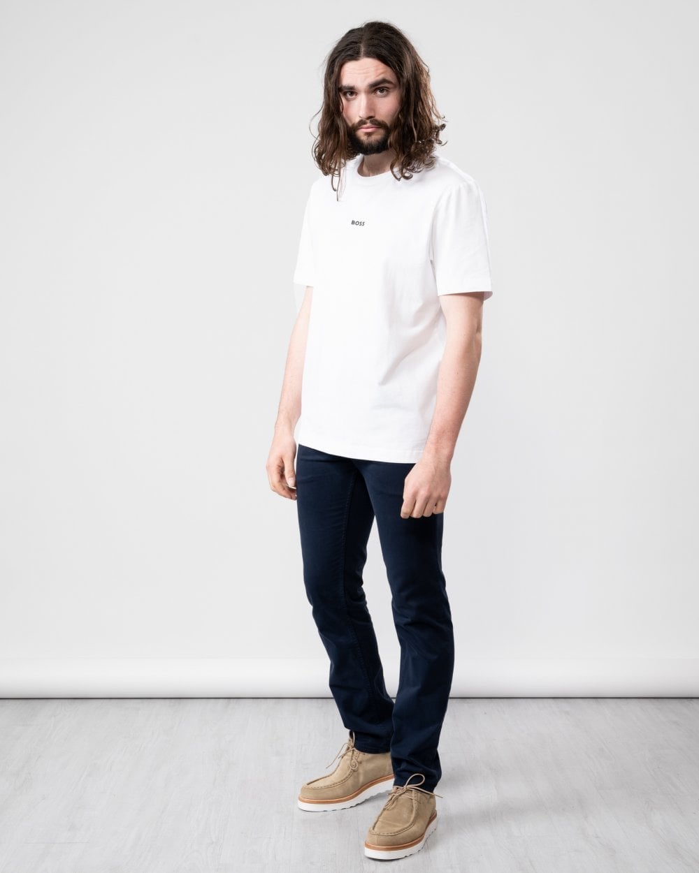 A casual T-shirt cut to a relaxed fit, by BOSS Menswear. Printed with a seven-layer logo at the centre chest, this short-sleeved T-shirt is crafted in soft cotton blended with stretch.
