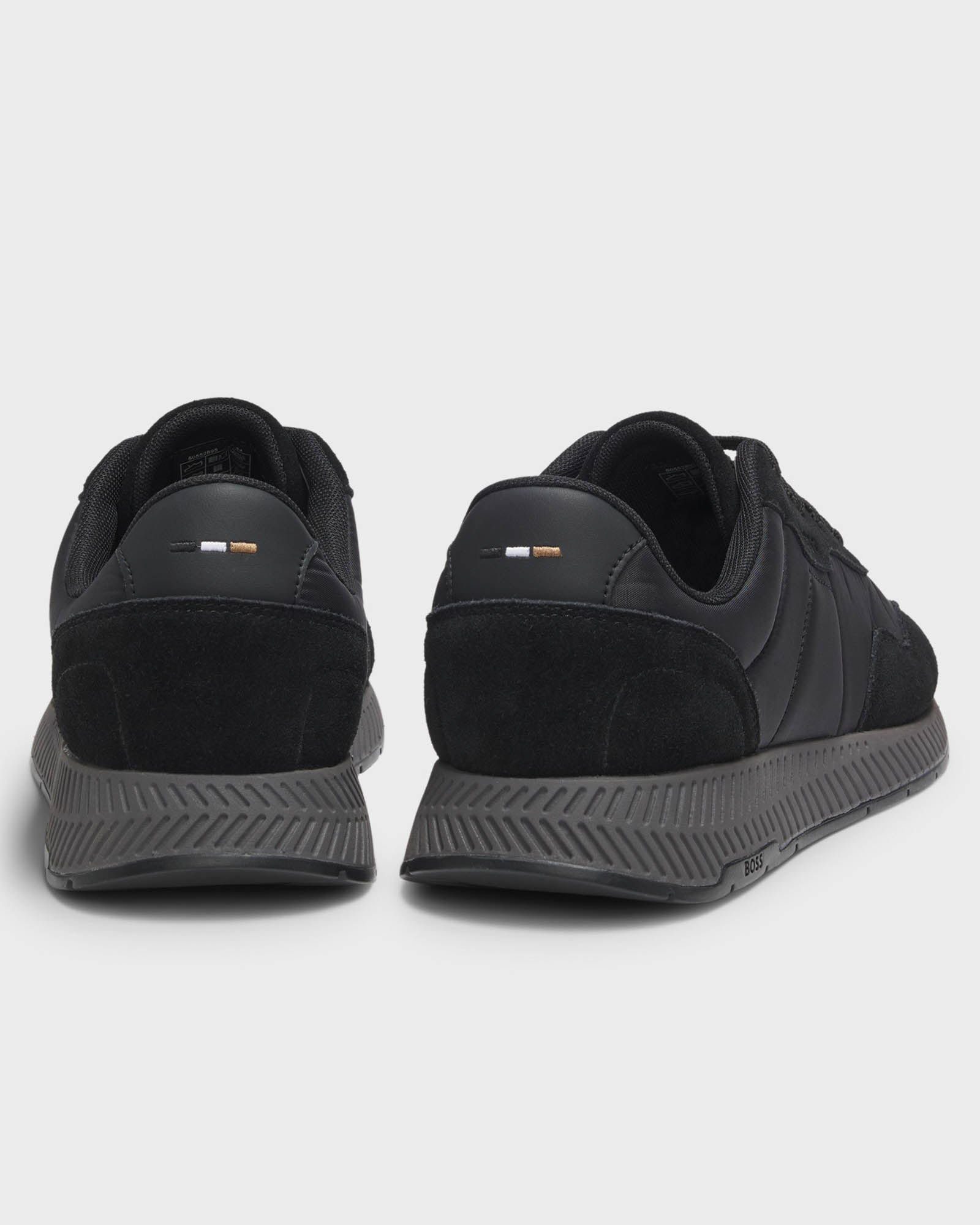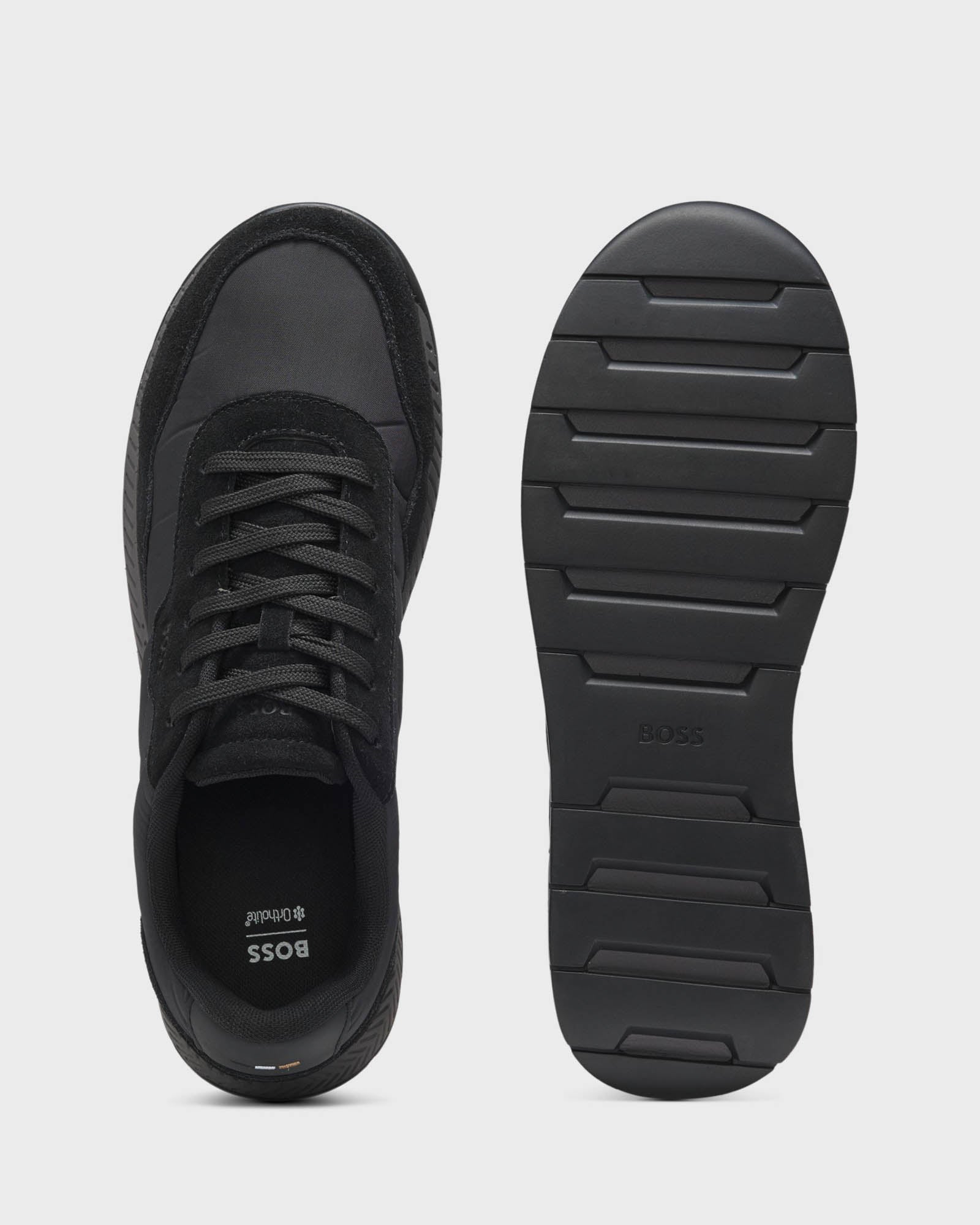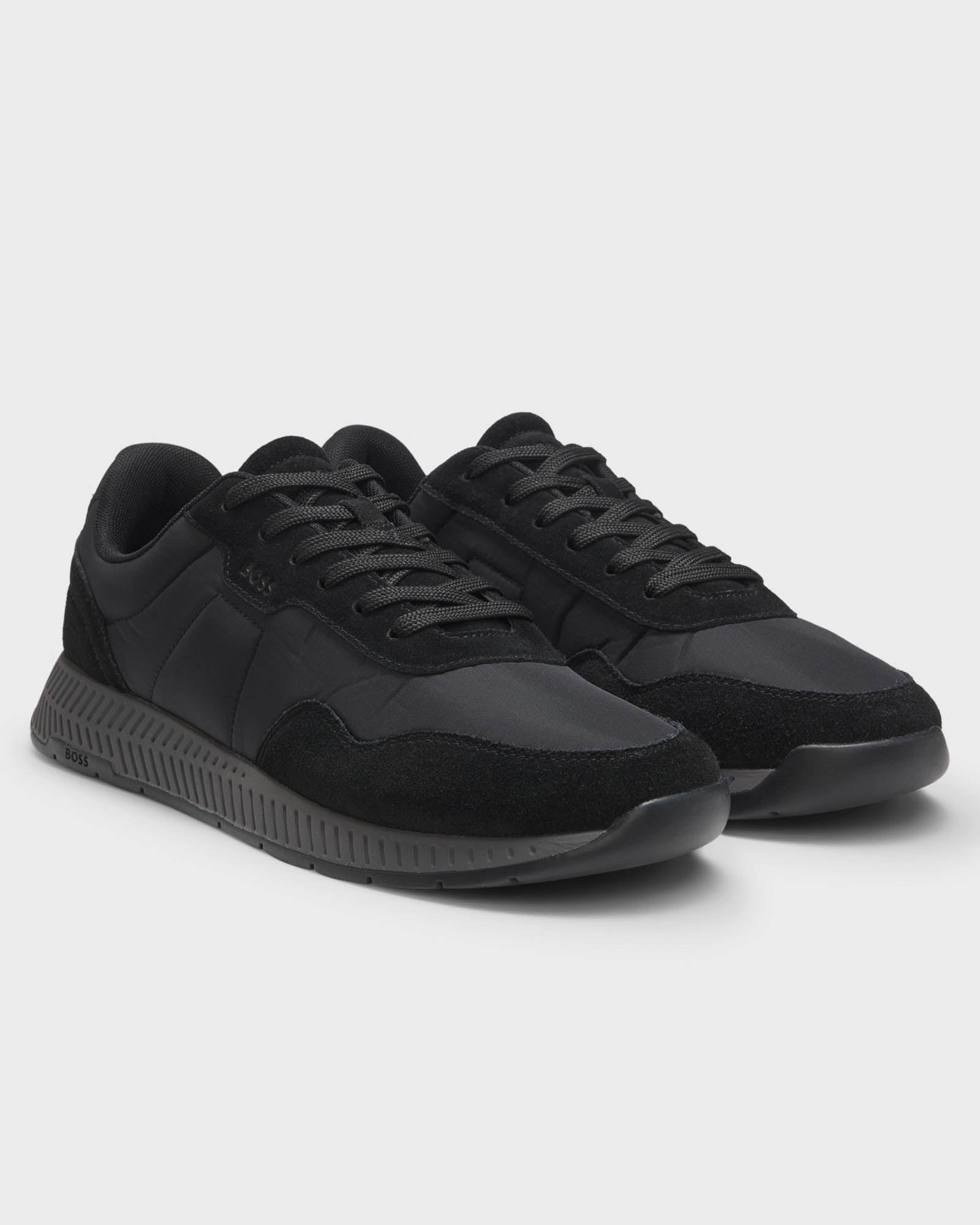 Featuring padded uppers in matte nylon with soft suede facings, these BOSS Menswear trainers add sporty appeal to any look. Distinctive ribbed outsole.