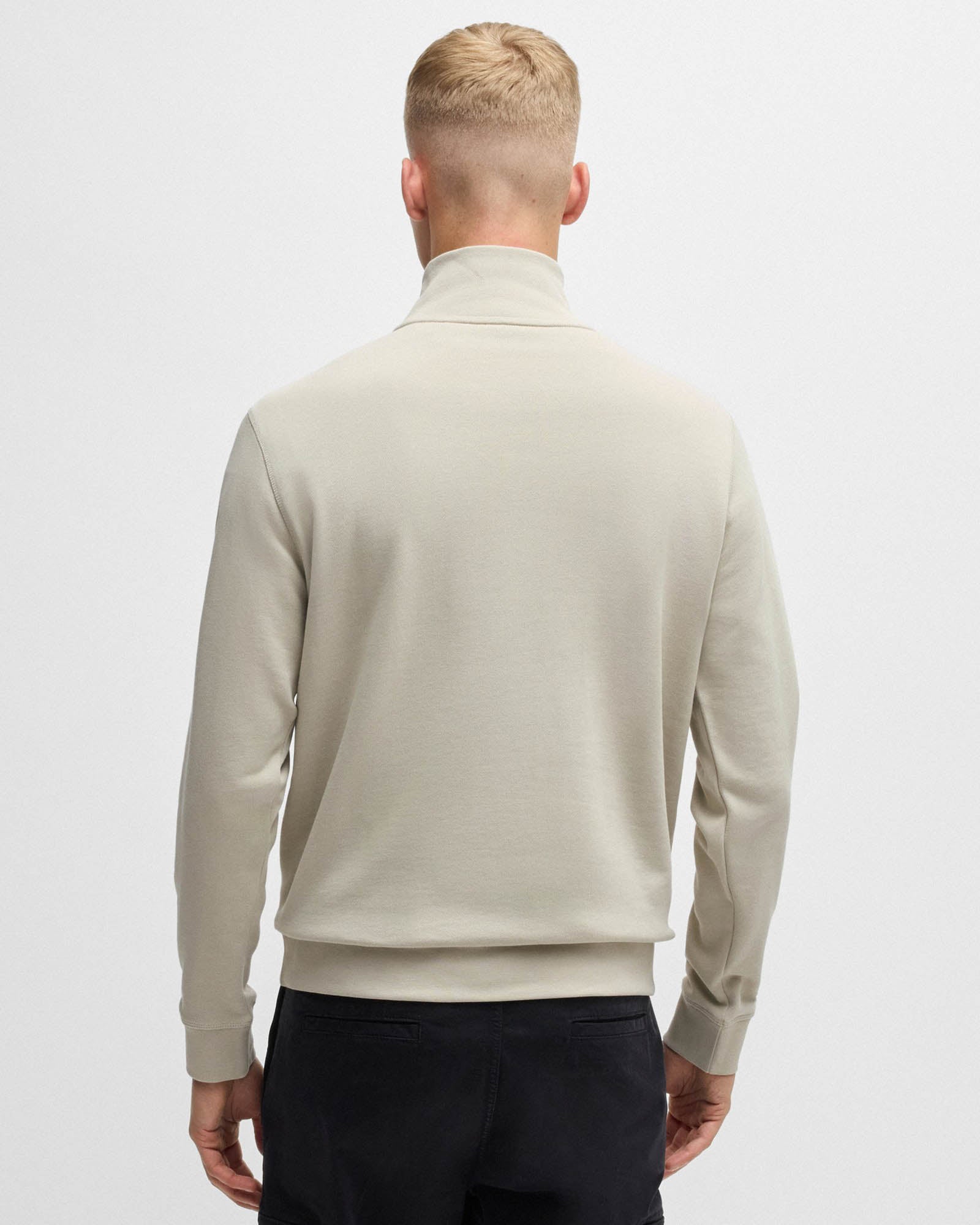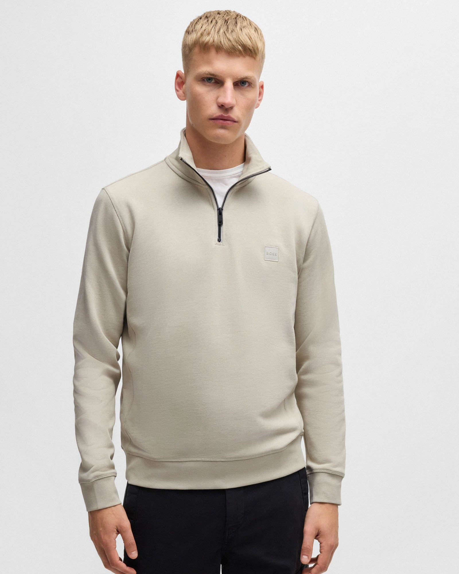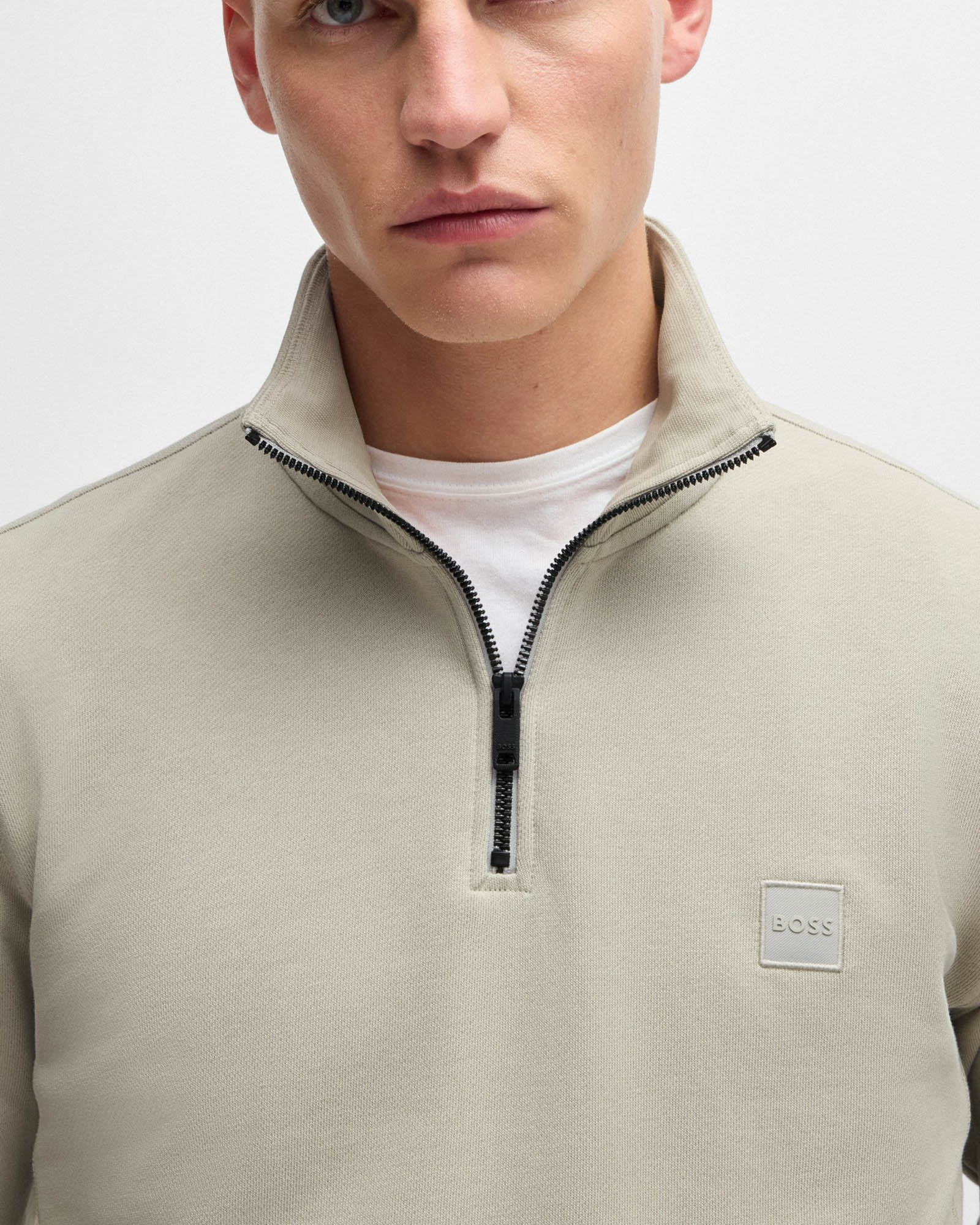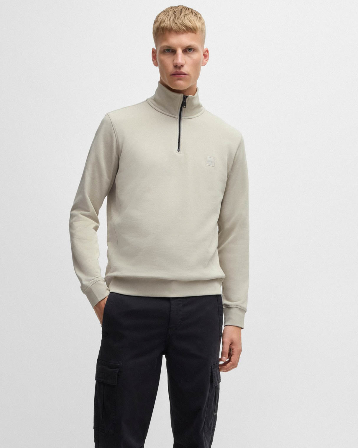 A masculine sweatshirt by BOSS Menswear. Featuring a tonal logo patch at the left chest, this signature sweatshirt is cut to a regular fit in French terry and topped with a zipped neckline.