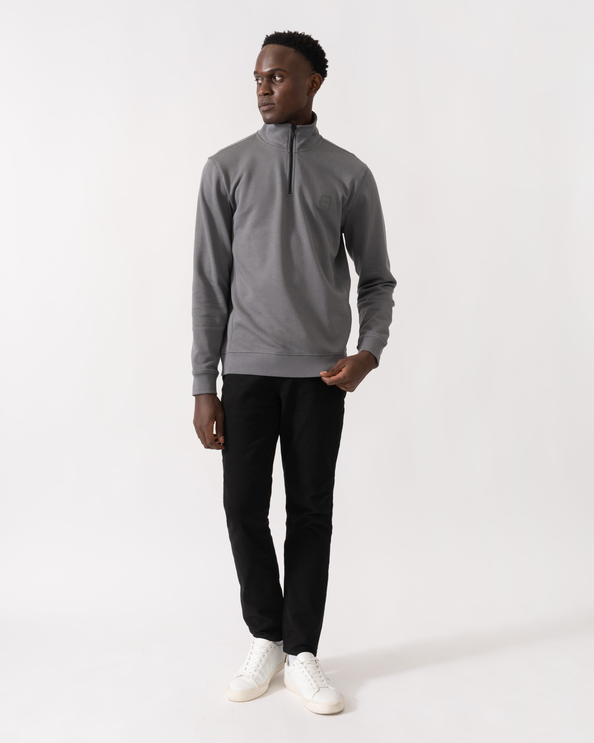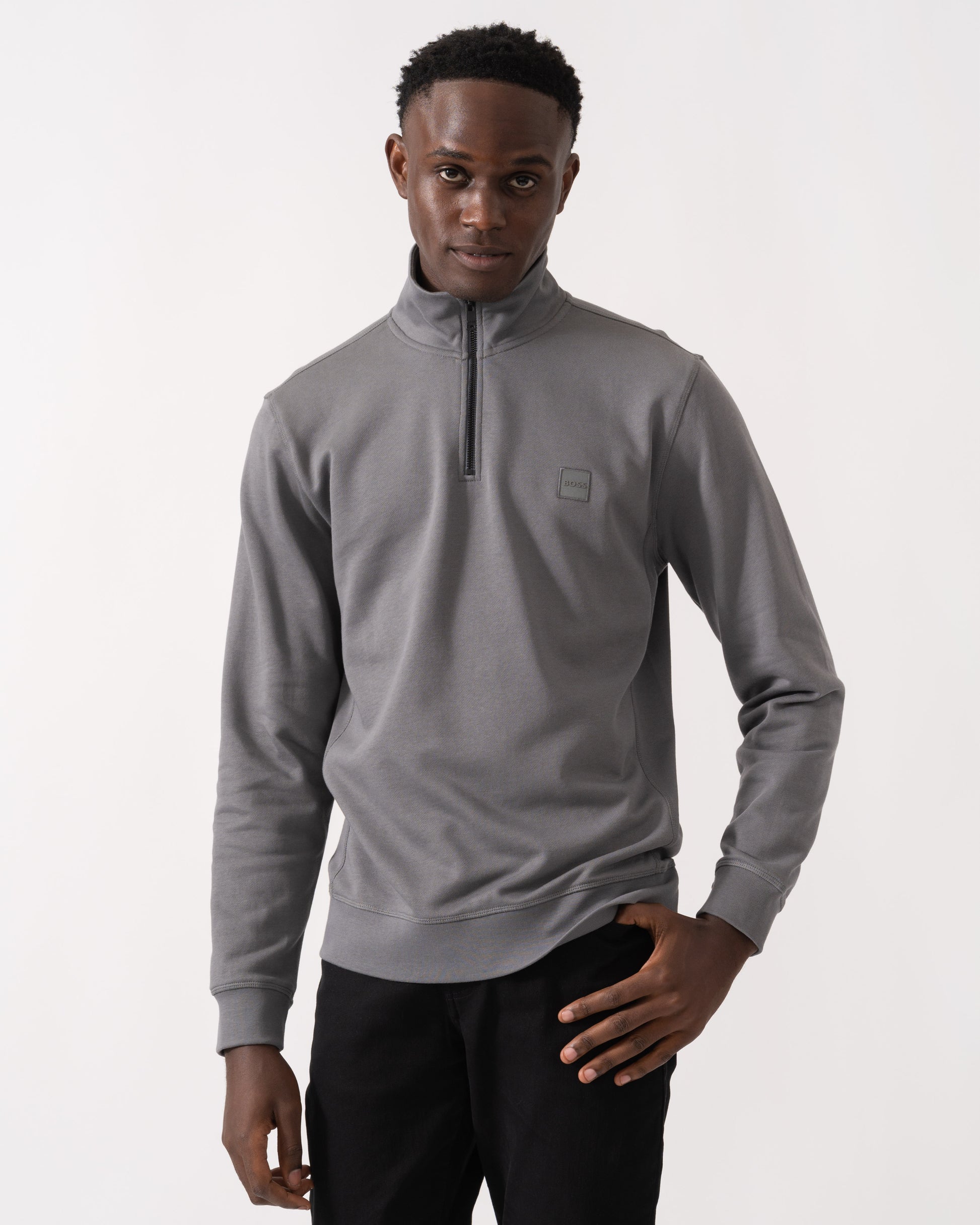 A masculine sweatshirt by BOSS Menswear. Featuring a tonal logo patch at the left chest, this signature sweatshirt is cut to a regular fit in French terry and topped with a zipped neckline.