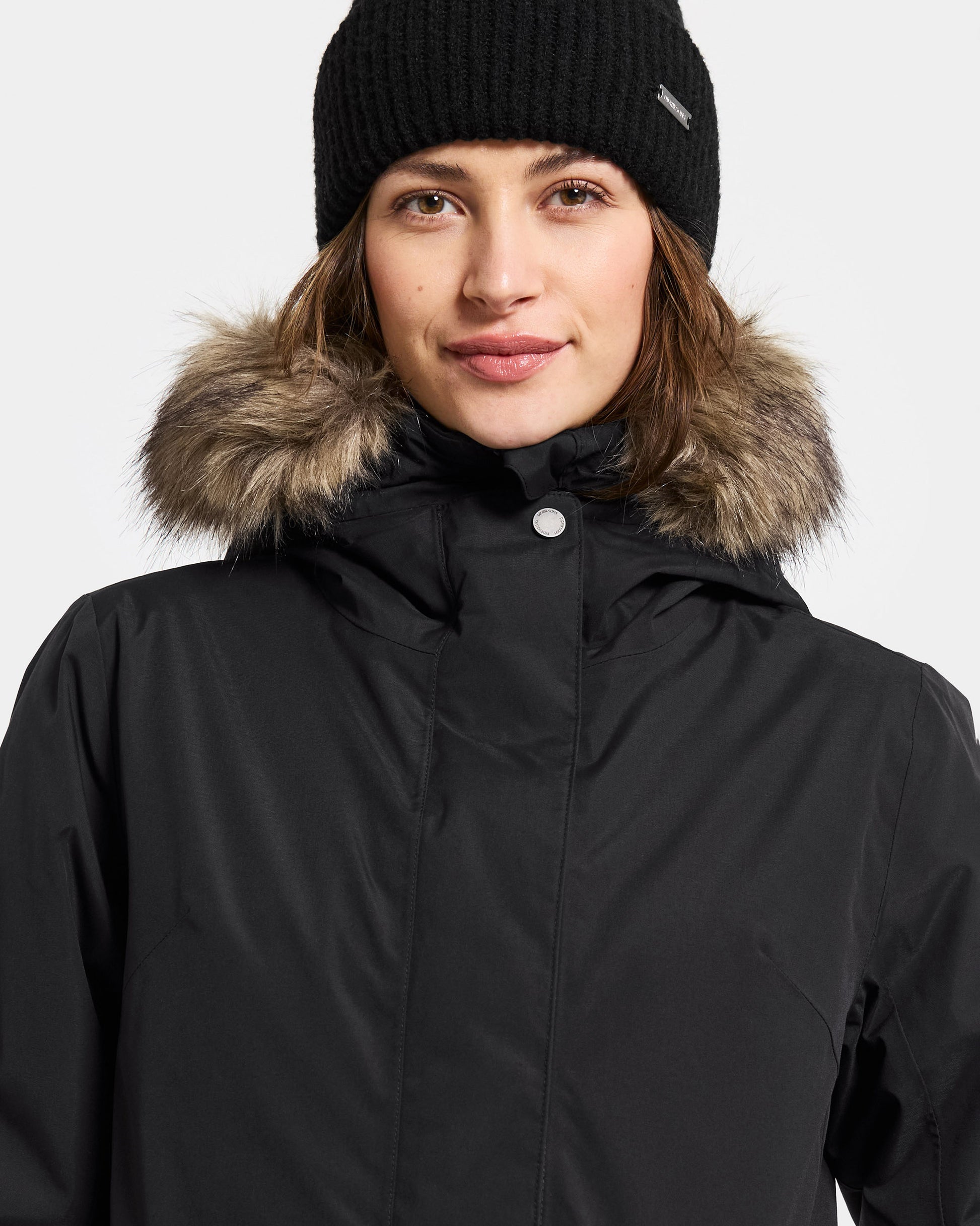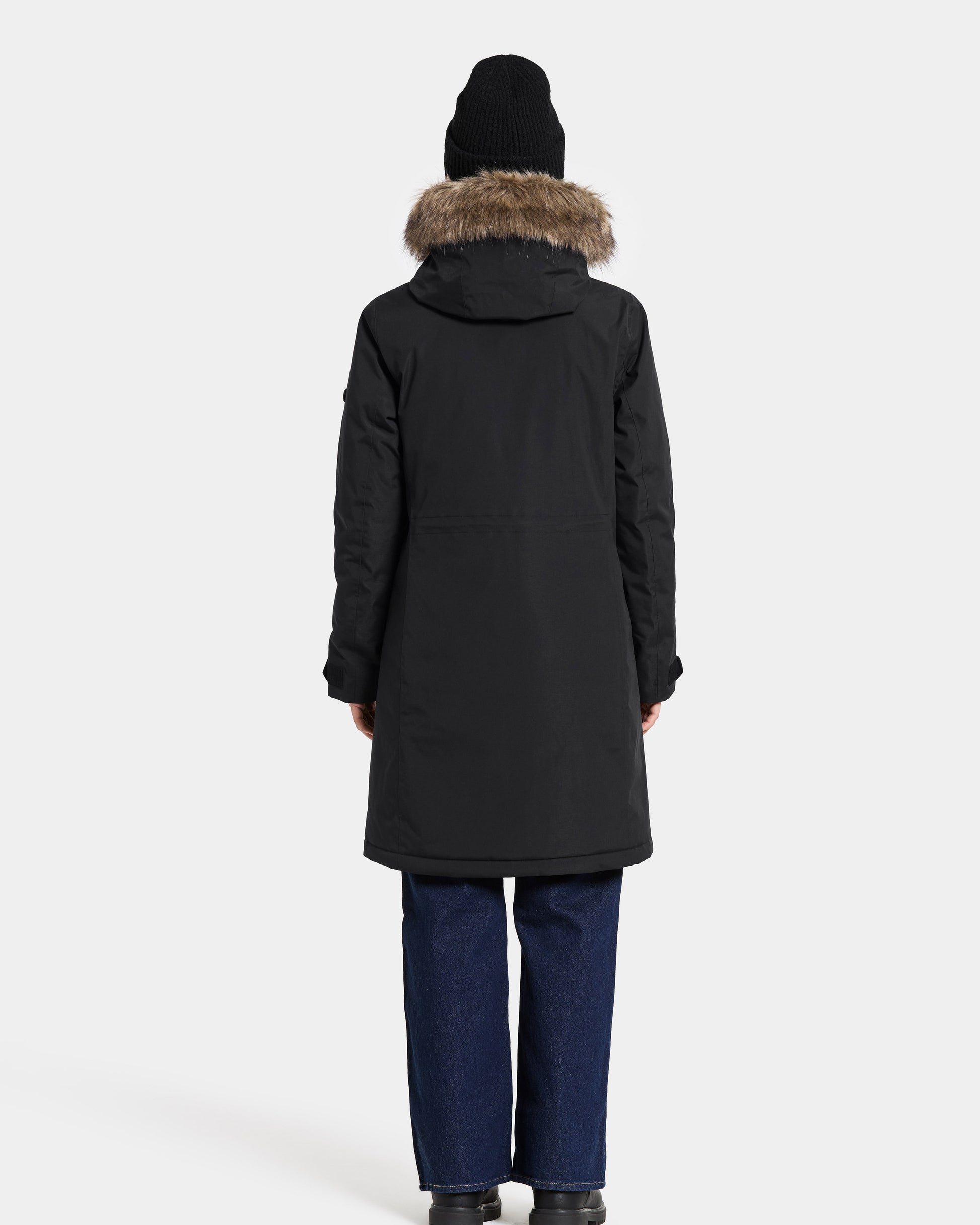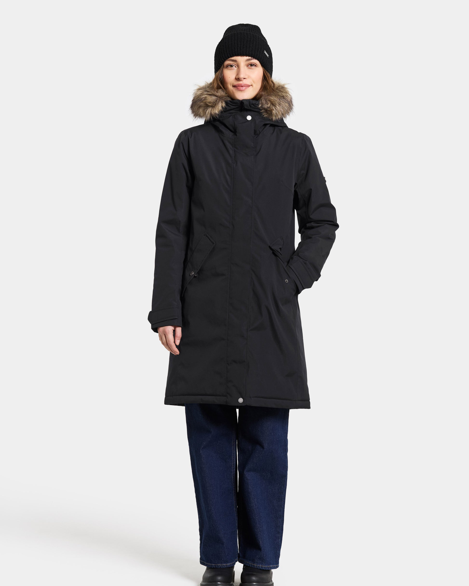 Erna is a warm parka with a feminine fit, perfect for everyday use. It is water- and windproof with taped seams and made from a breathable material, making it ideal for all weather conditions. The parka features a detachable synthetic fur on the hood and an adjustable waist with a drawstring for a personalised fit.