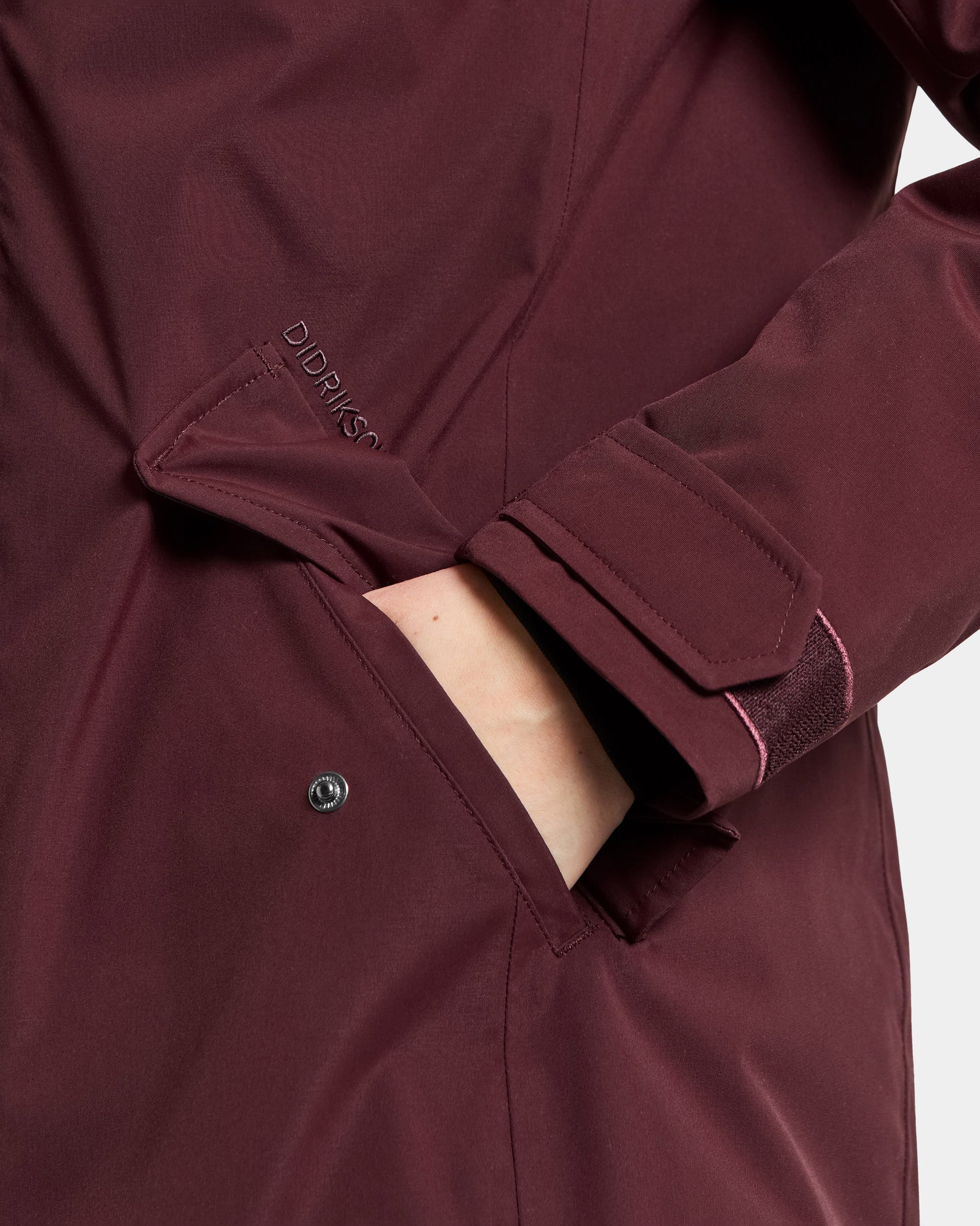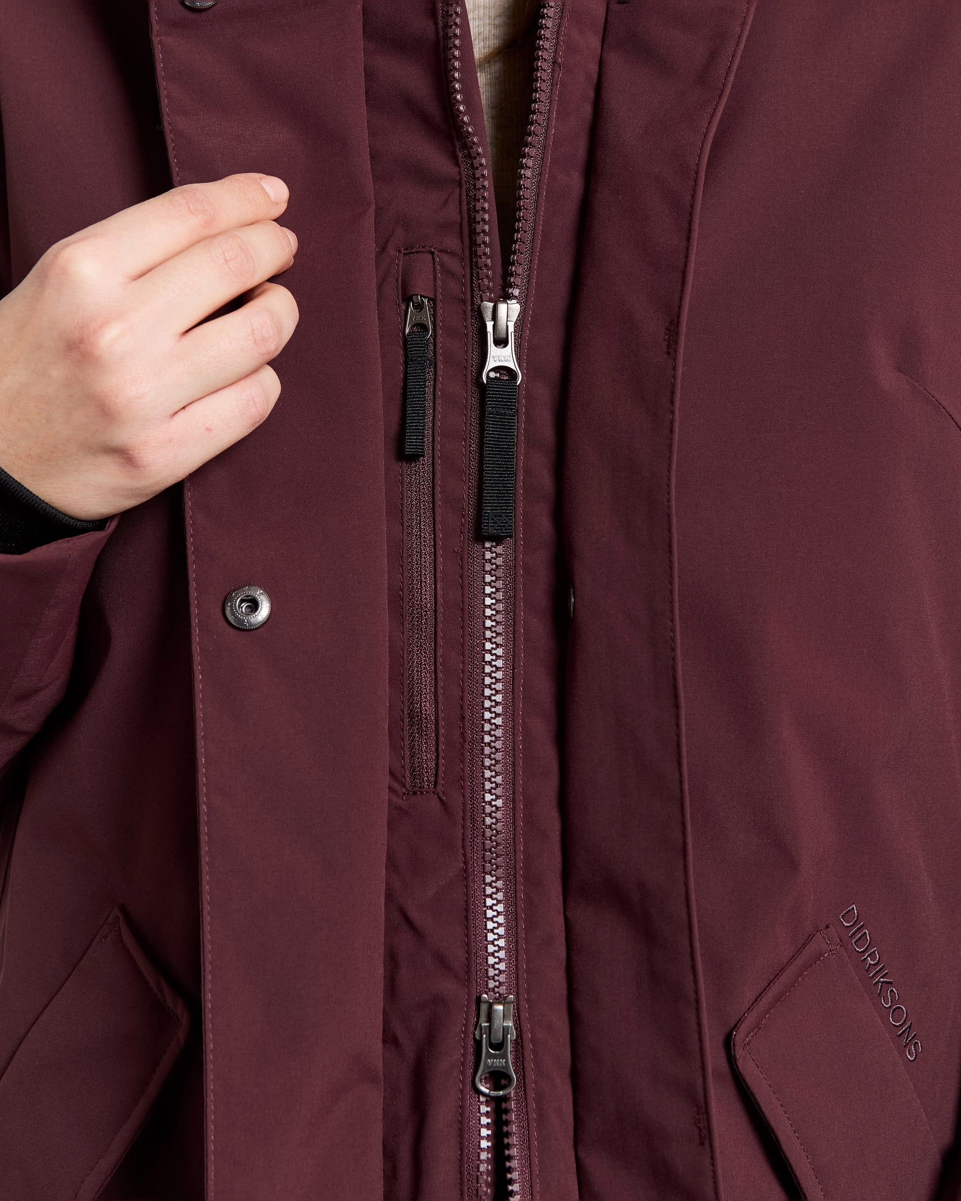 It has a two-way zip at the front, protected by a placket with buttons, and the zip never lies directly against the chin thanks to the collar's design. The side pockets close with buttons and the cuffs are adjustable with Velcro and have elastic cuffs on the inside for extra comfort.