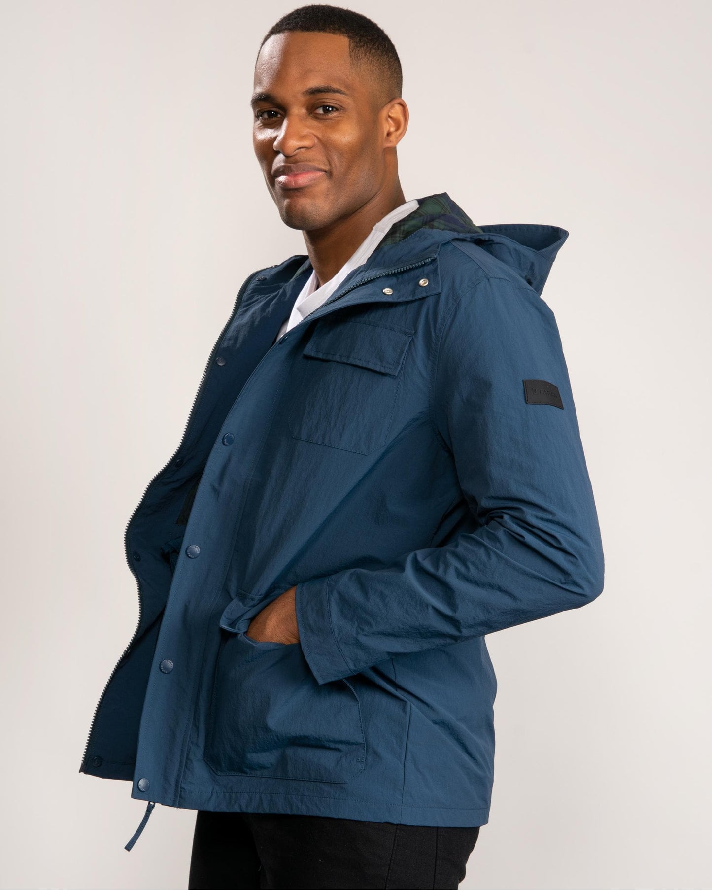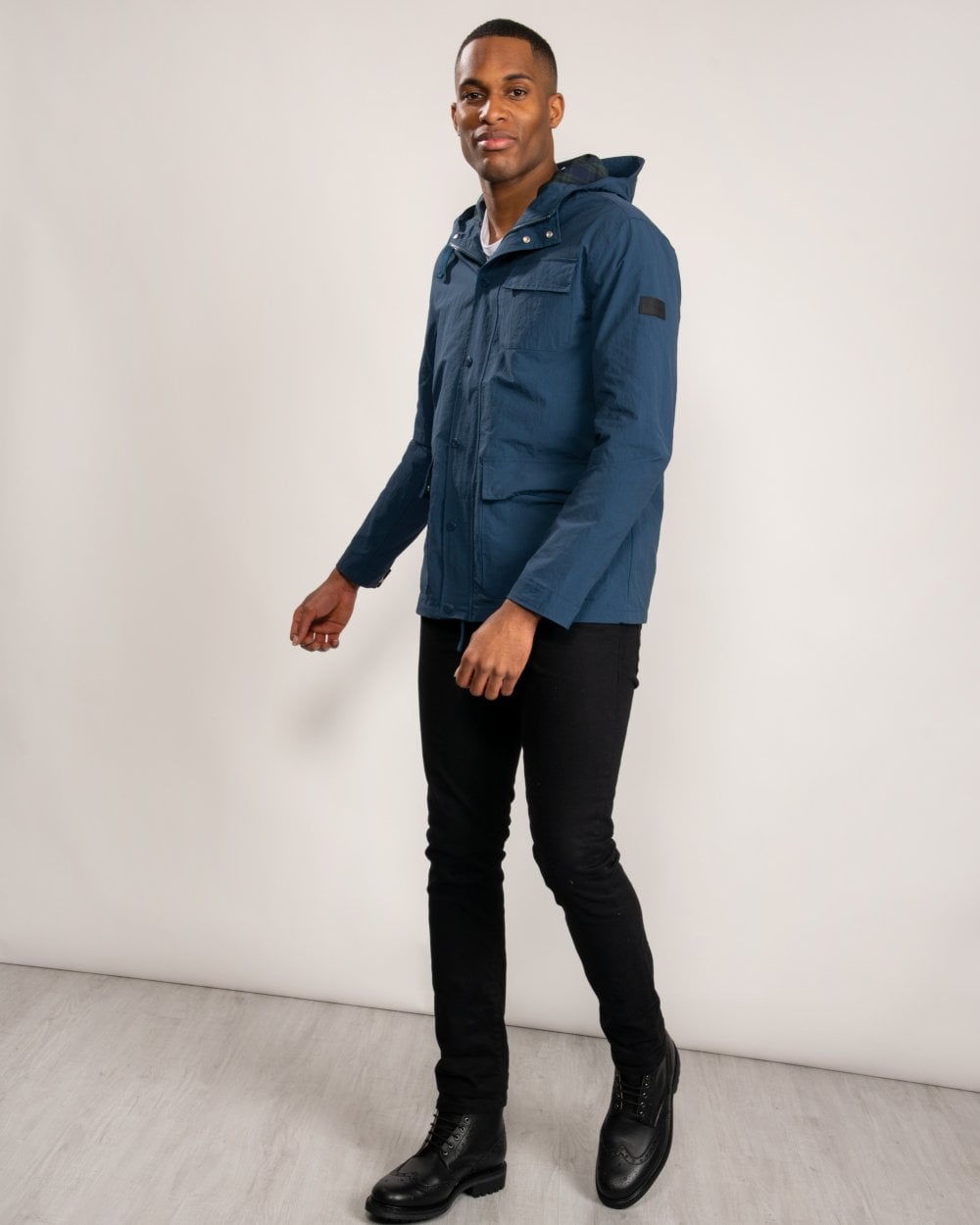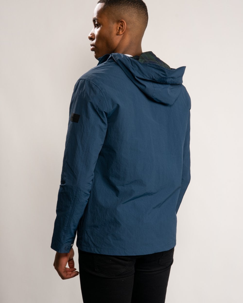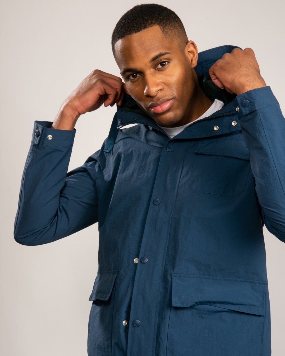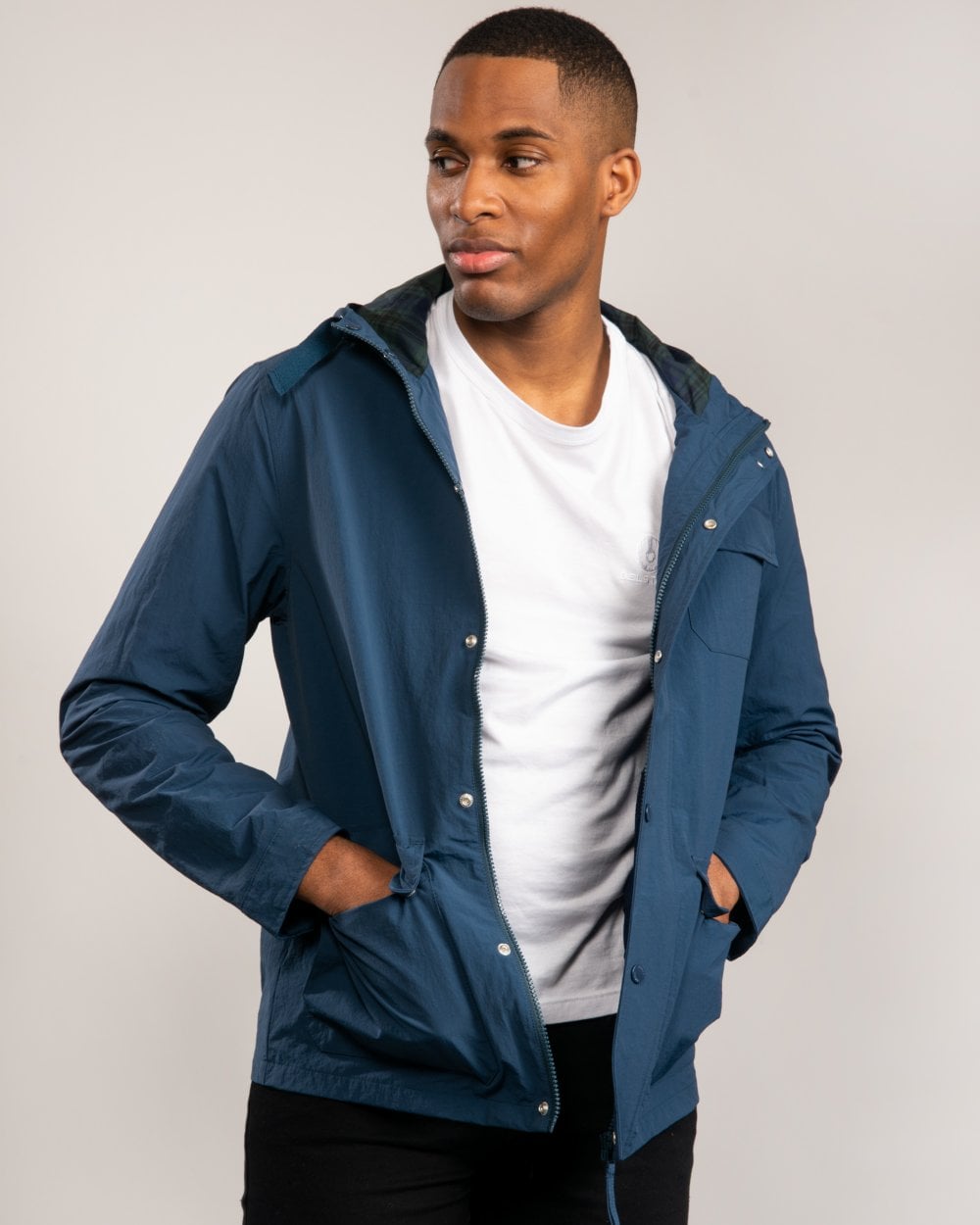 A lightweight, dual lined mid-season hooded anorak with a press-stud placket over the zip.